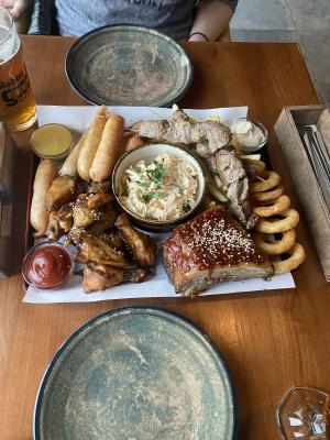- бургер "Рваный" (рваная свинина, салат коул-слоу, сыр сулугуни, лук фри, соус фирменный)