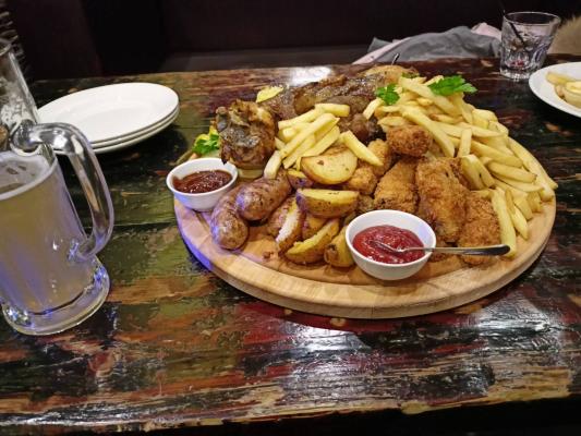 Состав: рулька свиная (800 г), ребрышки свиные (300 г), колбаски домашние на гриле (200 г), крылья BBQ (150 г), огурцы соленые (100 г), капуста квашеная (100 г), морковь пряная (100 г), дольки картофельные (100 г), картофель-фри (100 г), хрен, горчица