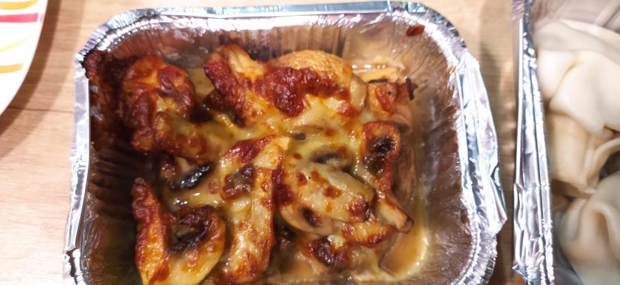 Шляпки шампиньонов, запеченные в печи на кеци с сыром сулугуни