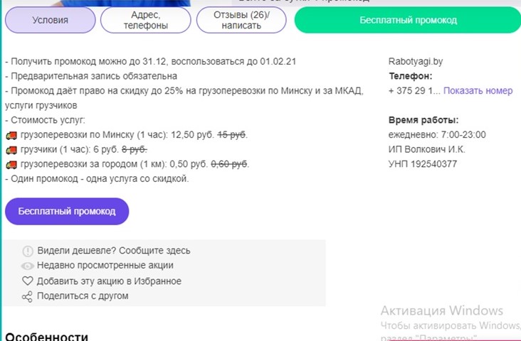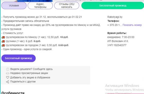 - Промокод даёт право на скидку до 25% на грузоперевозки по Минску и за МКАД, услуги грузчиков