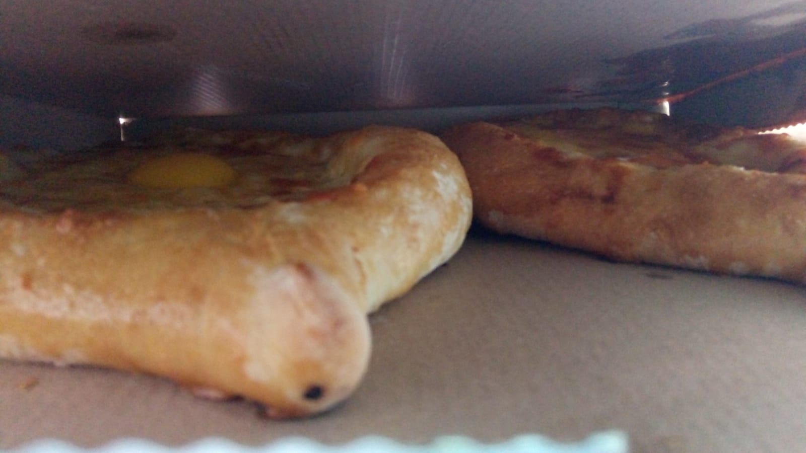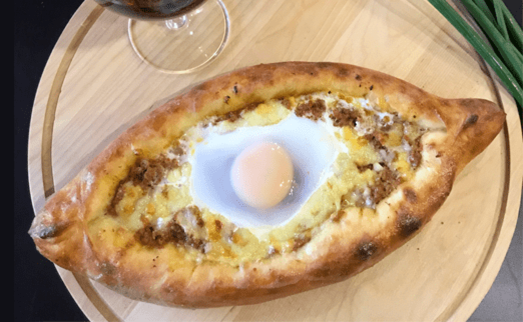 Хачапури в виде лодочки с сыром, говядиной, свежем перцем, помидором и куриным яйцом (420г)