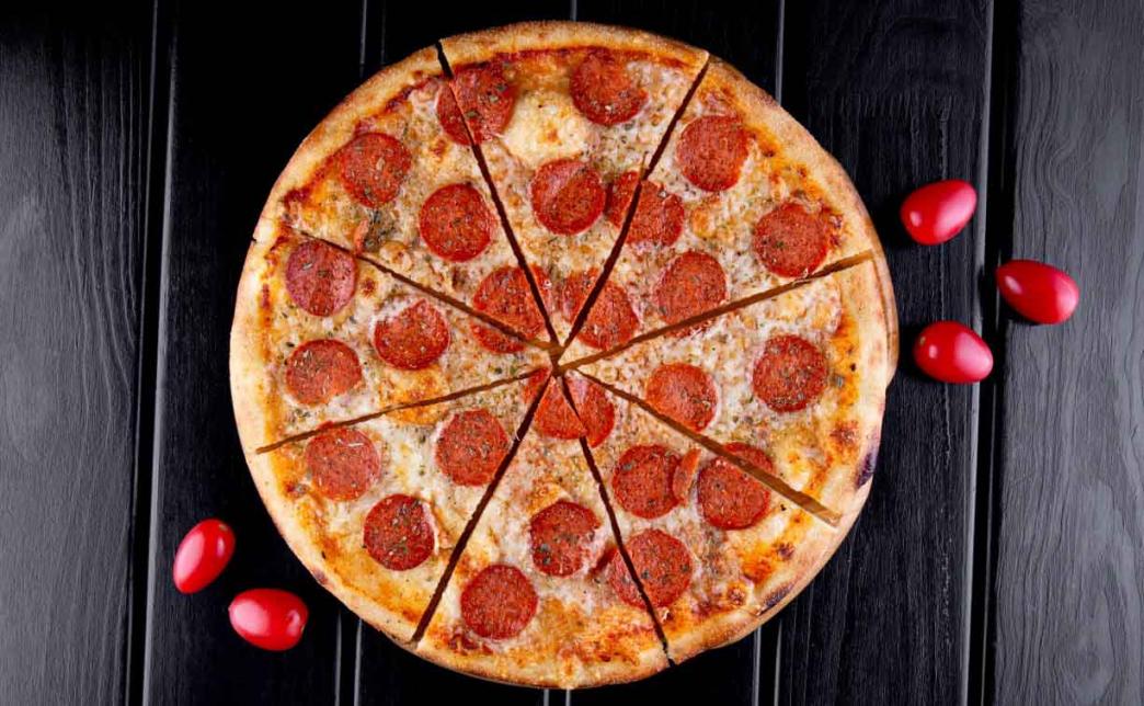Состав: сыр моцарелла, колбаски пепперони, пицца-соус, орегано