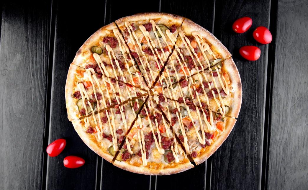 Состав: сыр моцарелла, куриное филе, грибы, колбаски охотничьи, м.огурец, лук репчатый, пицца-соус, соус барбекю