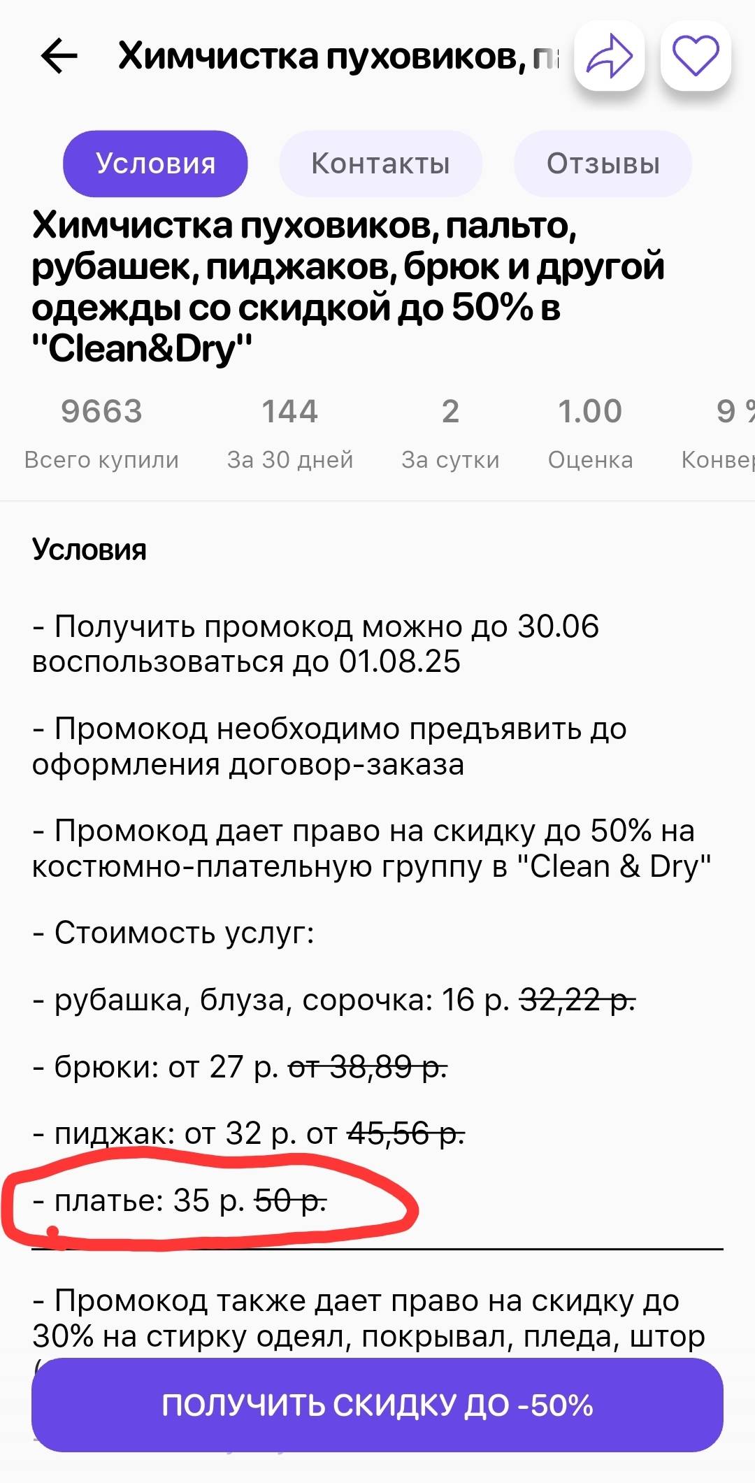 - Промокод дает право на скидку до 50% на костюмно-плательную группу в "Clean & Dry"