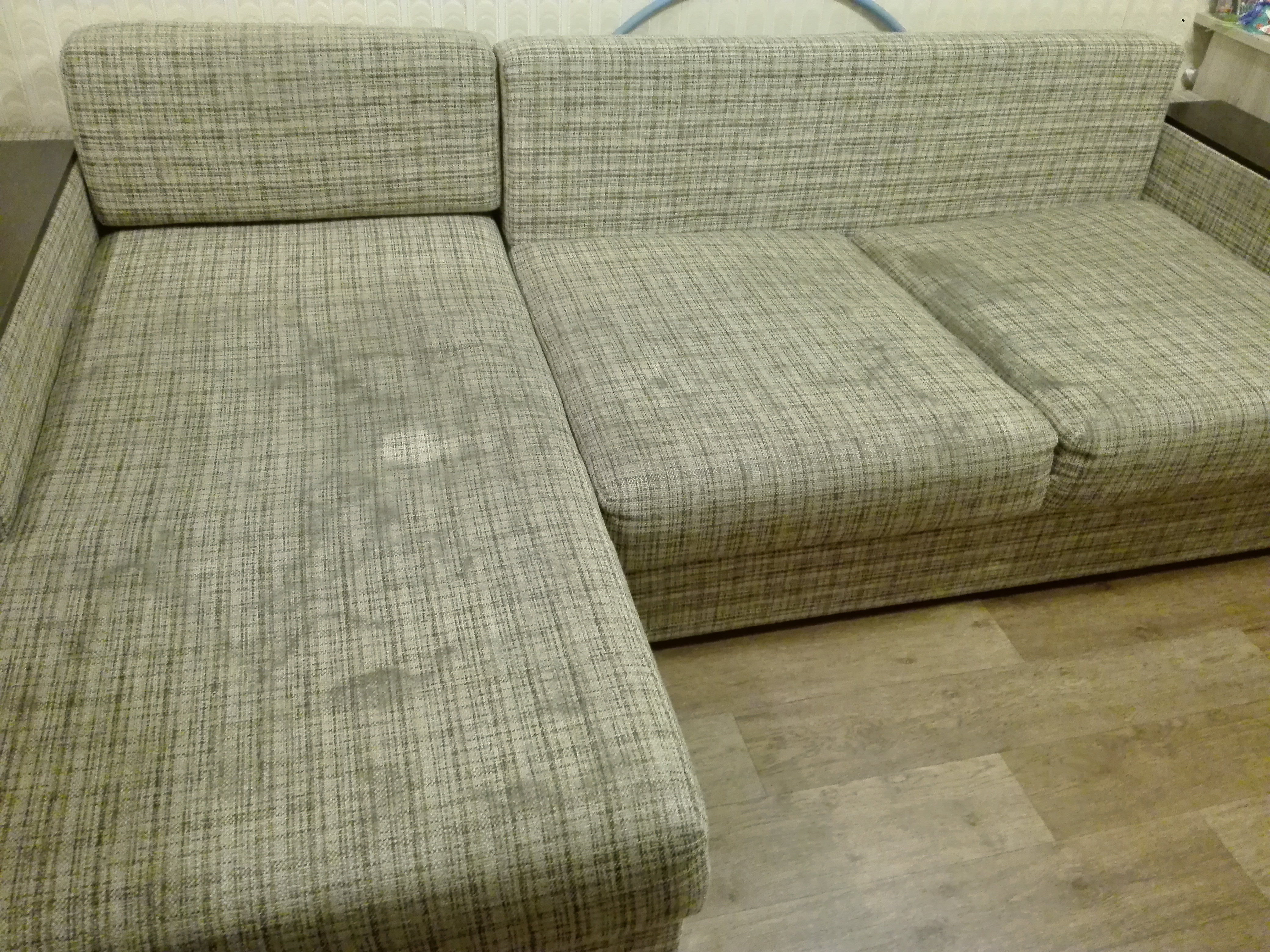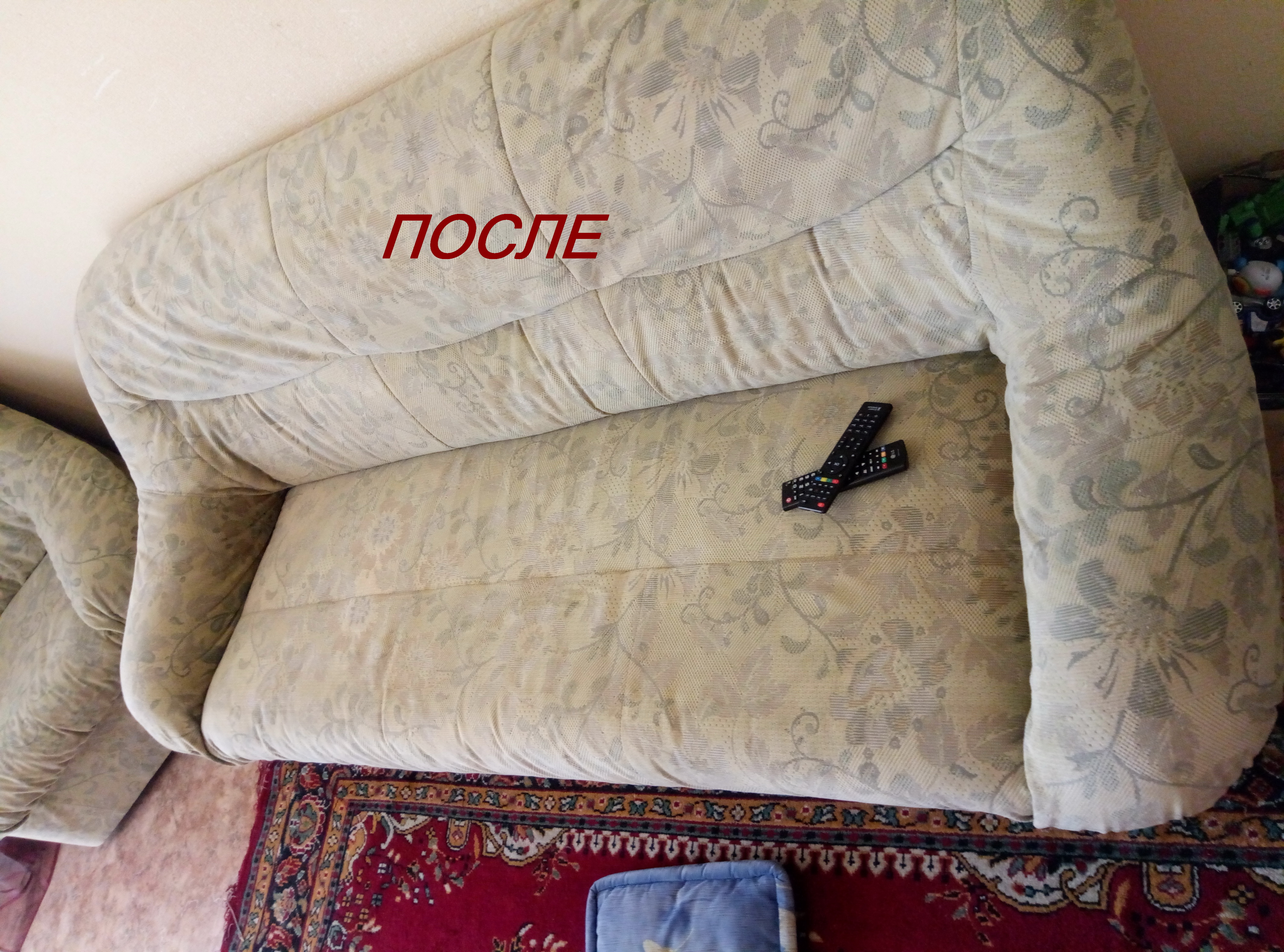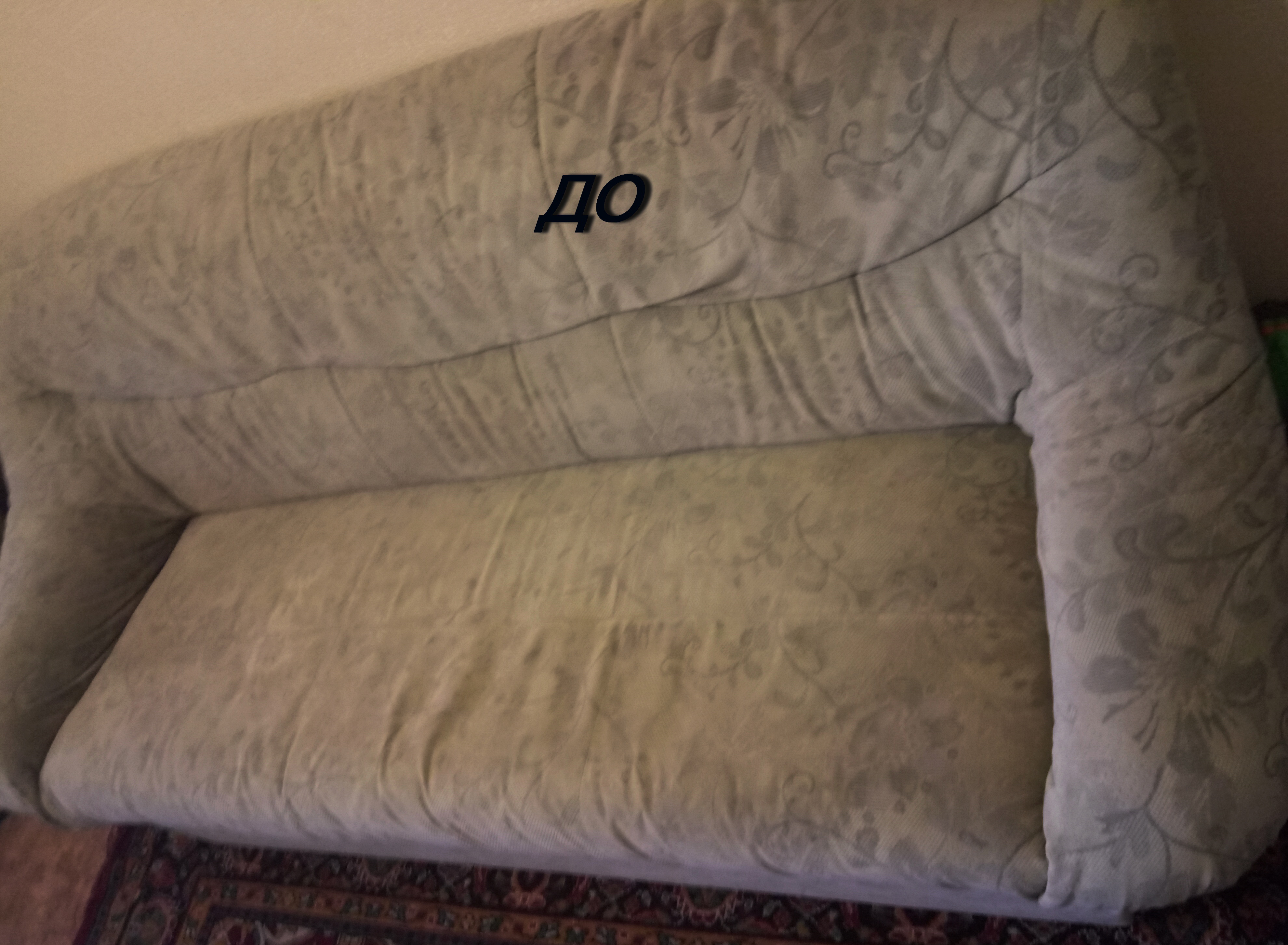 Так как квартира съёмная и мне сдали её уже с такой неопрятной мебелью - я даже не подозревала о родном цвете этой обивки. В итоге результат получился замечательным, пропали и другие мелкие пятна и разводы, а цвет поверхности приобрёл однородный светлый оттенок.