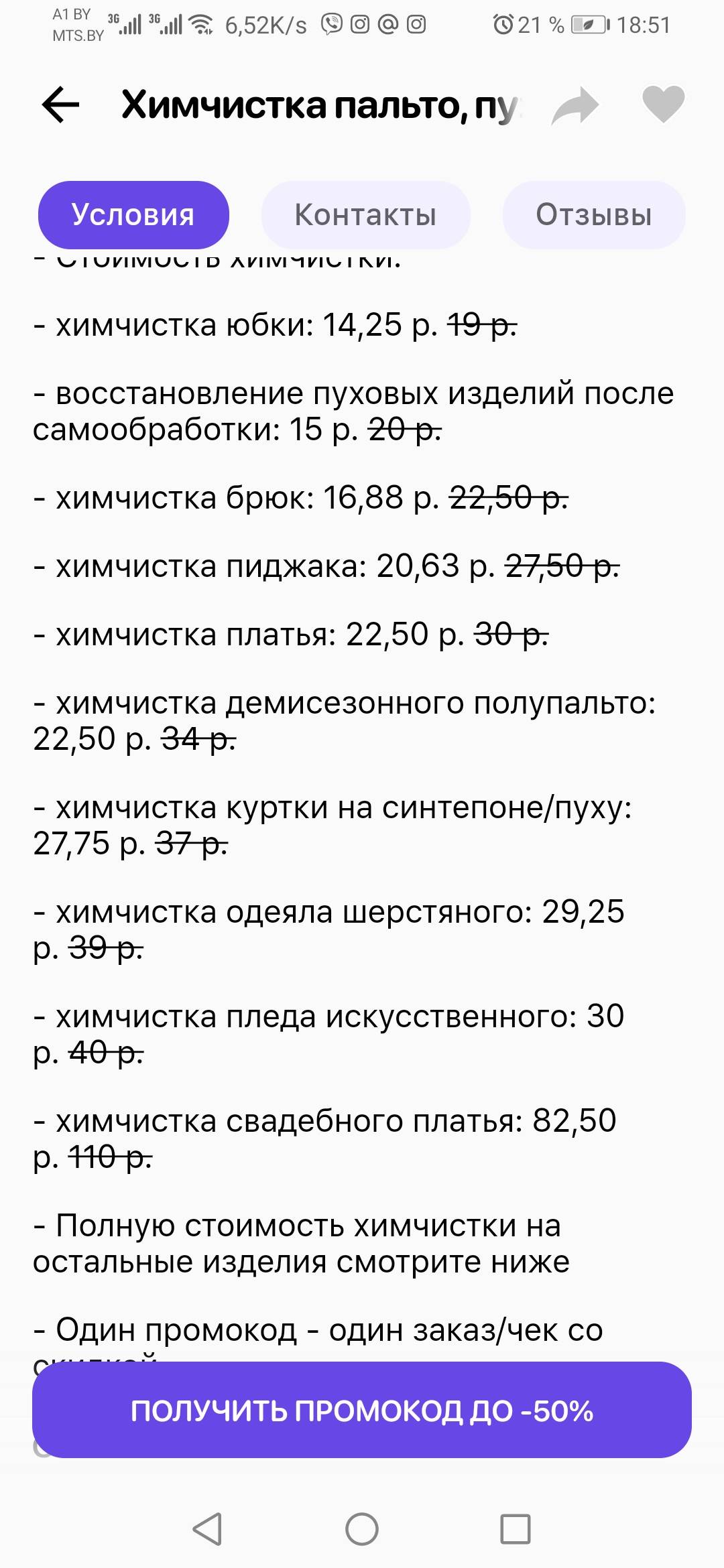 - Промокод дает право на скидку 50% на химчистку демисезонных пальто с наличием в составе шерсти менее 30%