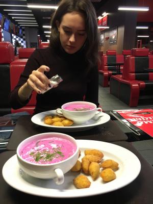 Холодник вкусный, даже очень, НО нас в ТЦ Глобо девушка не отпустила из-за стола, пока мы не заказали "хоть что-нибудь платное, хотя бы хлеб", якобы это одно из требований акции(хотя на сайте этого не указано). И мы были не против, но сказали нам это уже после того, как мы все благополучно доели и собирались уходить...