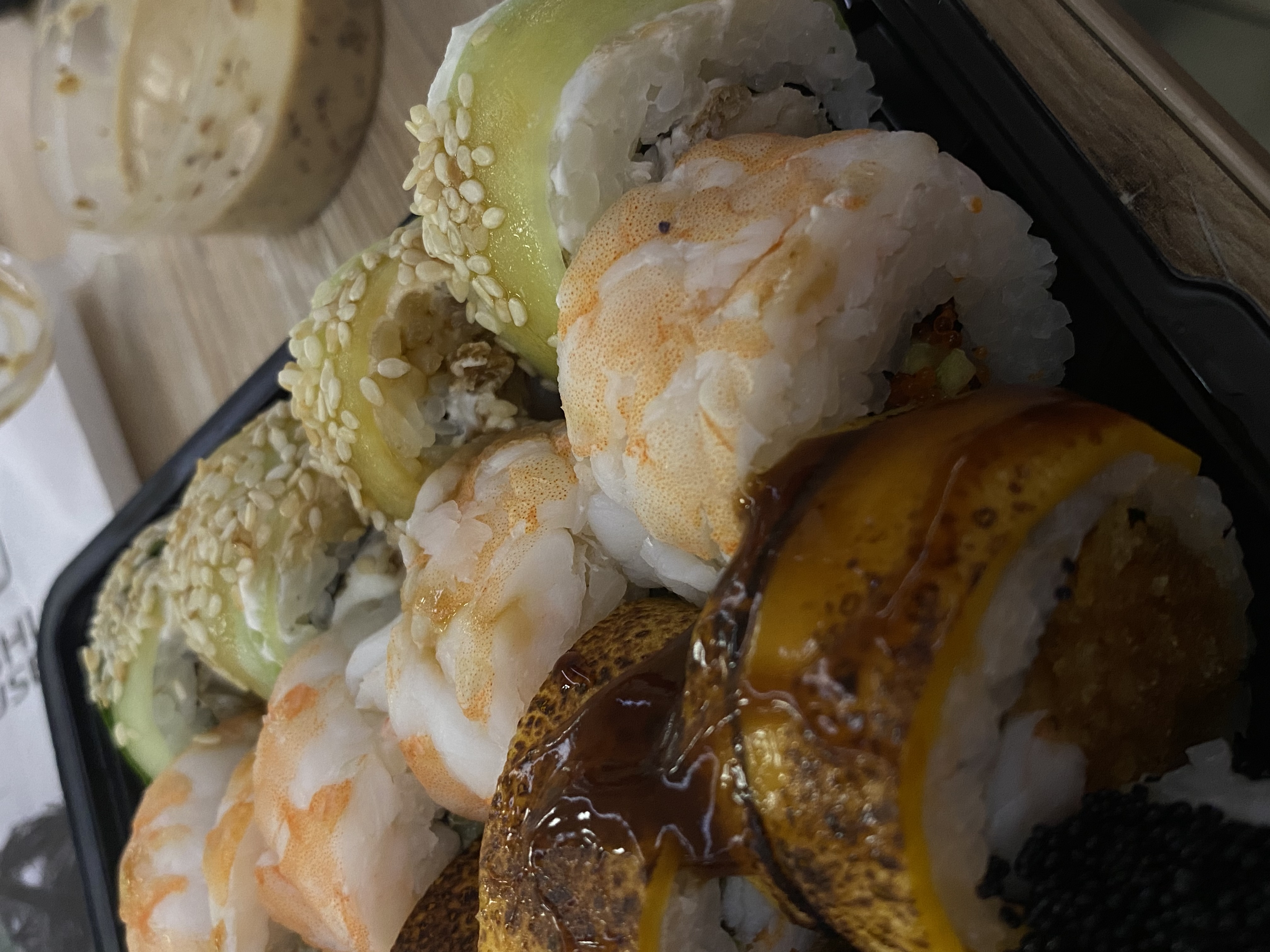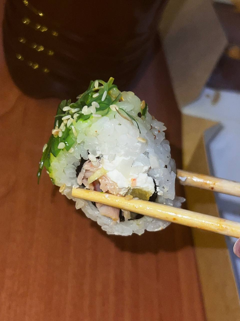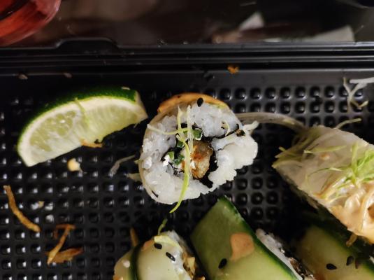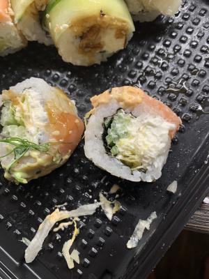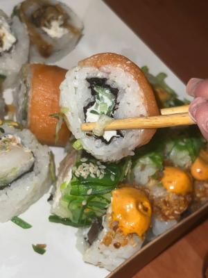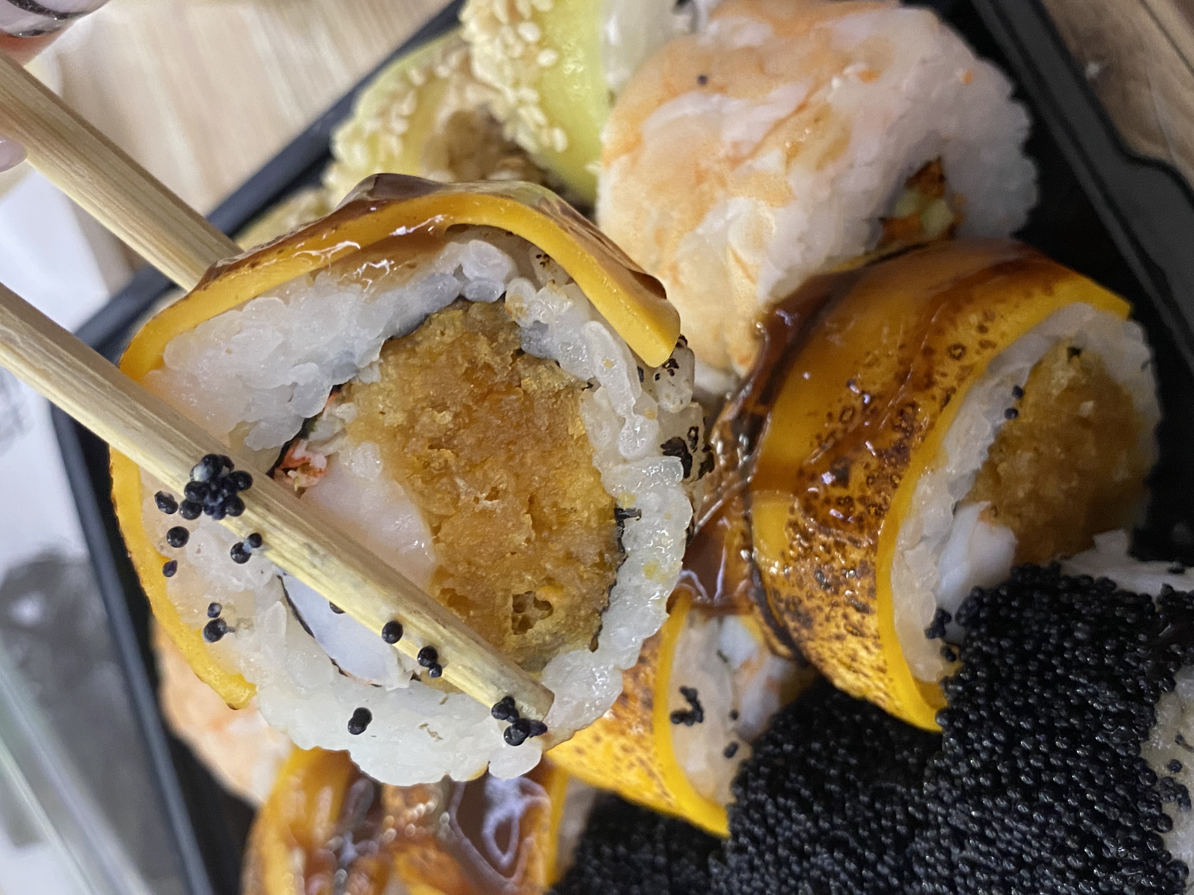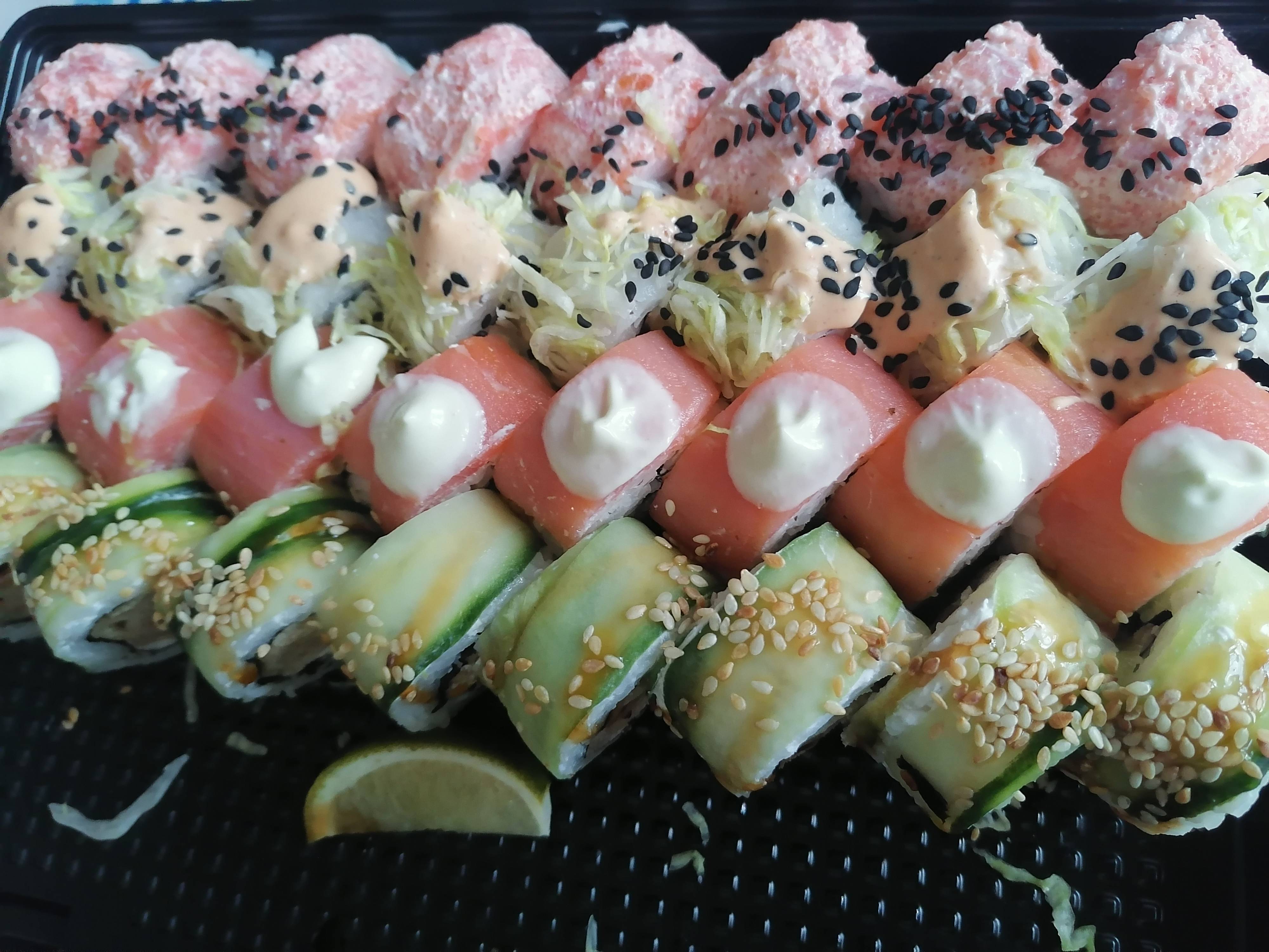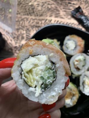 Состав: лосось, огурец, сливочный сыр, соус спайси, кунжут кимчи, соус терияки, кляр, сухари панко