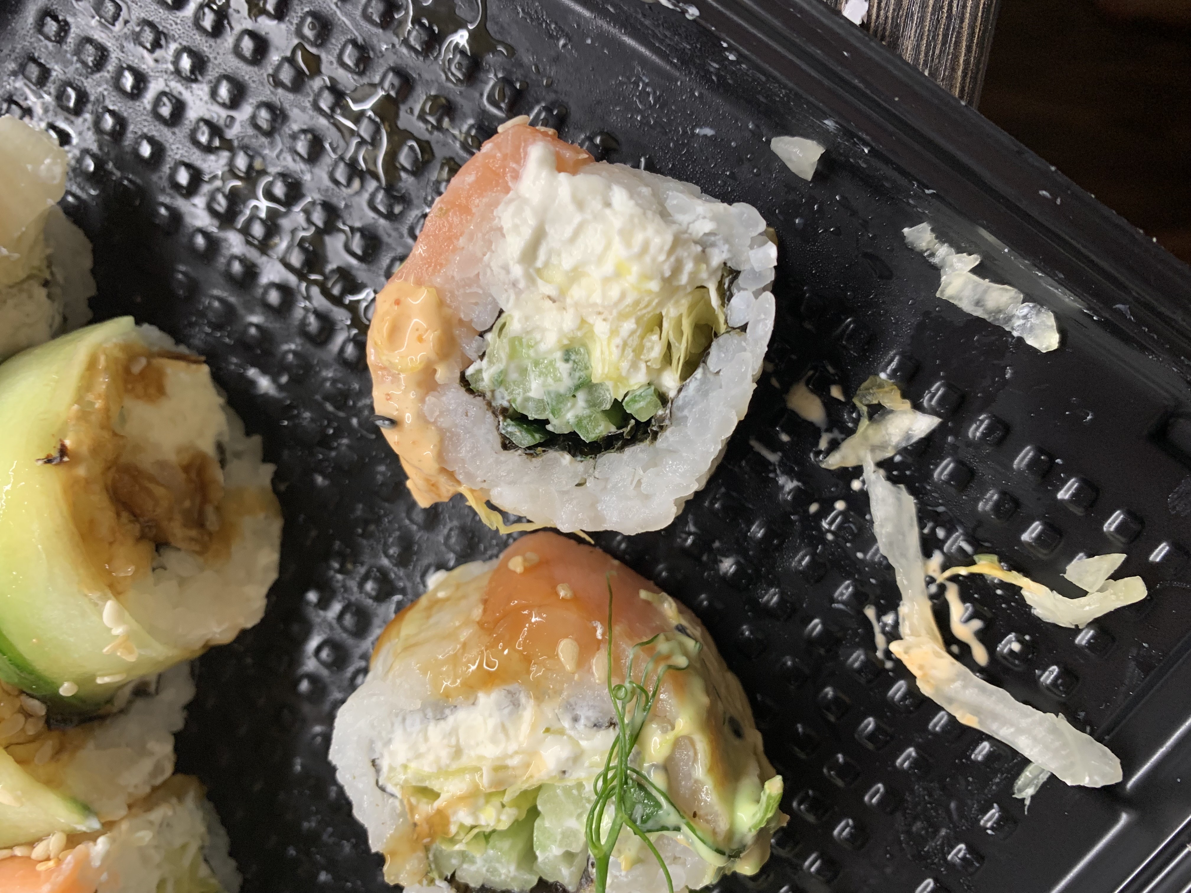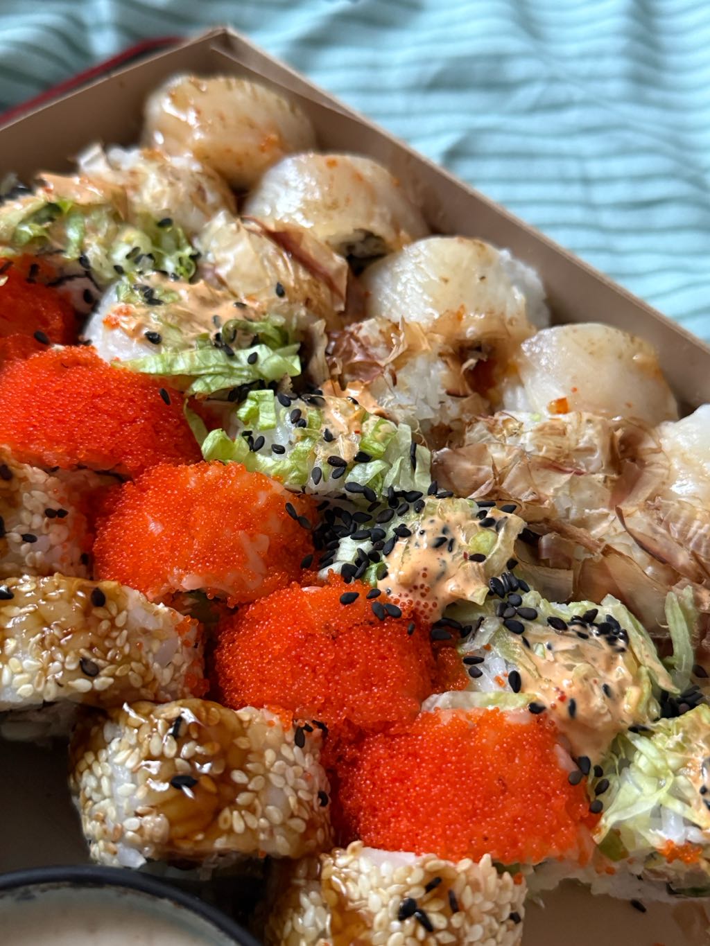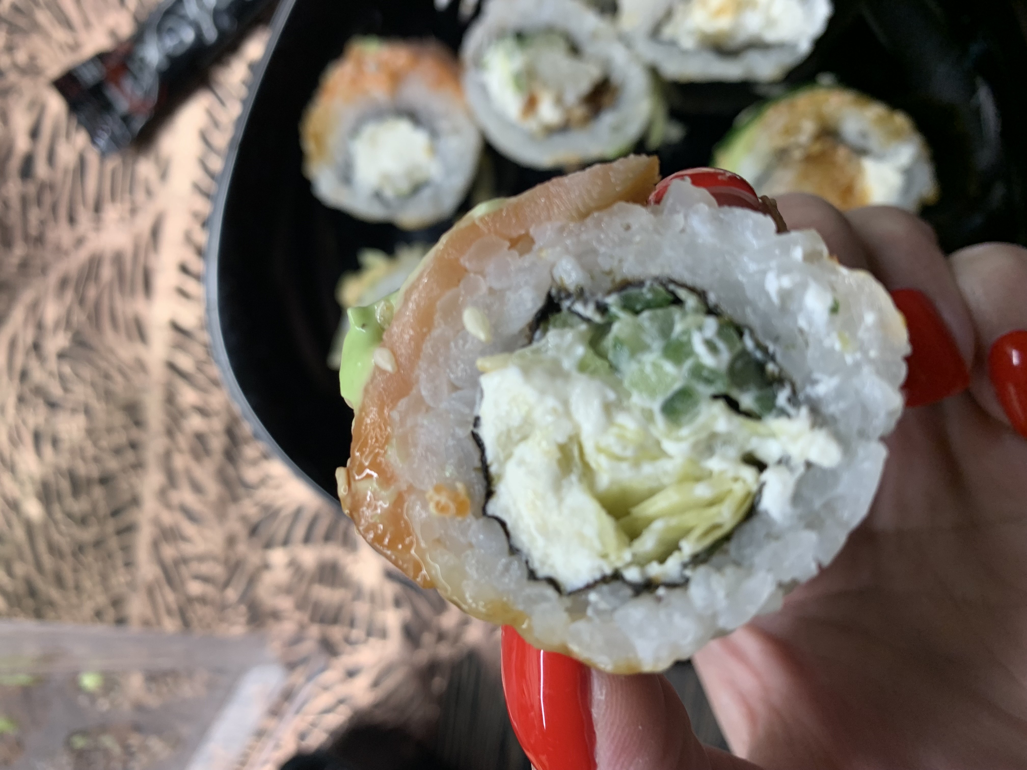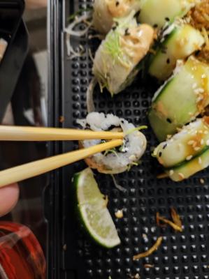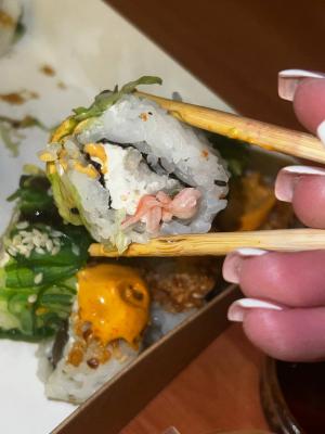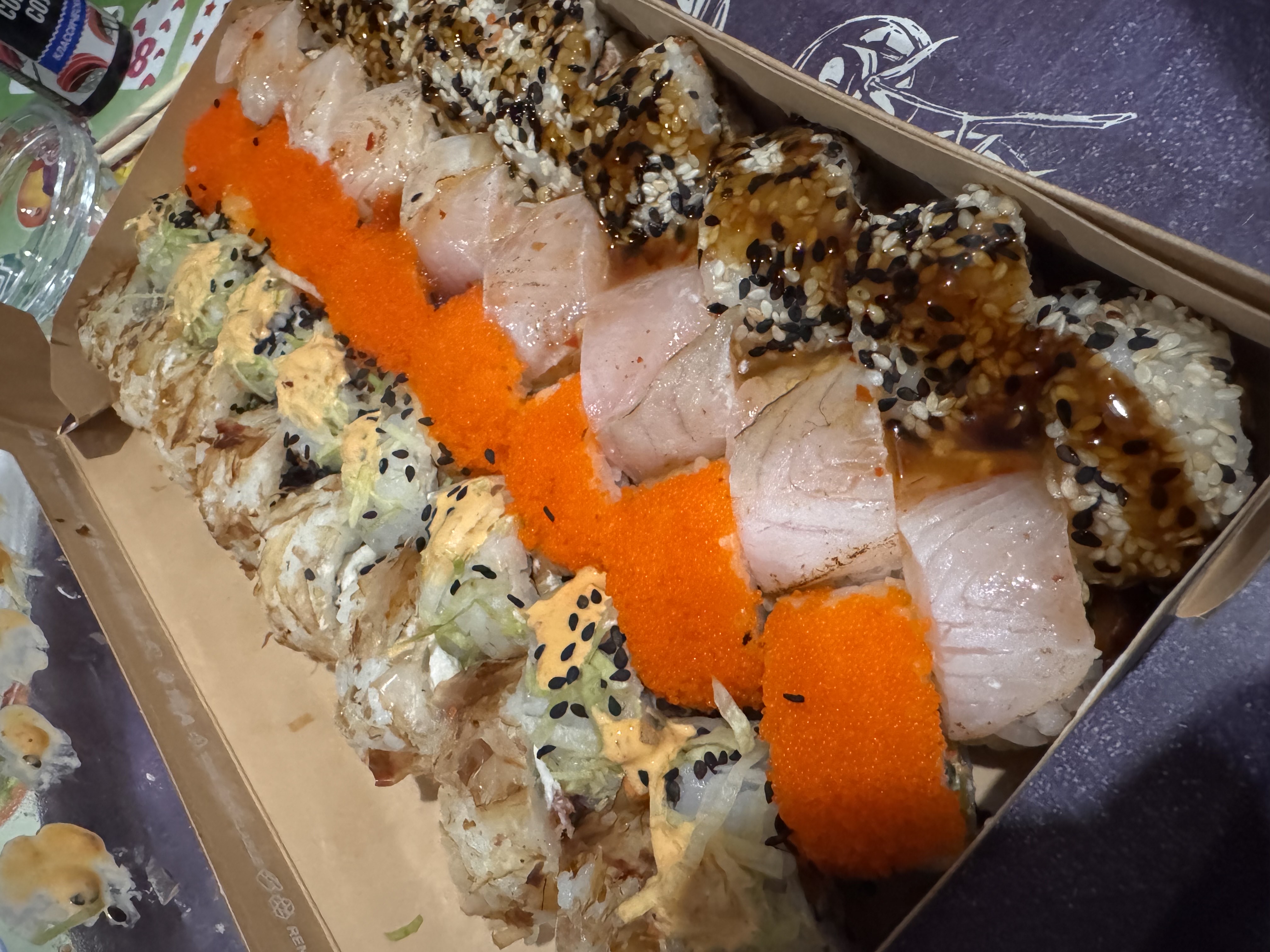 Состав: лосось, огурец, сливочный сыр, соус спайси, кунжут кимчи, соус терияки, кляр, сухари панко