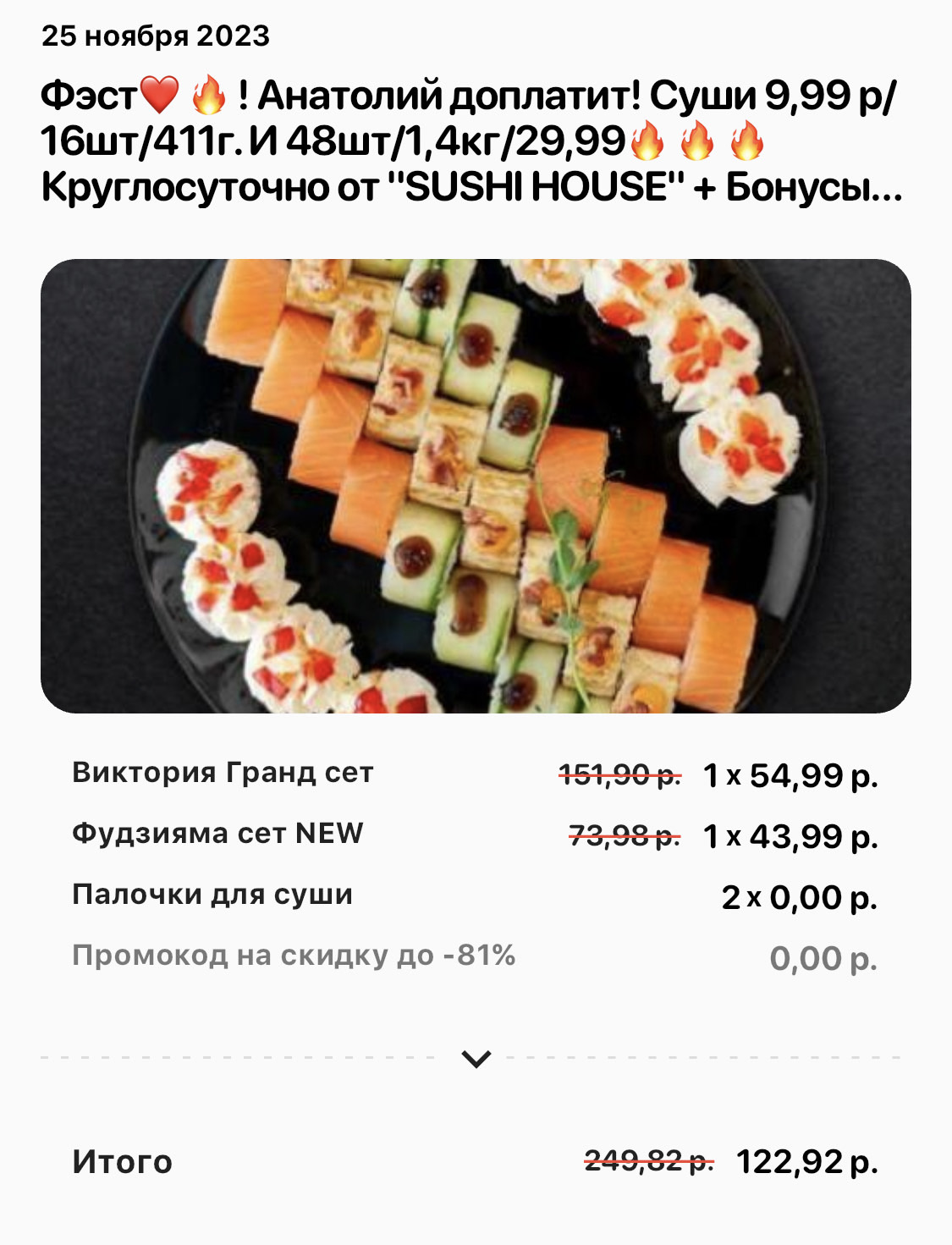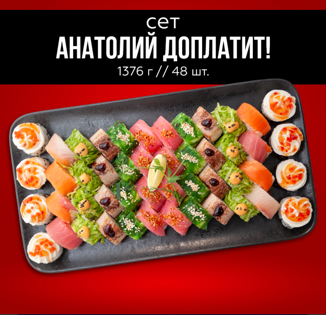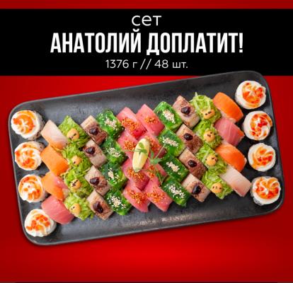 - Промокод дает право на скидку до 59% на сет "Анатолий доплатит" от "SUSHI HOUSE"