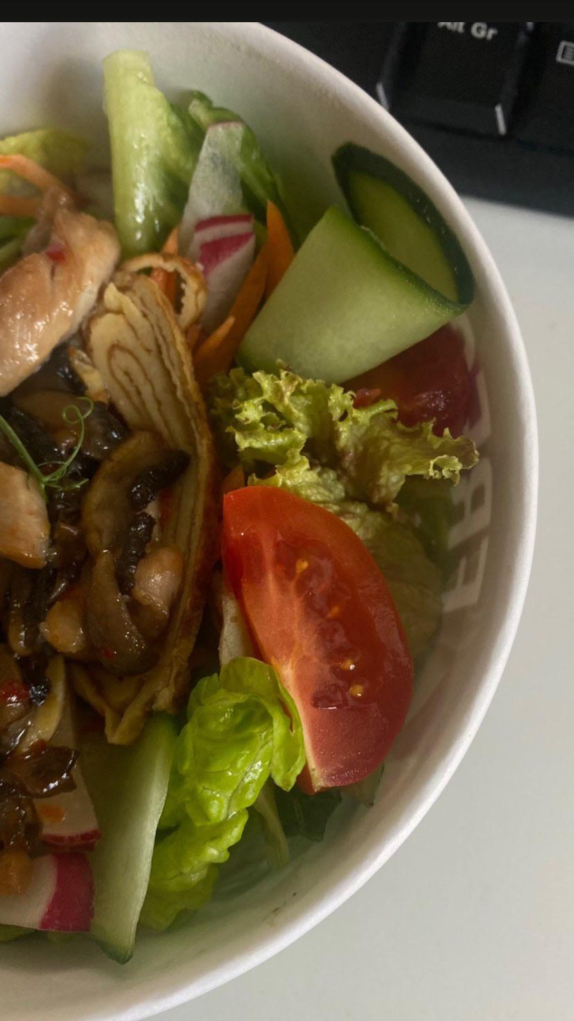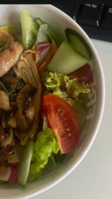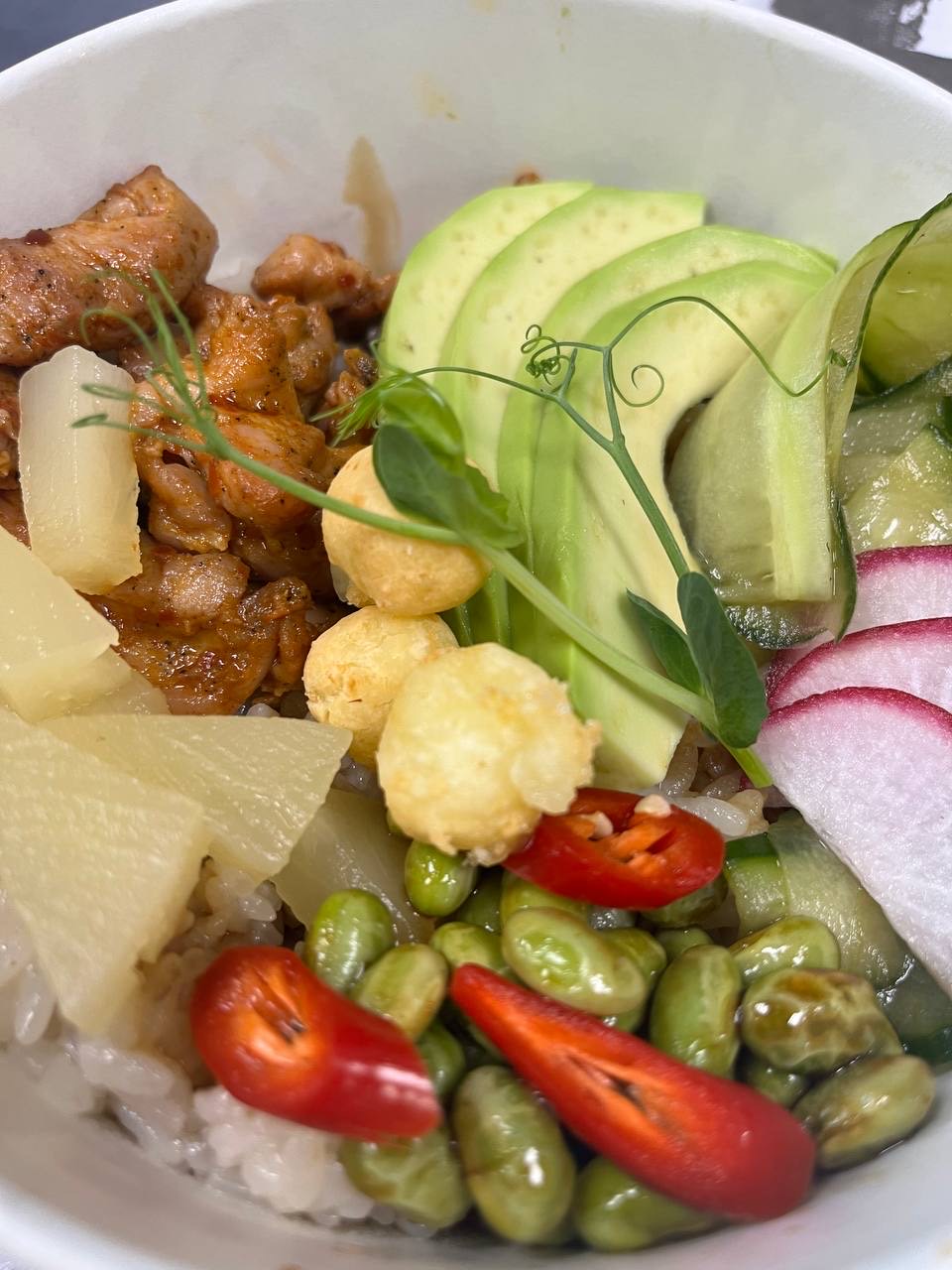 Состав: курица, цукини, лук красный, морковь, перец болгарский, масло чесночное, бобы эдомаме, рис, бульон вок, соус вок, соевые ростки, кунжут