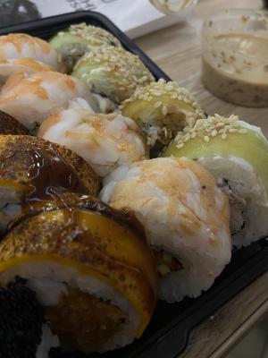 Состав: японский омлет, рис, нори, соус Унаги, кунжут белый