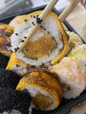 Состав: сунец, авокадо, сливочный сыр, кунжутное масло, картофель пай, соус терияки, кляр, сухари панко