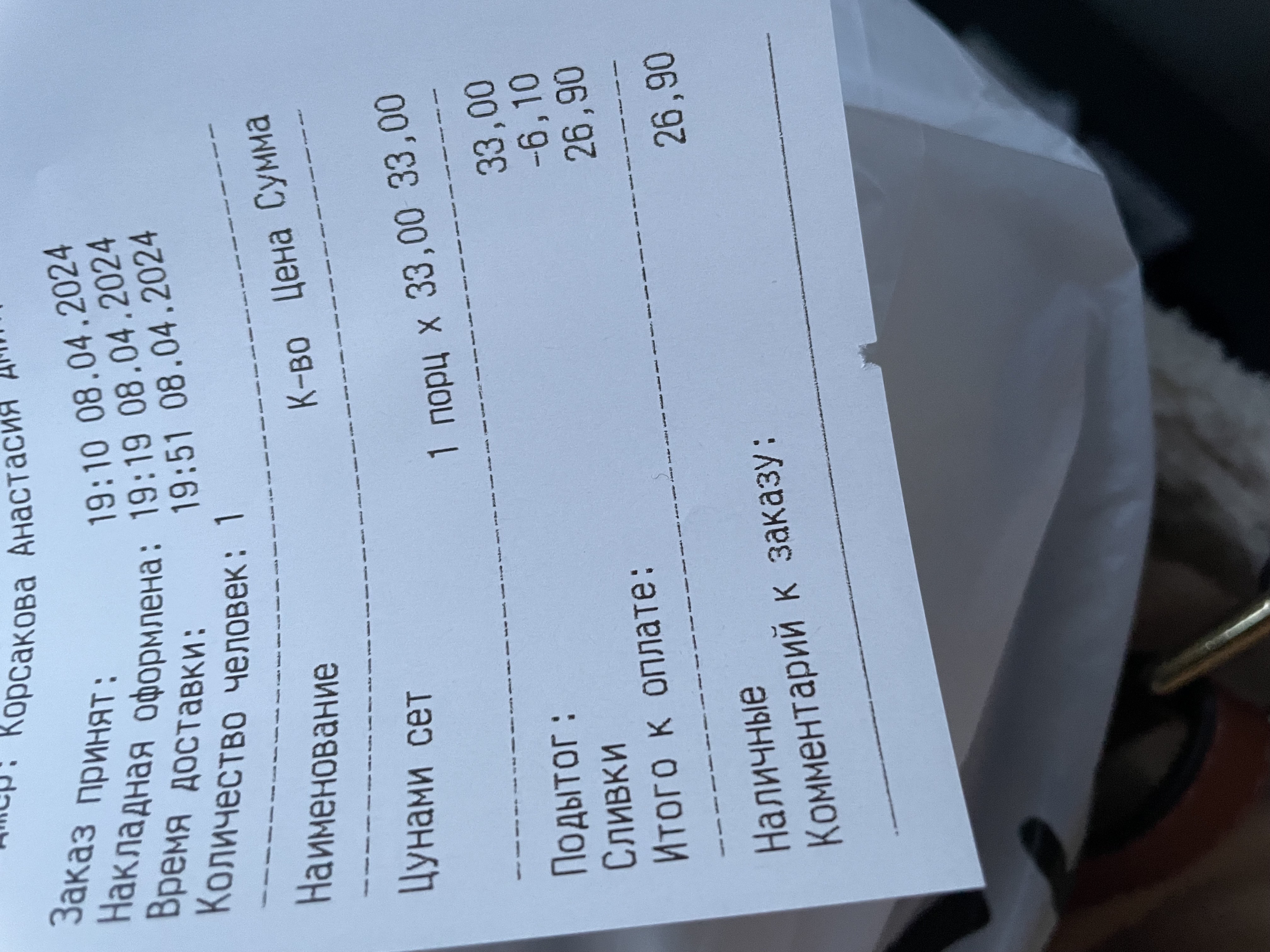 Второй заказ делала заранее к определенному времени и прописала, что нужны палочки (привезли на час раньше), курьер вежливый и во второй раз написала про палочки и снова на огромный сет ни одного комплекта палочек и ни одной салфетки (на вопрос почему не положили-просто проигнорировали)