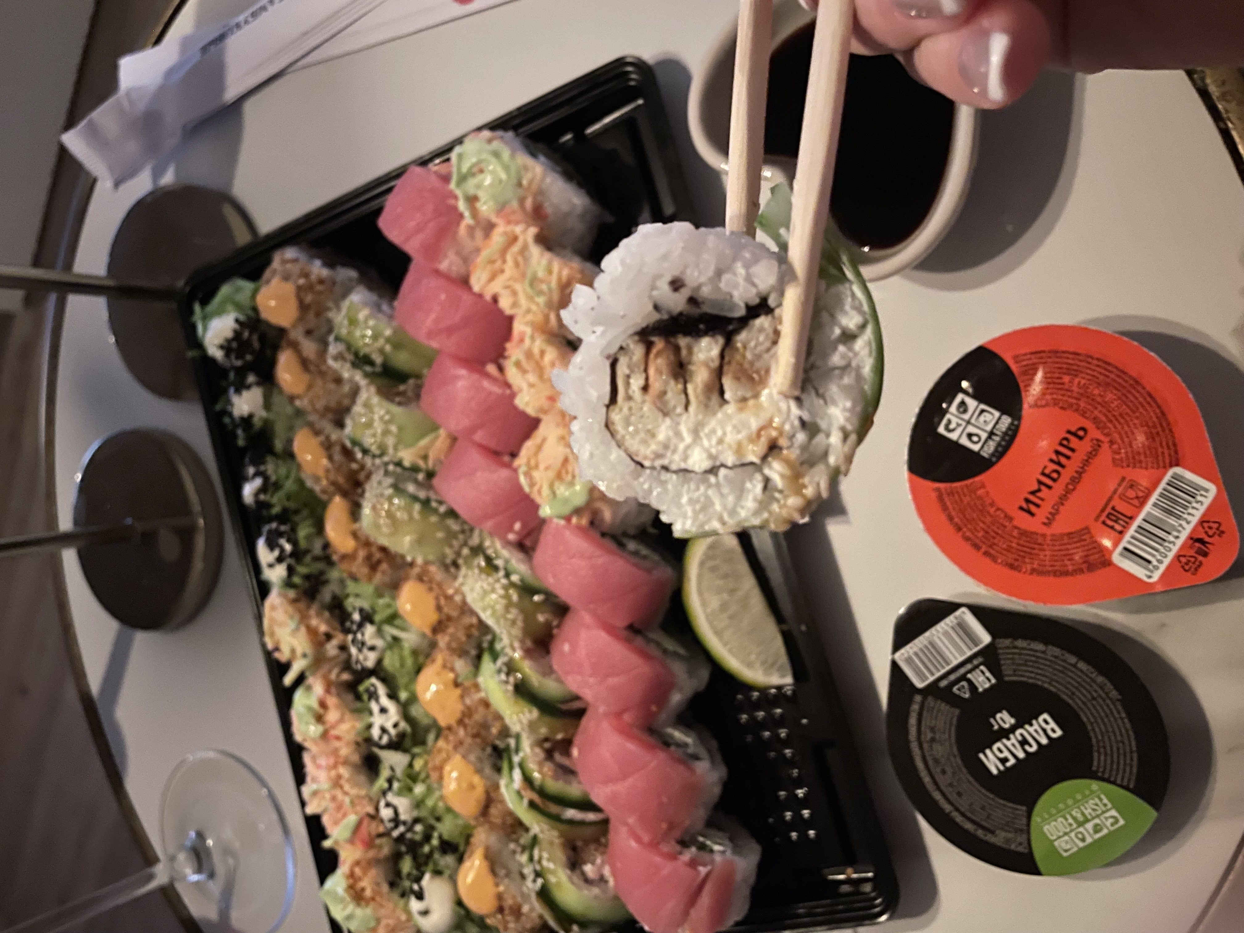 Заказали сегодня впервые (вывоз по ул. Налибокская, 1) До этого брали другую доставку, а тут захотелось чего-то новенького. В который раз убеждаюсь, что не нужно изменять старым традициям. Взяли сет Кинг. Пресный рис, небольшие по размеру, странное сочетание ингредиентов в роллах. Например крабовая палочка, мидия и зеленый лук ну как-то такое себе…короче далеко не в восторге. Не советую заказывать