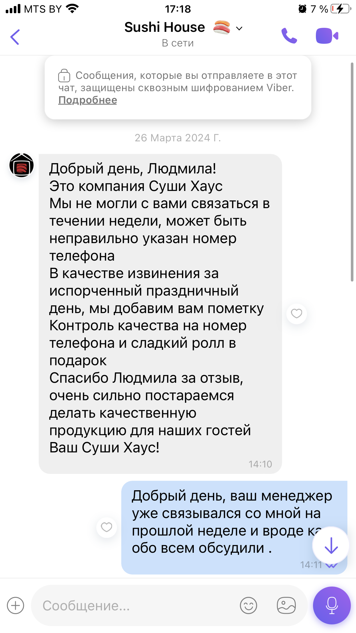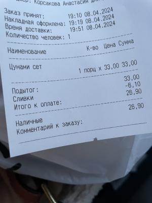 Вежливый курьер, вежливый оператор. Обслуживание хорошее. Но суши совсем не понравились, к сожалению