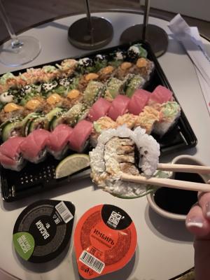 Ну что ж, оставлю свой честный отзыв, как человека который любит роллы и пробует в разных местах. Всегда понимаю, что по такой цене ничего нормального ждать не стоит. Так и случилось с жим сетом) Заказали с дочкой затестить и разочаровались. Казалось бы красочный, аппетитный сет, но есть одно большое но😂 Рыбы там нет! Точнее есть 5 кусочков тунца сверху на 4 роллах. А в остальных наполнение сыр, яблоки, огурцы. Икра красная кстати - деловая имитация за 3 рубля от Санта Бремор. Ну что еще можно было ожидать от сета за 43 р. Ну хоть не тухлое приехало и за это спасибо))) Но красная цена этому сету 30 р - учитывая что там один рис с сыром и другими недорогими ингредиентами. Рис кстати не заправлен вообще, просто пресный рис, без рисового уксуса, сахара и соли. Вообщем баланса вкуса нет. Просто поели, но не кайфанули. Каждому свое конечно, но я как ценитель вкусных суши и роллов знаю о чем говорю. Всем удачи
