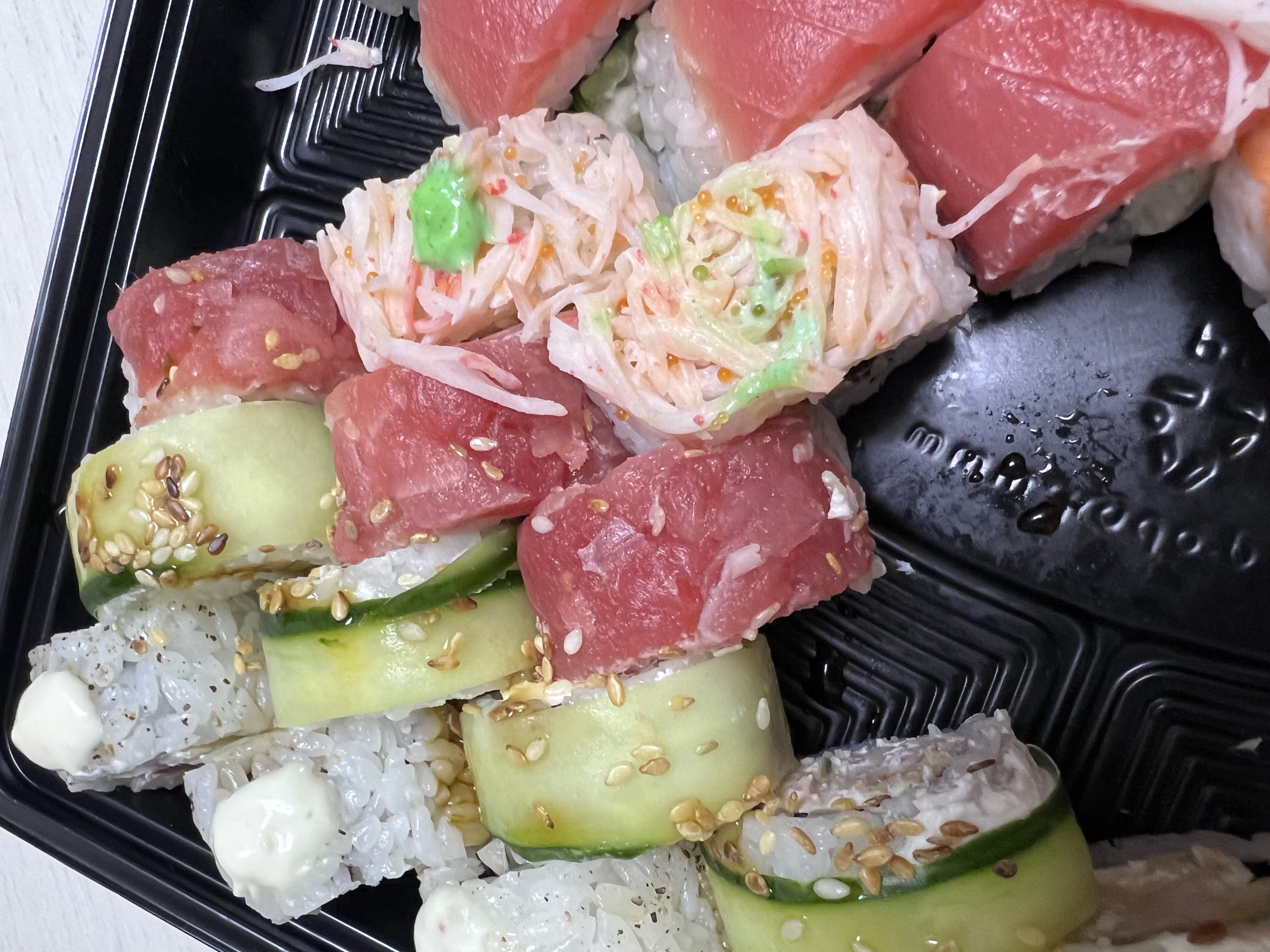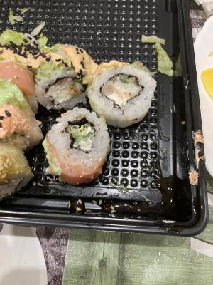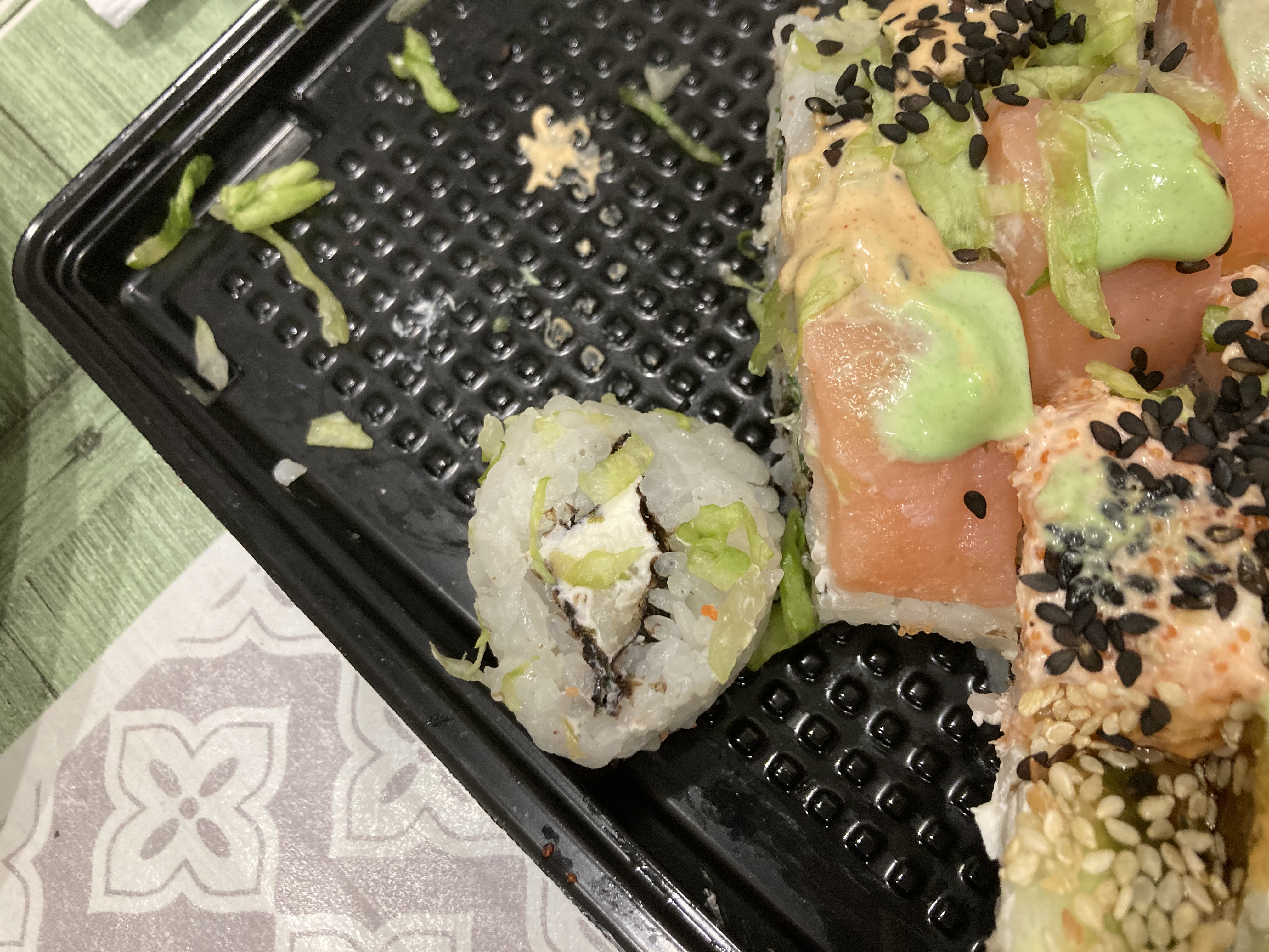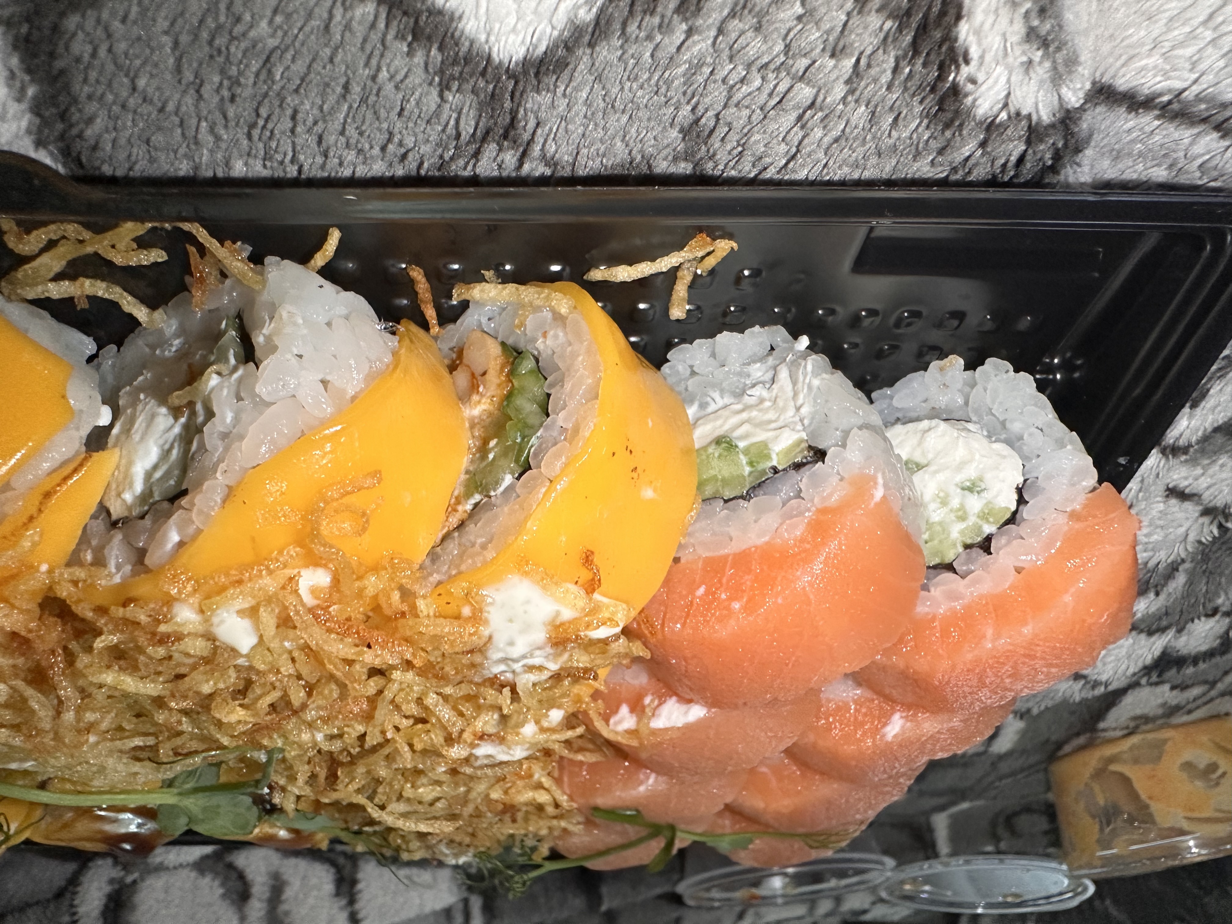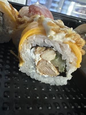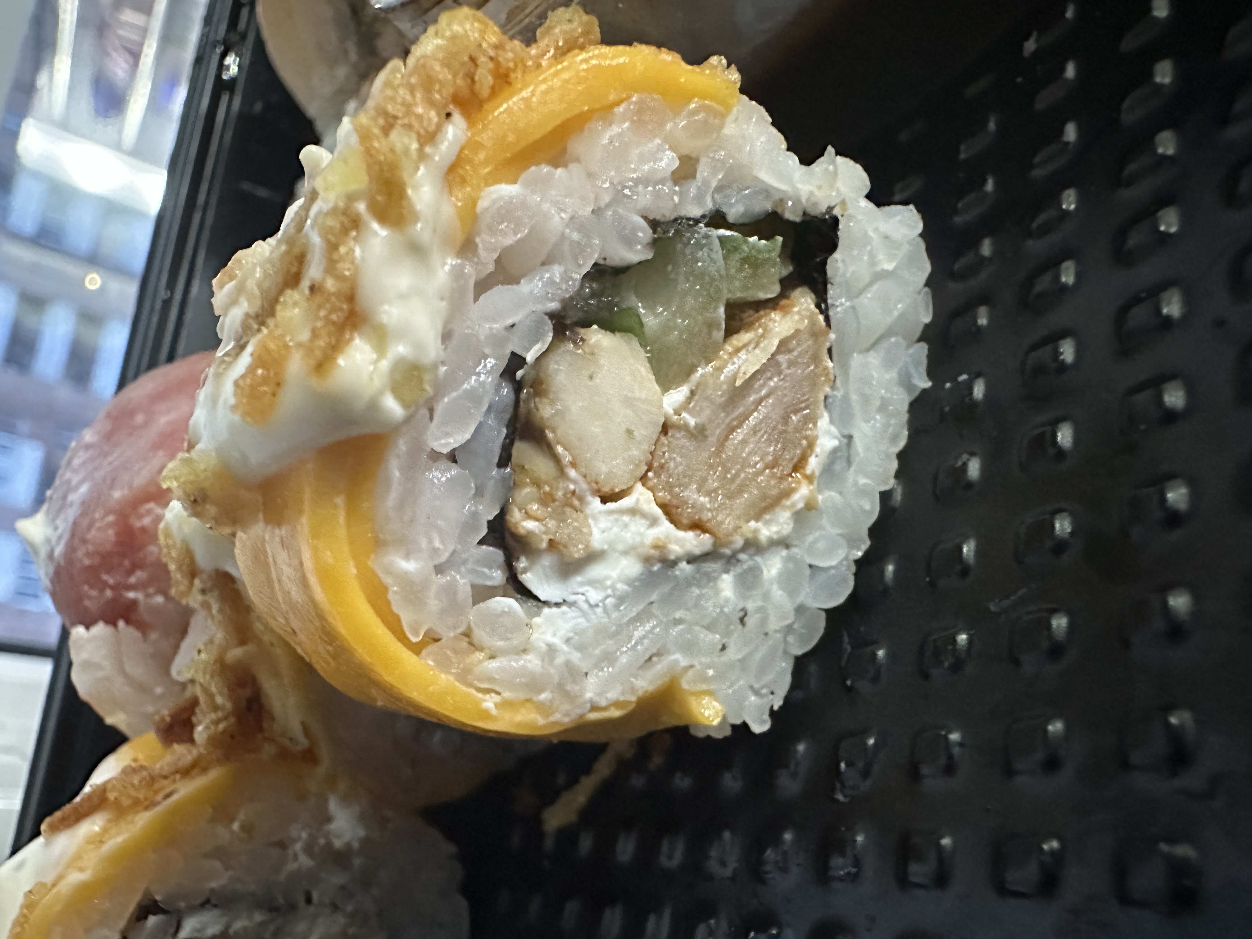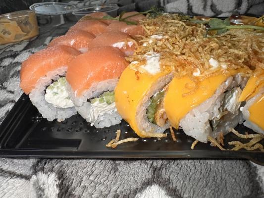 Состав: лосось, огурец, сливочный сыр, соус спайси, кунжут кимчи, соус терияки, кляр, сухари панко