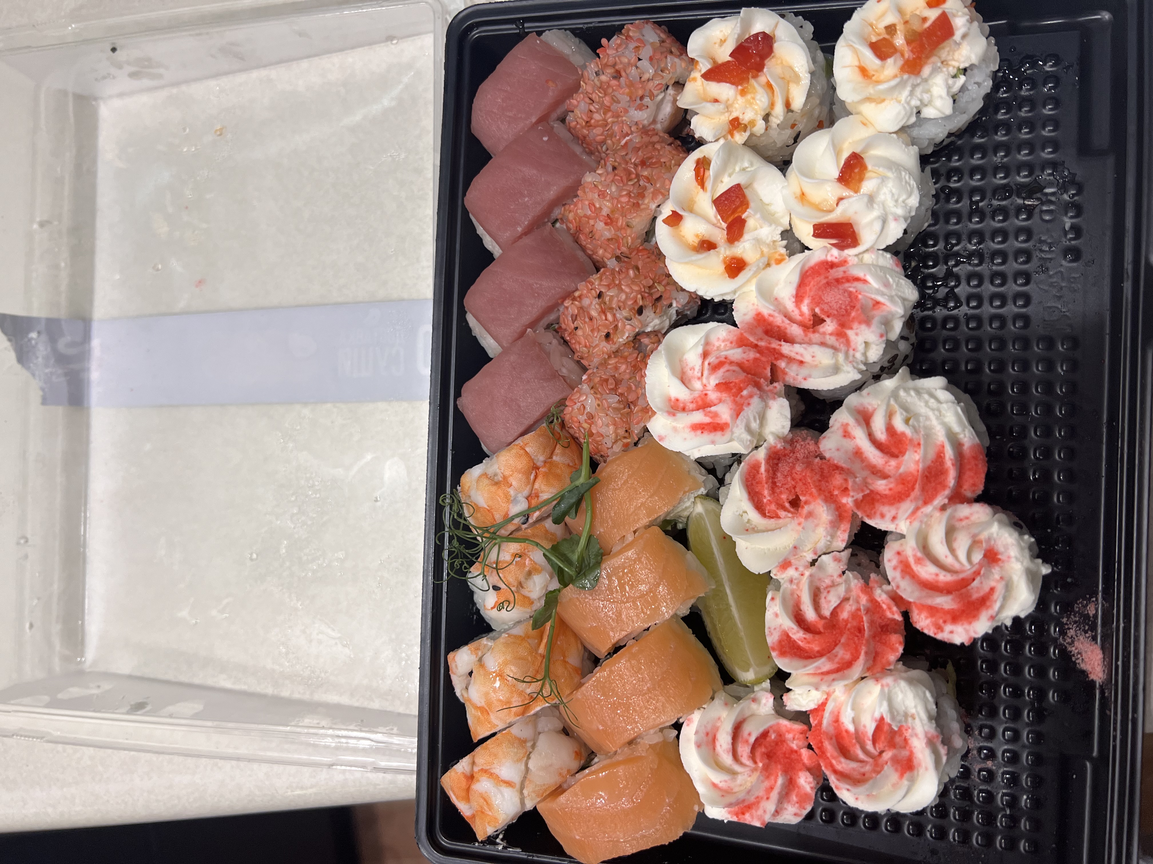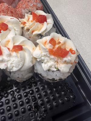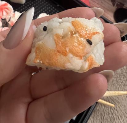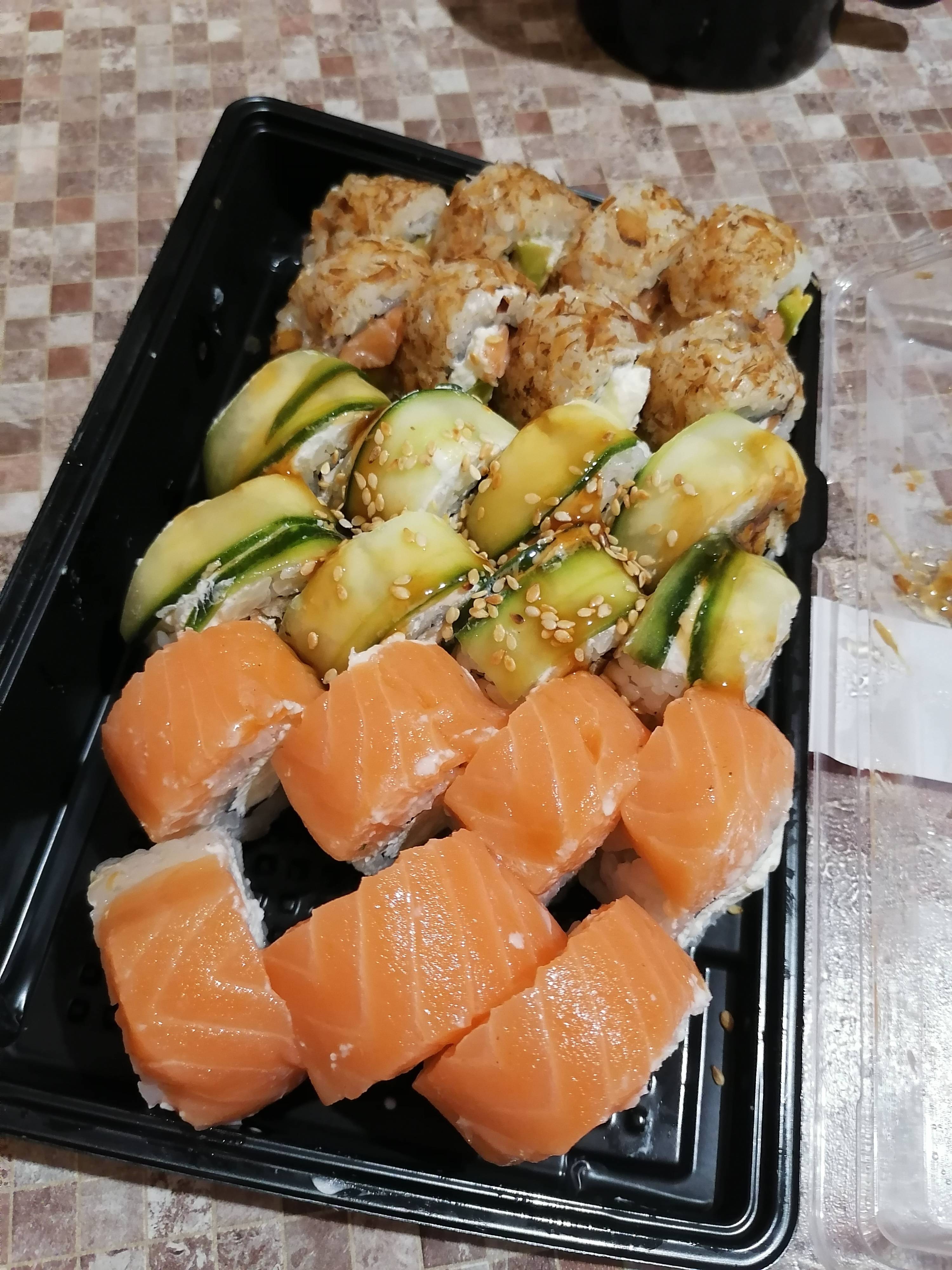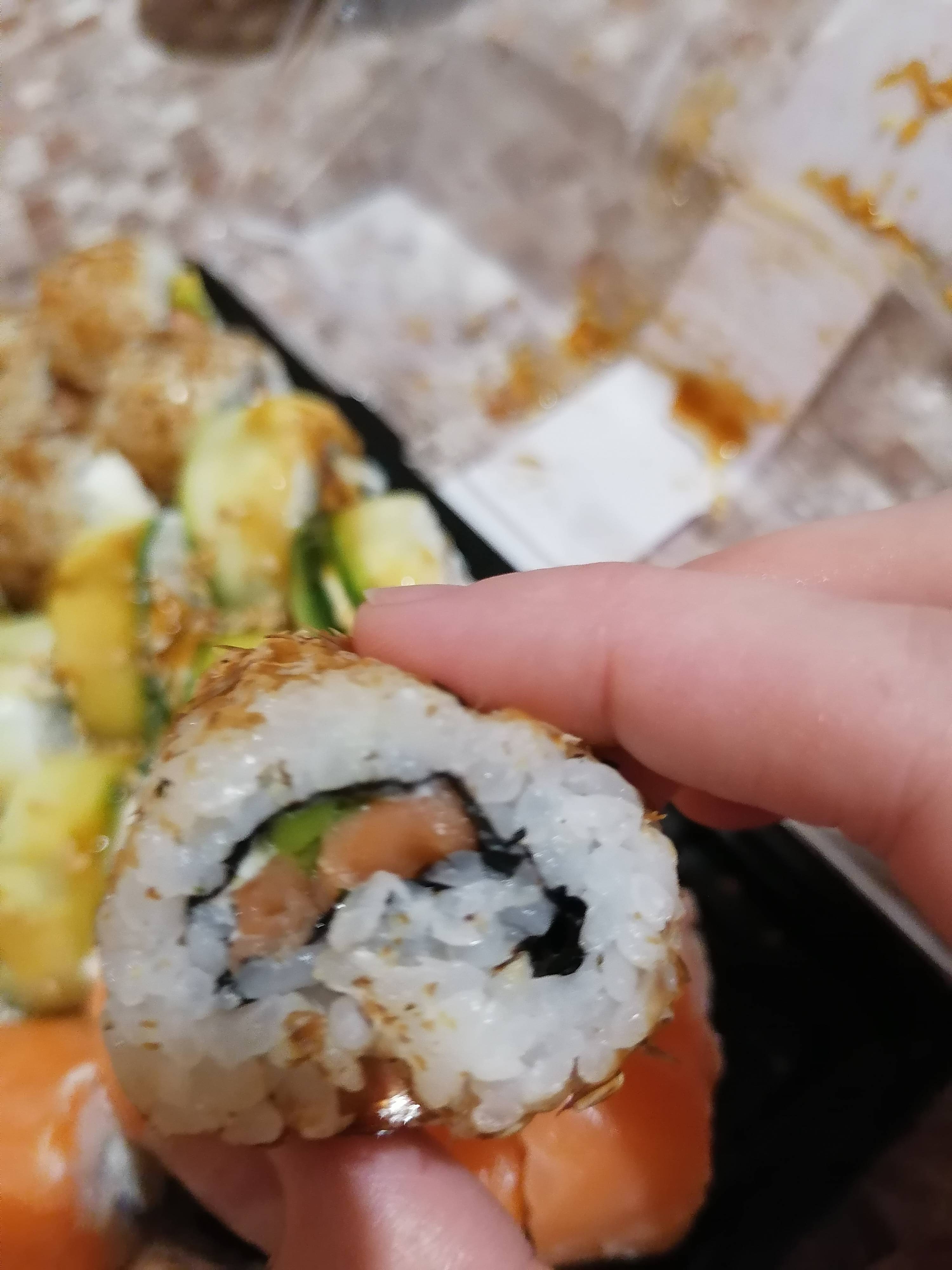 Состав: лосось, огурец, сливочный сыр, соус спайси, кунжут кимчи, соус терияки, кляр, сухари панко