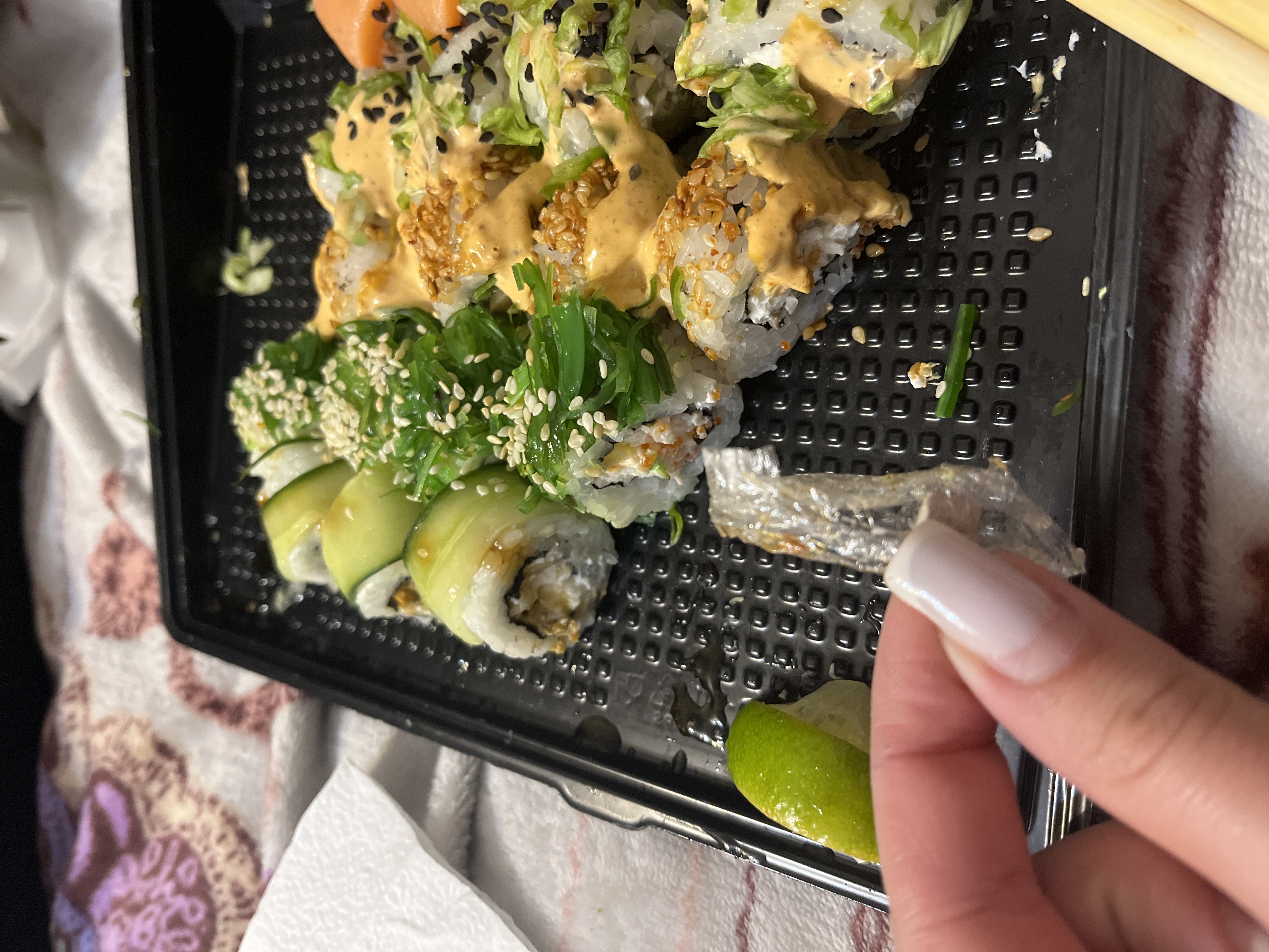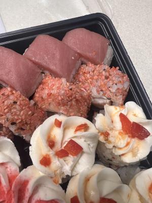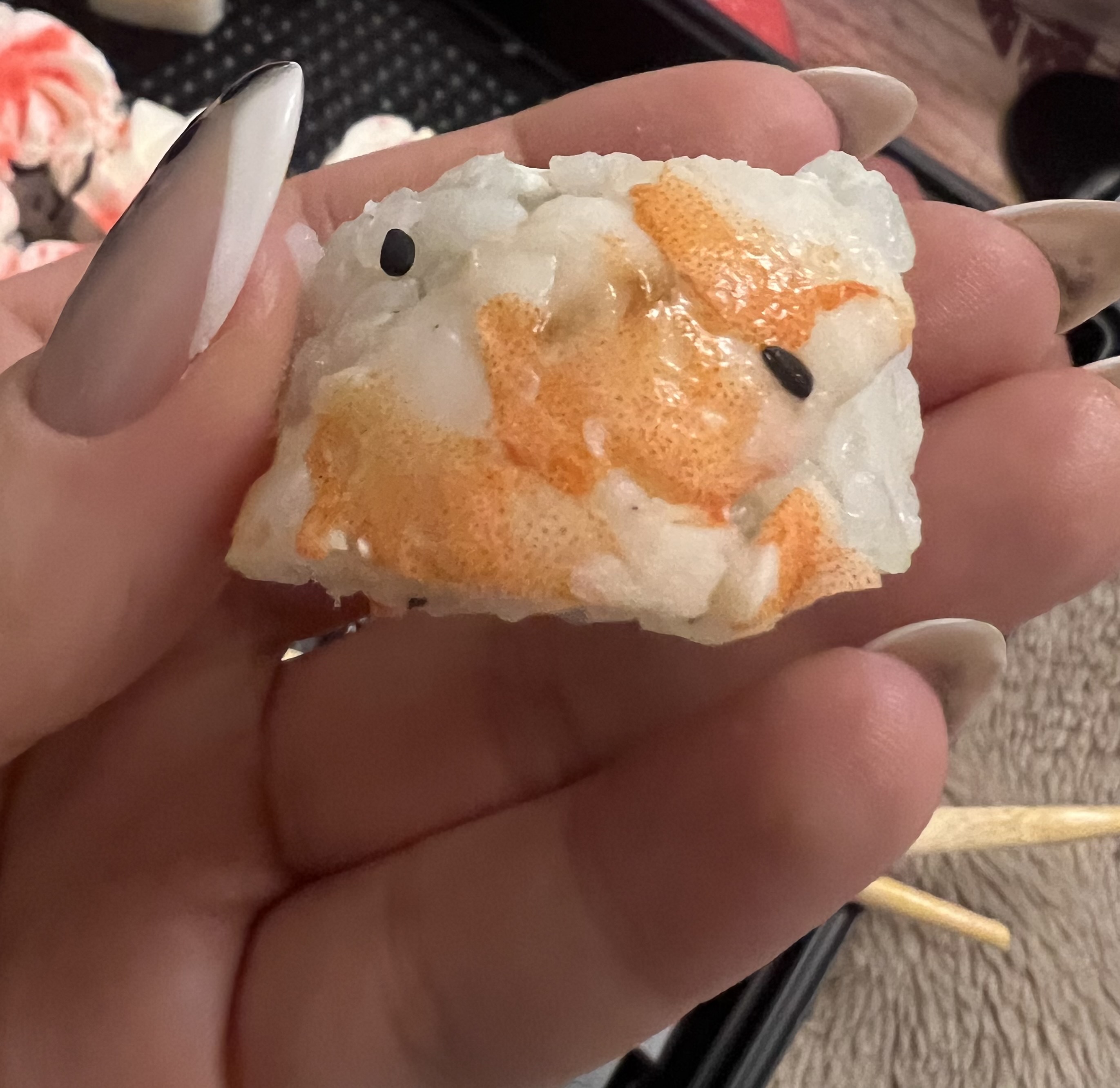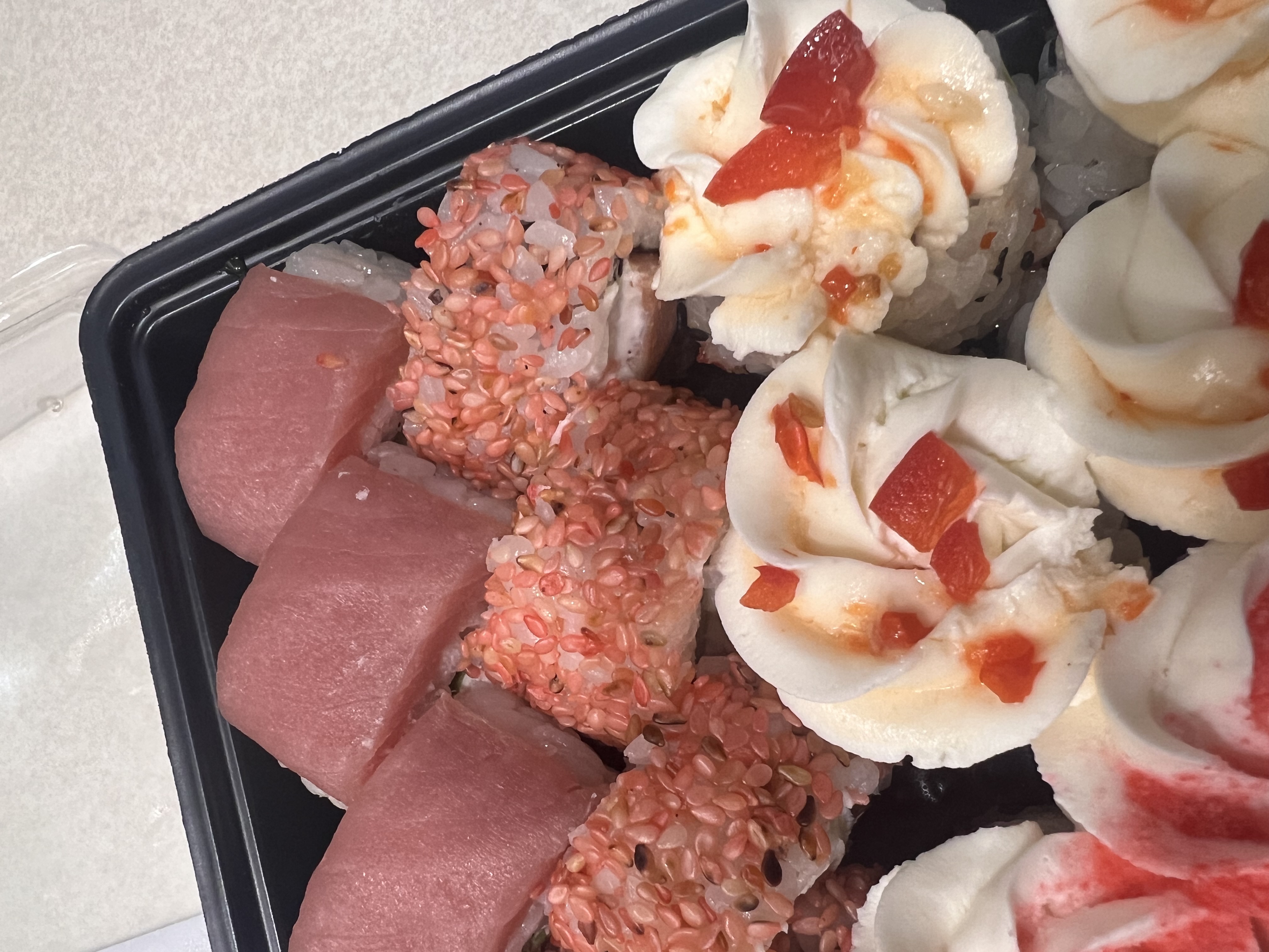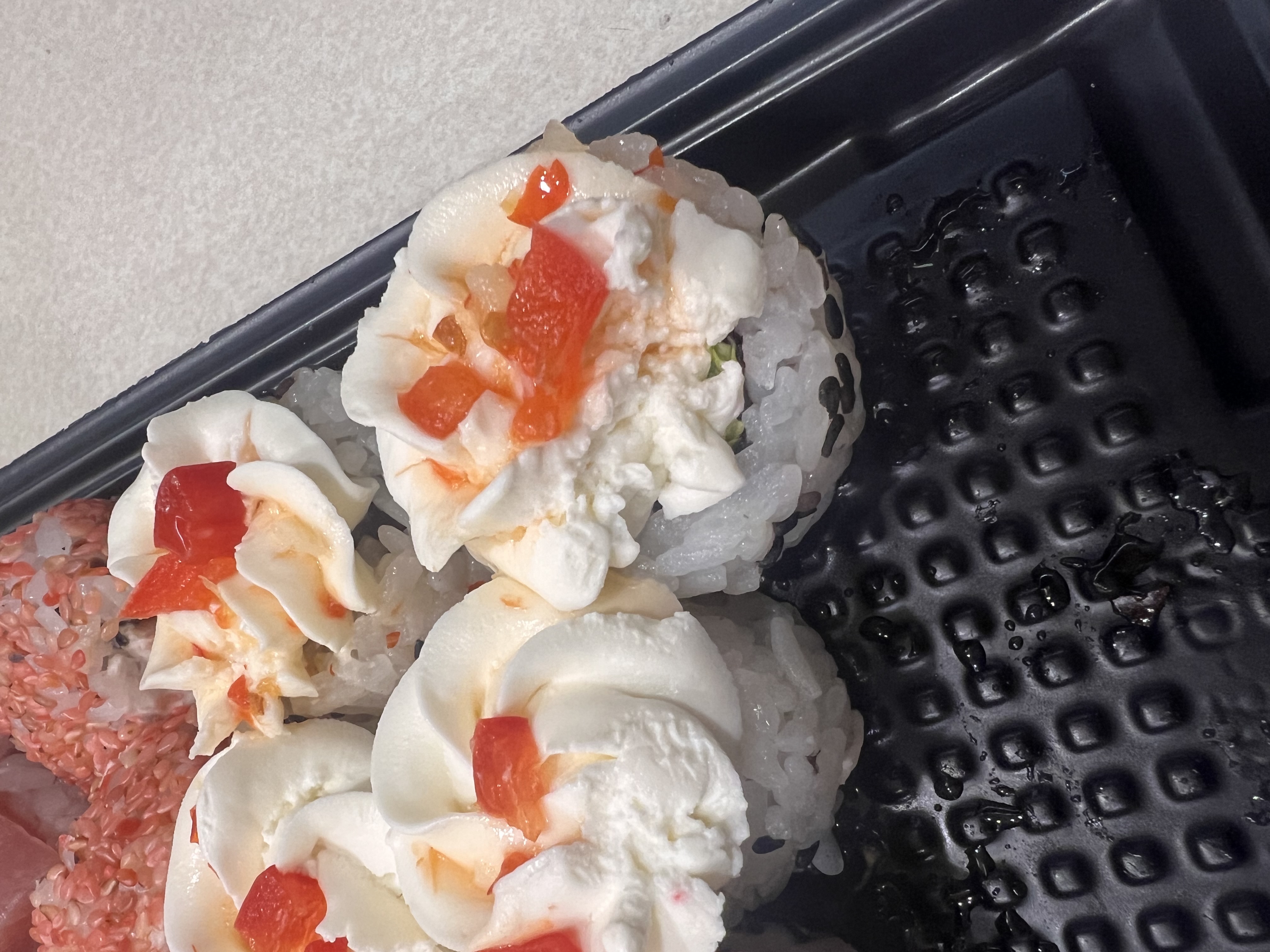 Состав: лосось, огурец, сливочный сыр, соус спайси, кунжут кимчи, соус терияки, кляр, сухари панко