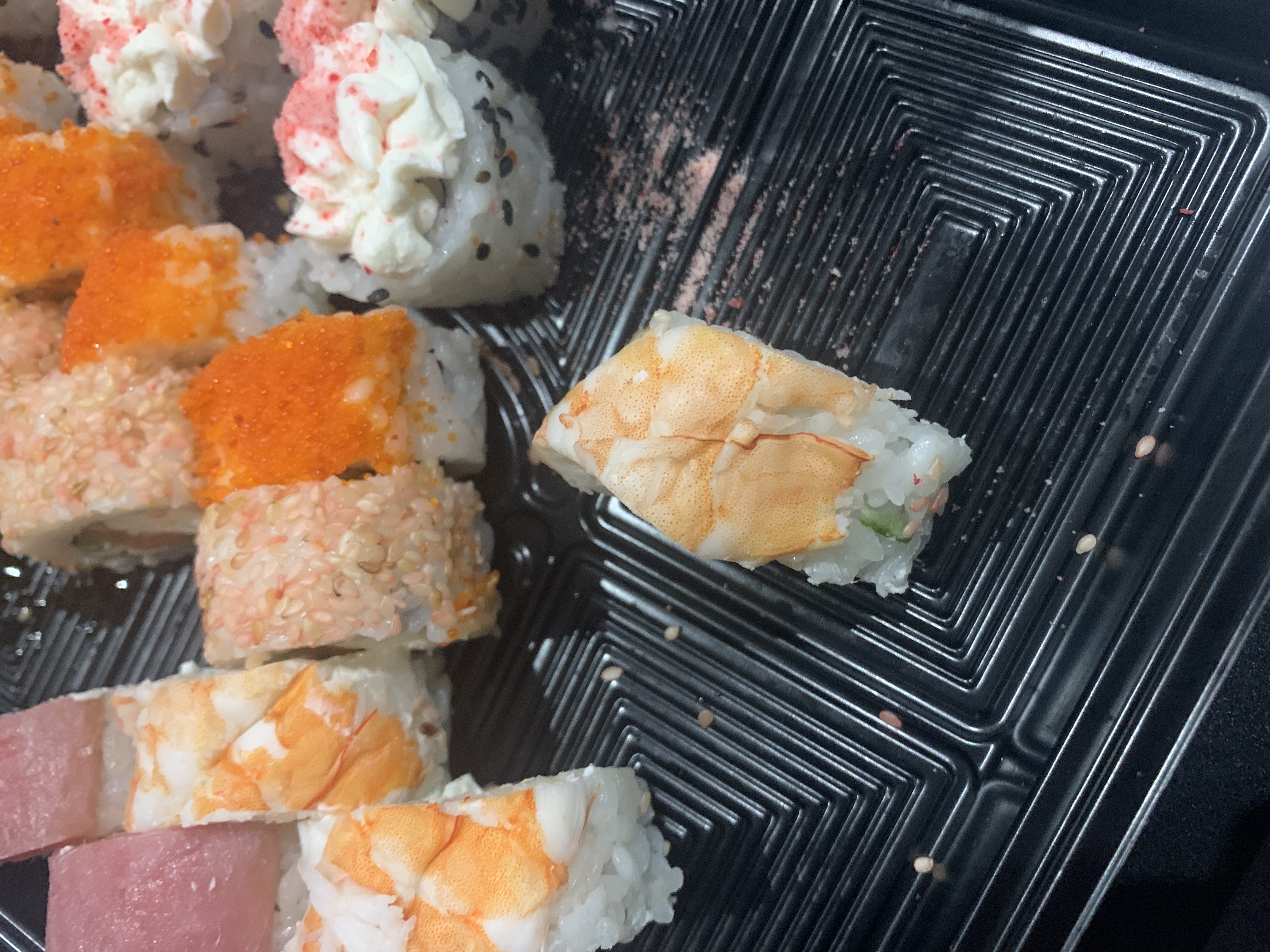 Состав: креветка, авокадо, манго, сливочный сыр, соус уорчестор, кунжутное масло, кунжут, сус кунжутный, петрушка
