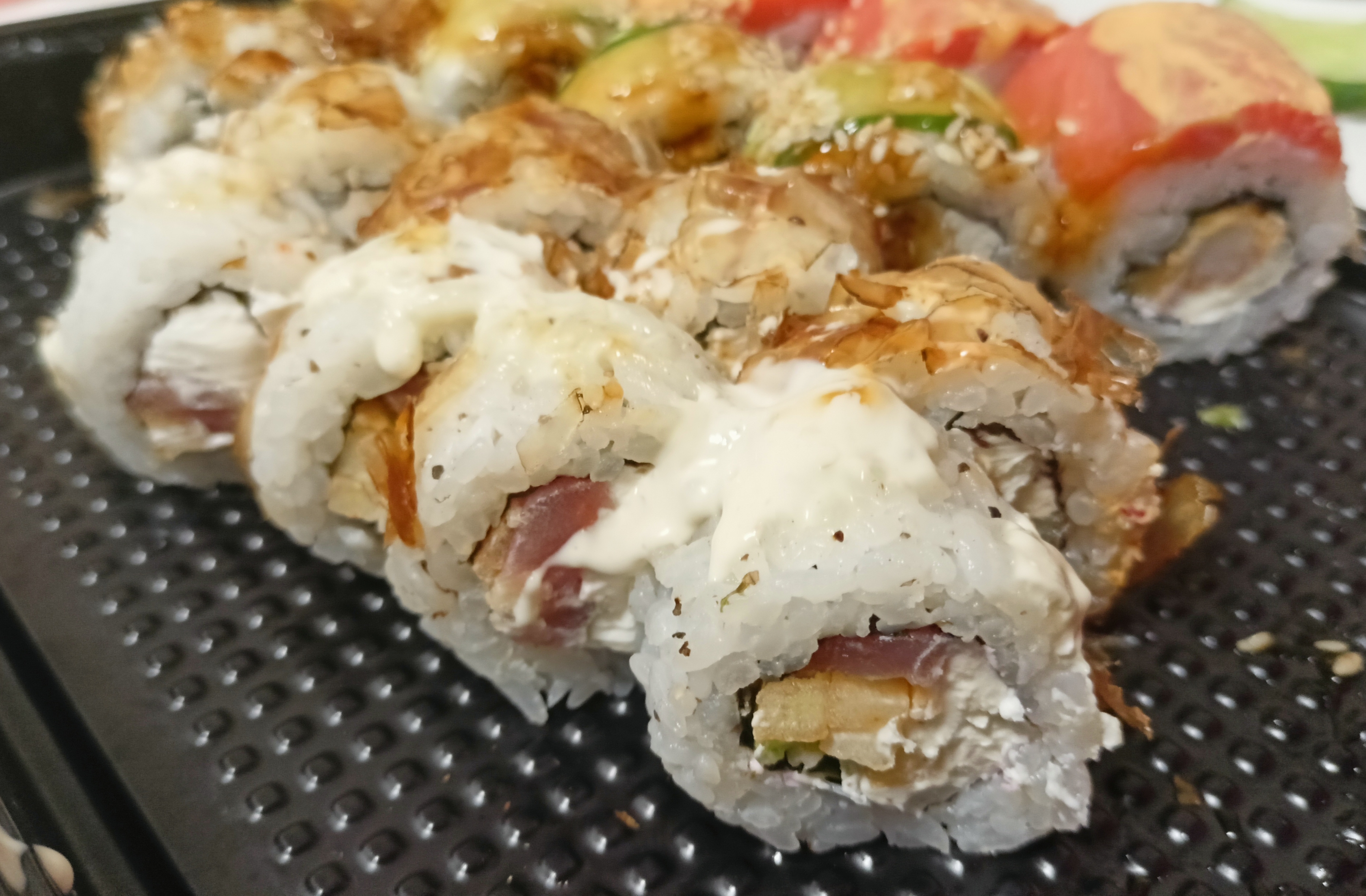 Состав: сунец, авокадо, сливочный сыр, кунжутное масло, картофель пай, соус терияки, кляр, сухари панко