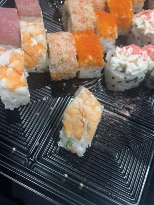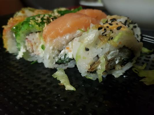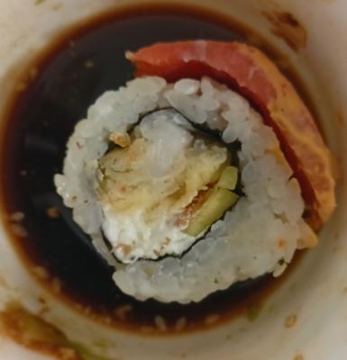 Состав: лосось, огурец, сливочный сыр, соус спайси, кунжут кимчи, соус терияки, кляр, сухари панко