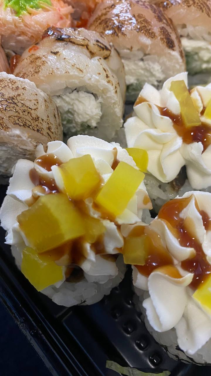 Состав: креветка, авокадо, манго, сливочный сыр, соус уорчестор, кунжутное масло, кунжут, сус кунжутный, петрушка