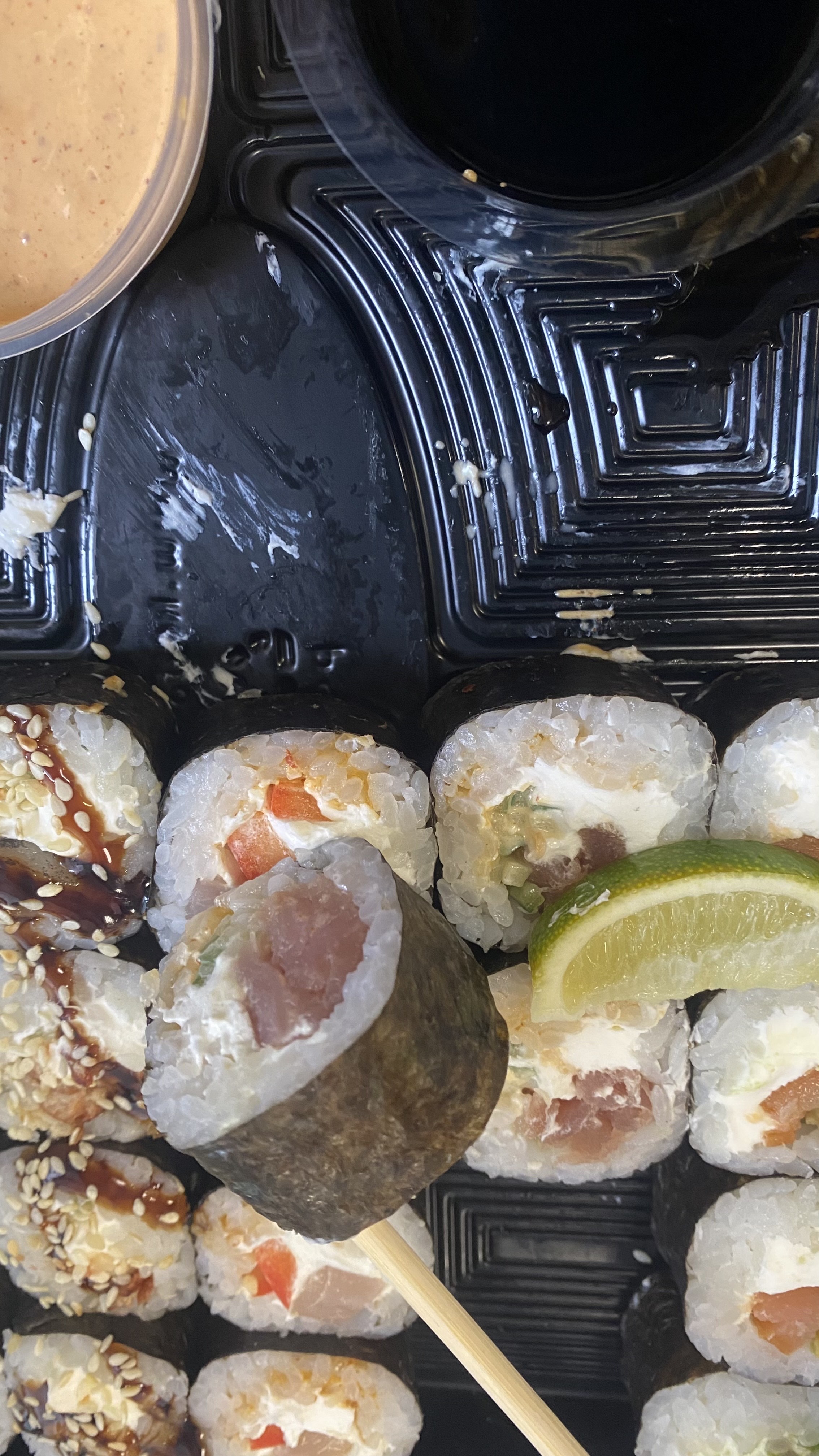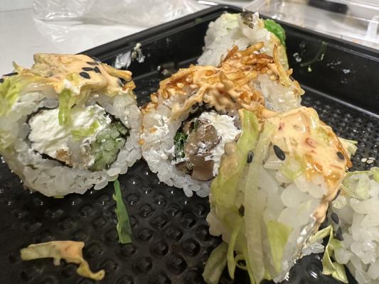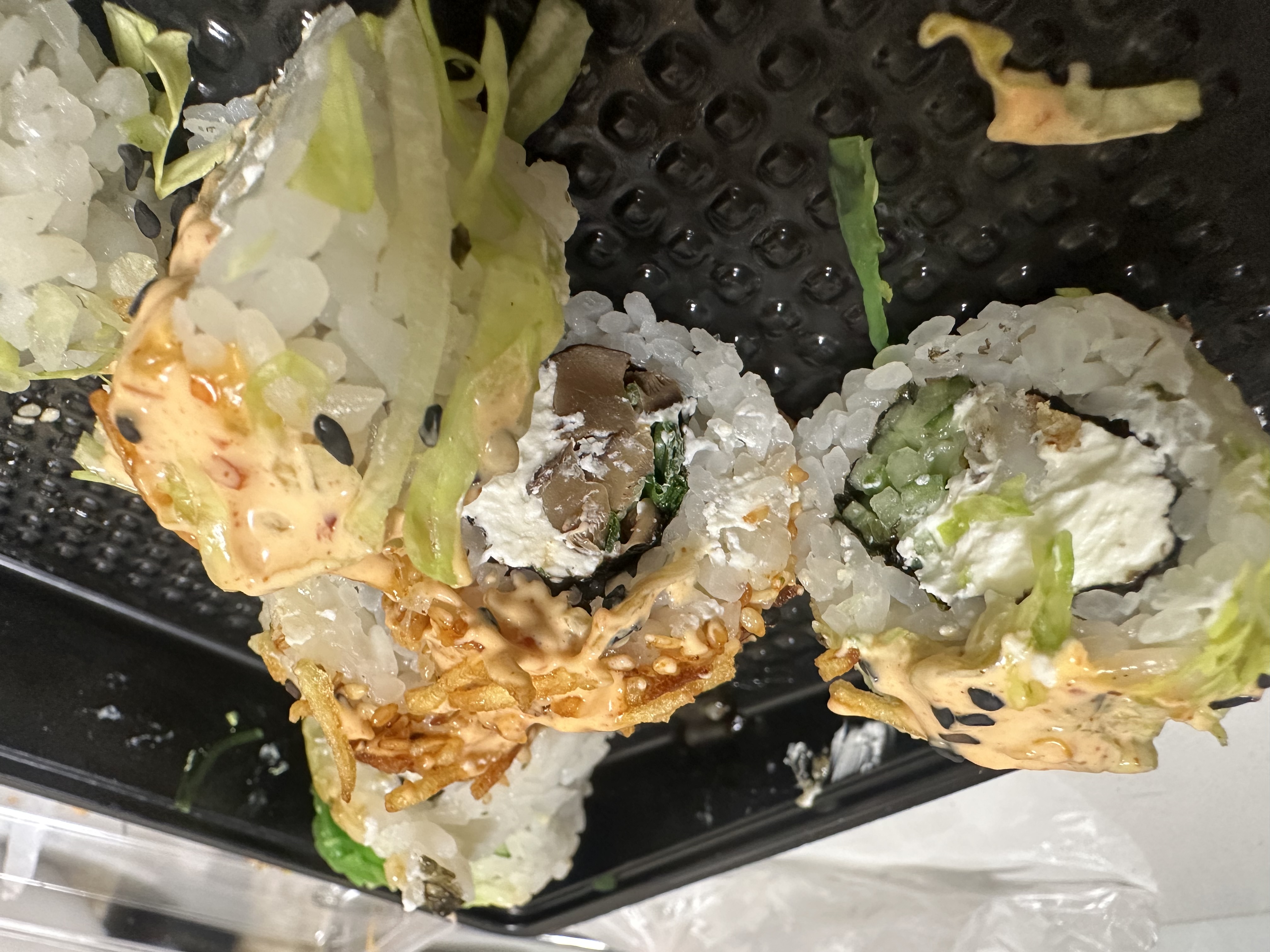 Состав: лосось, огурец, сливочный сыр, соус спайси, кунжут кимчи, соус терияки, кляр, сухари панко