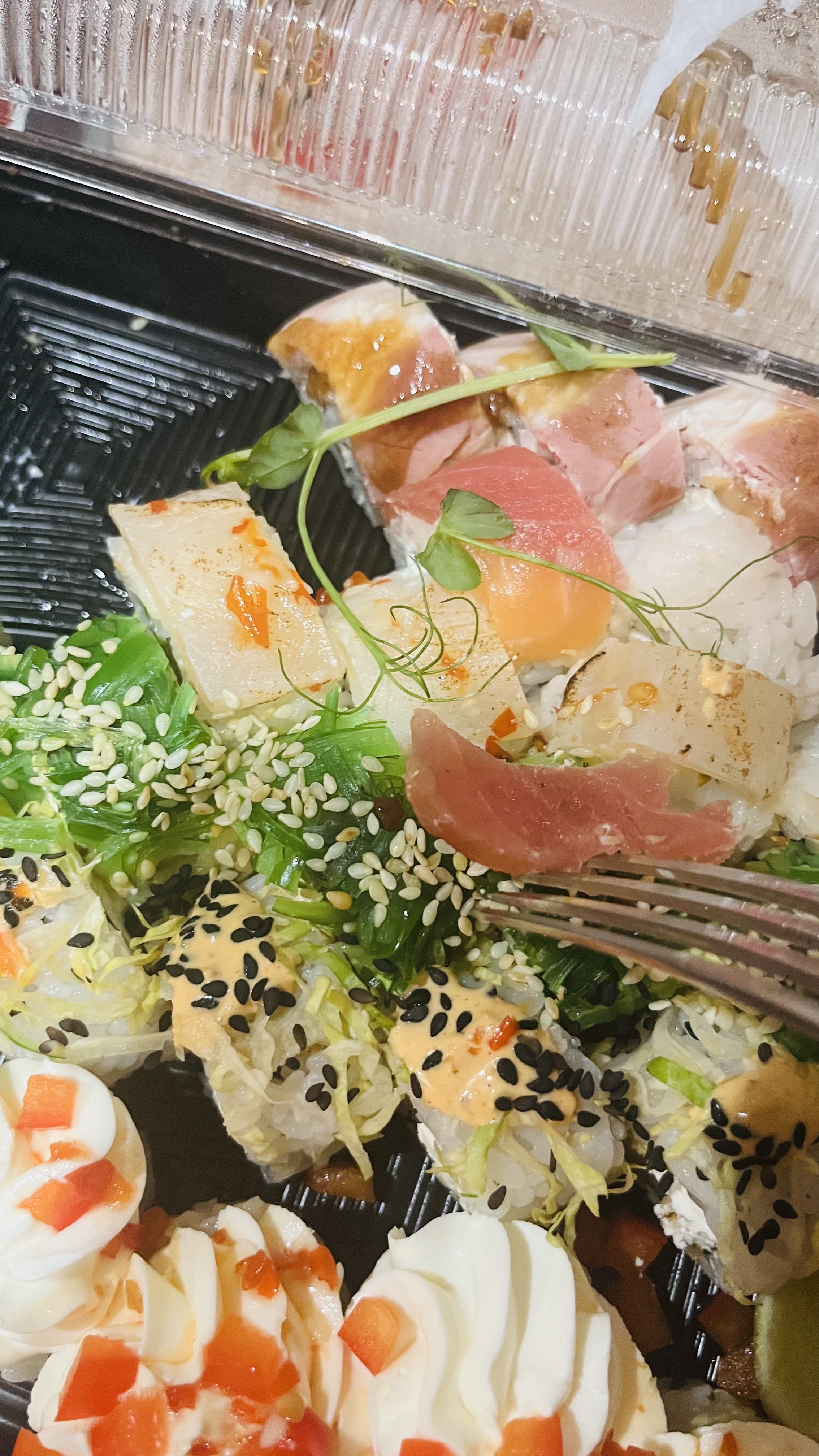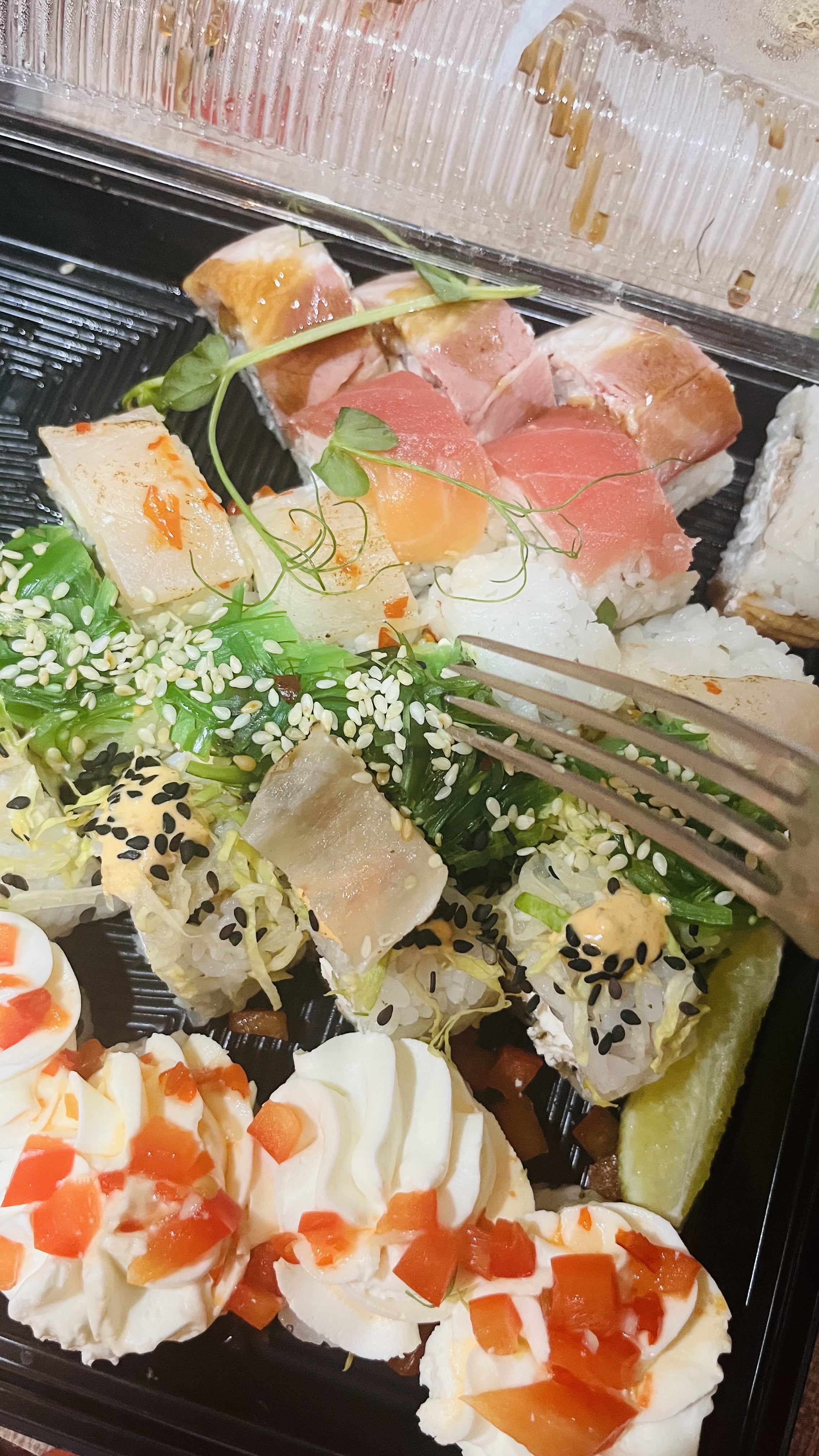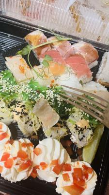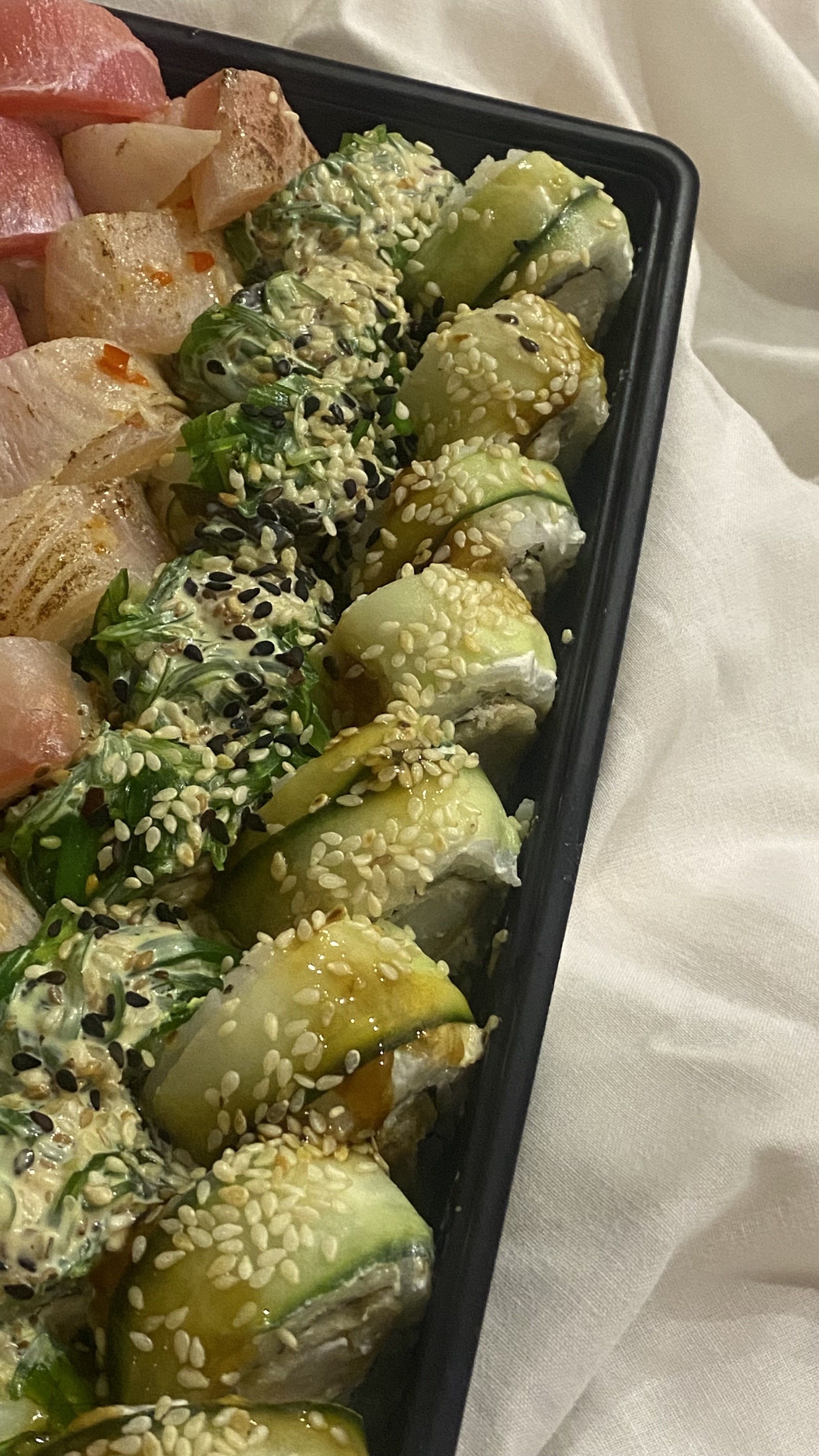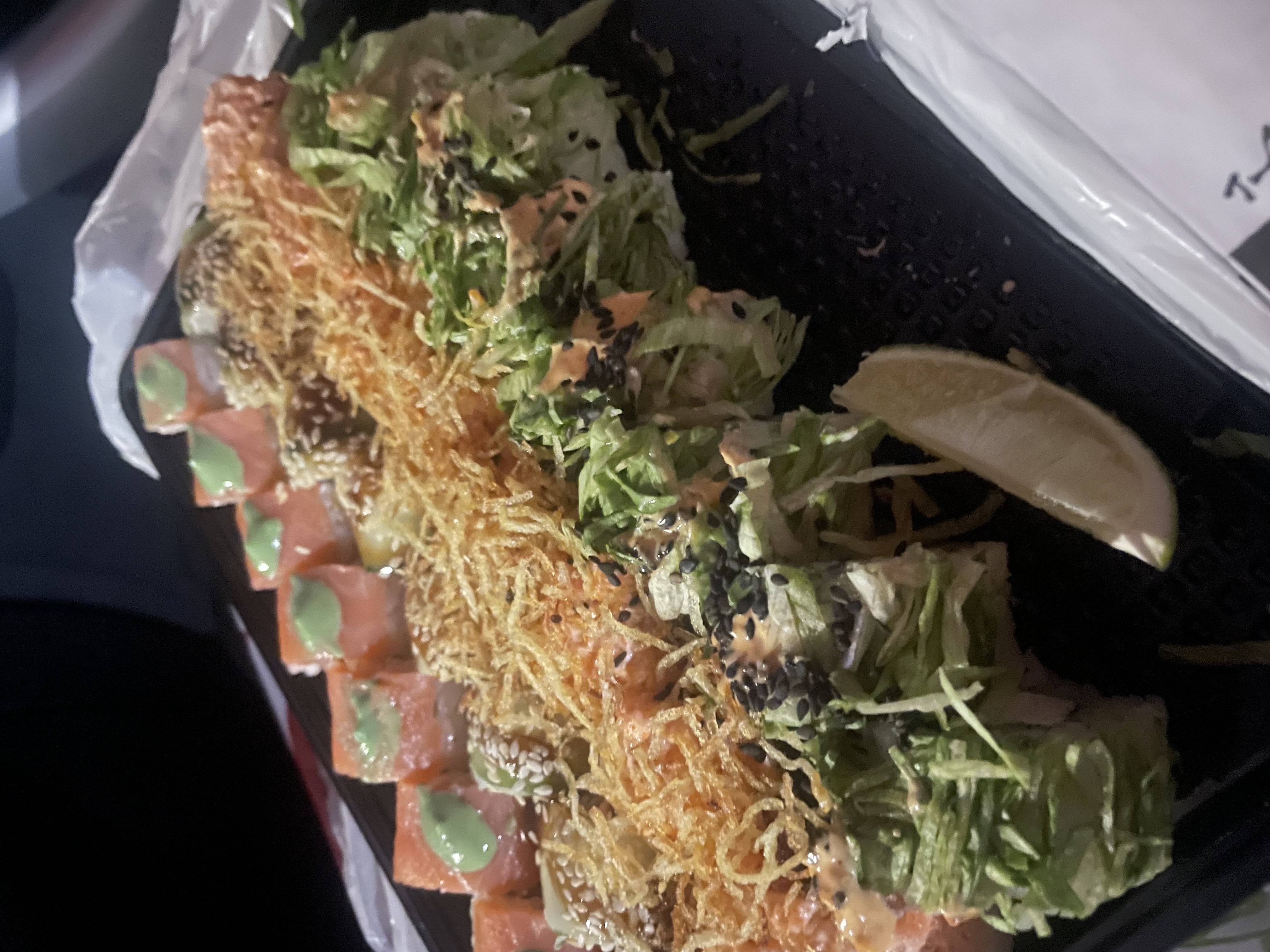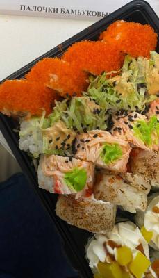 Состав: лосось, огурец, сливочный сыр, соус спайси, кунжут кимчи, соус терияки, кляр, сухари панко