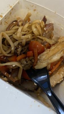 Состав: свинина, соус хойсин, лапша пшеничная, цуккини, лук красный, морковь, перец болгарский, бобы эдомаме, соевые ростки, кунжут, бульон вок, грибы шиитаке