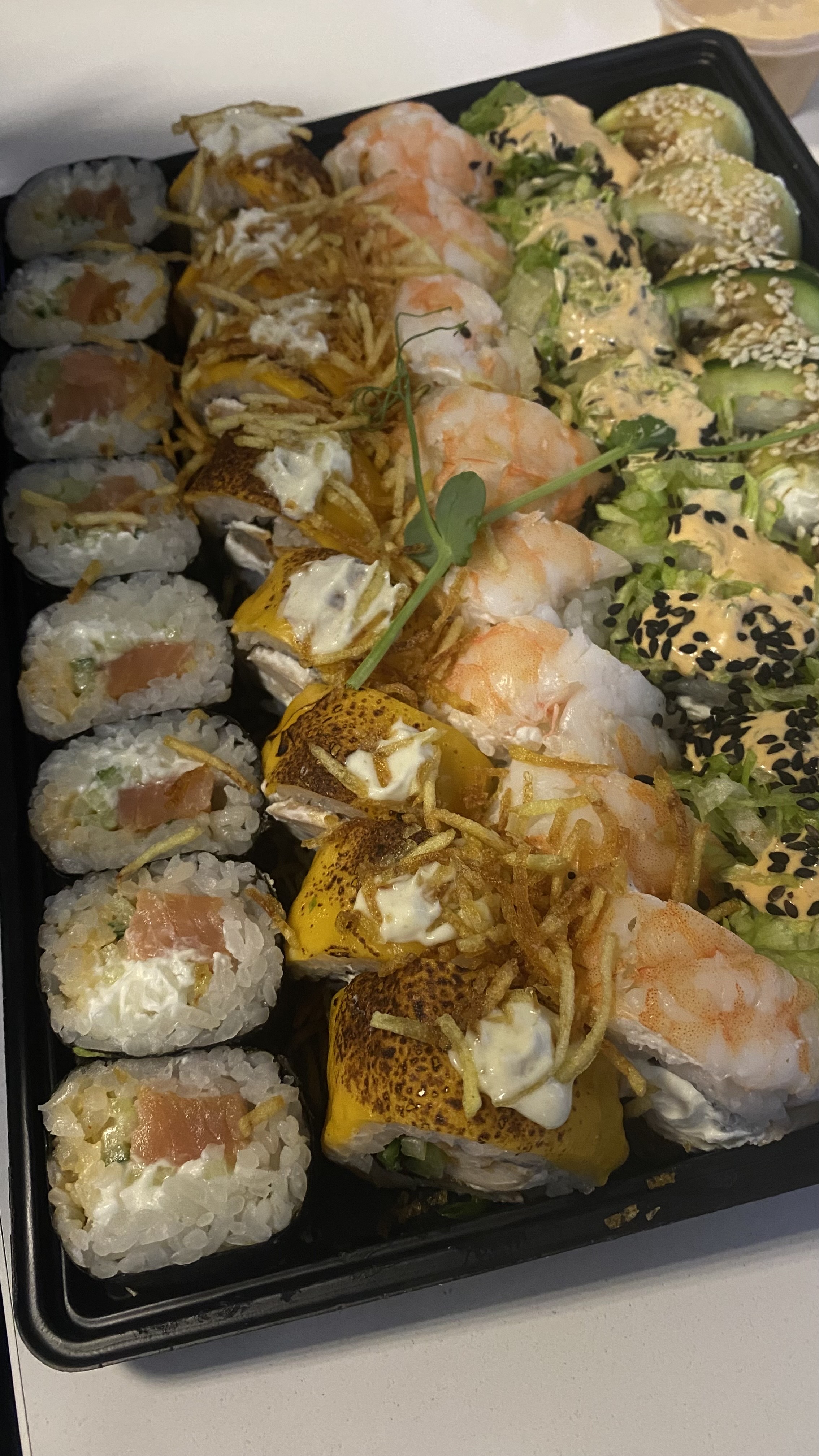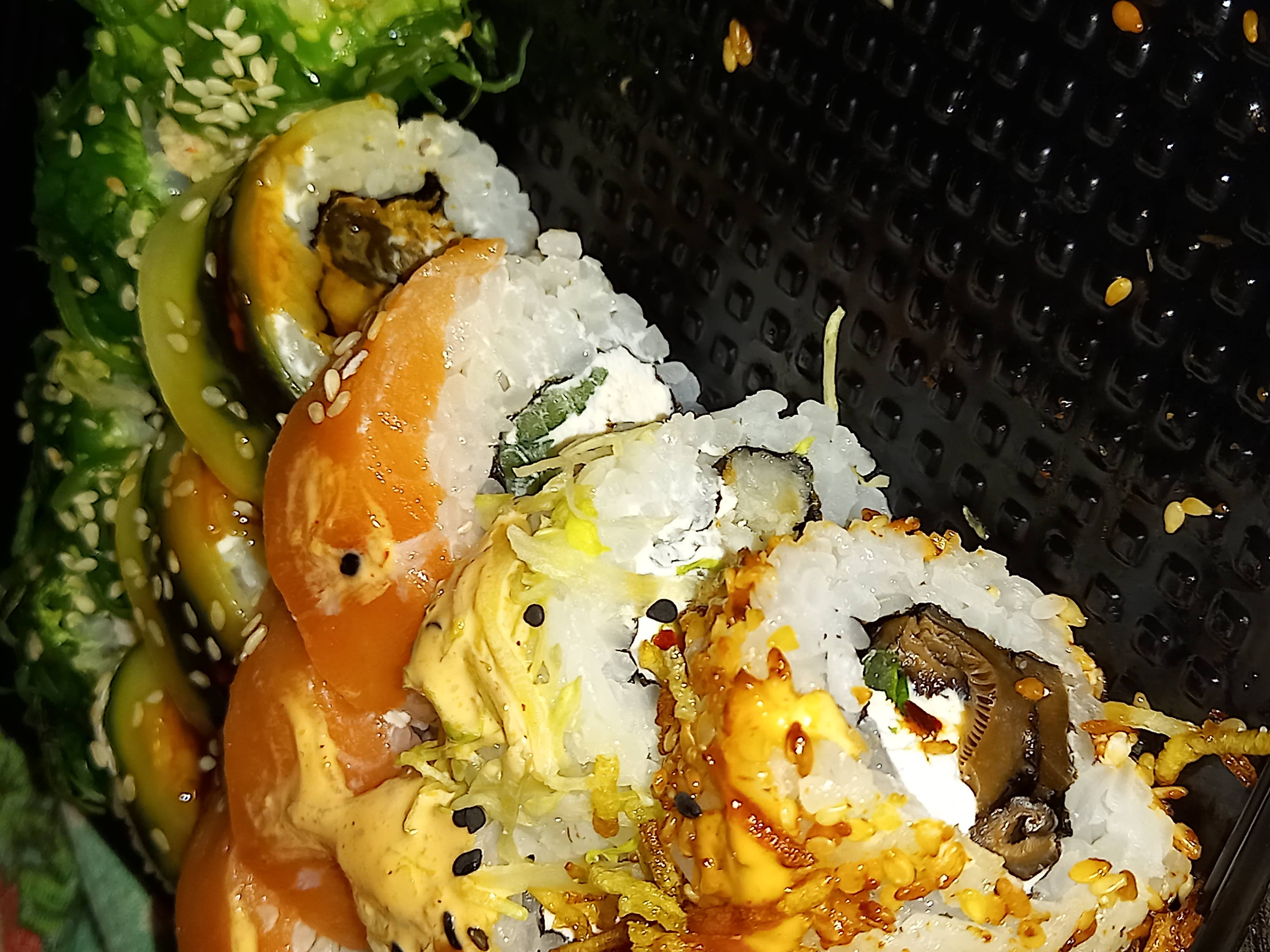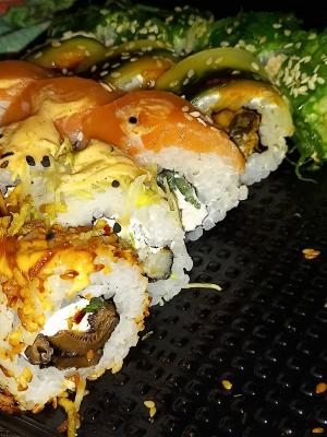 Состав: лосось, огурец, сливочный сыр, соус спайси, кунжут кимчи, соус терияки, кляр, сухари панко