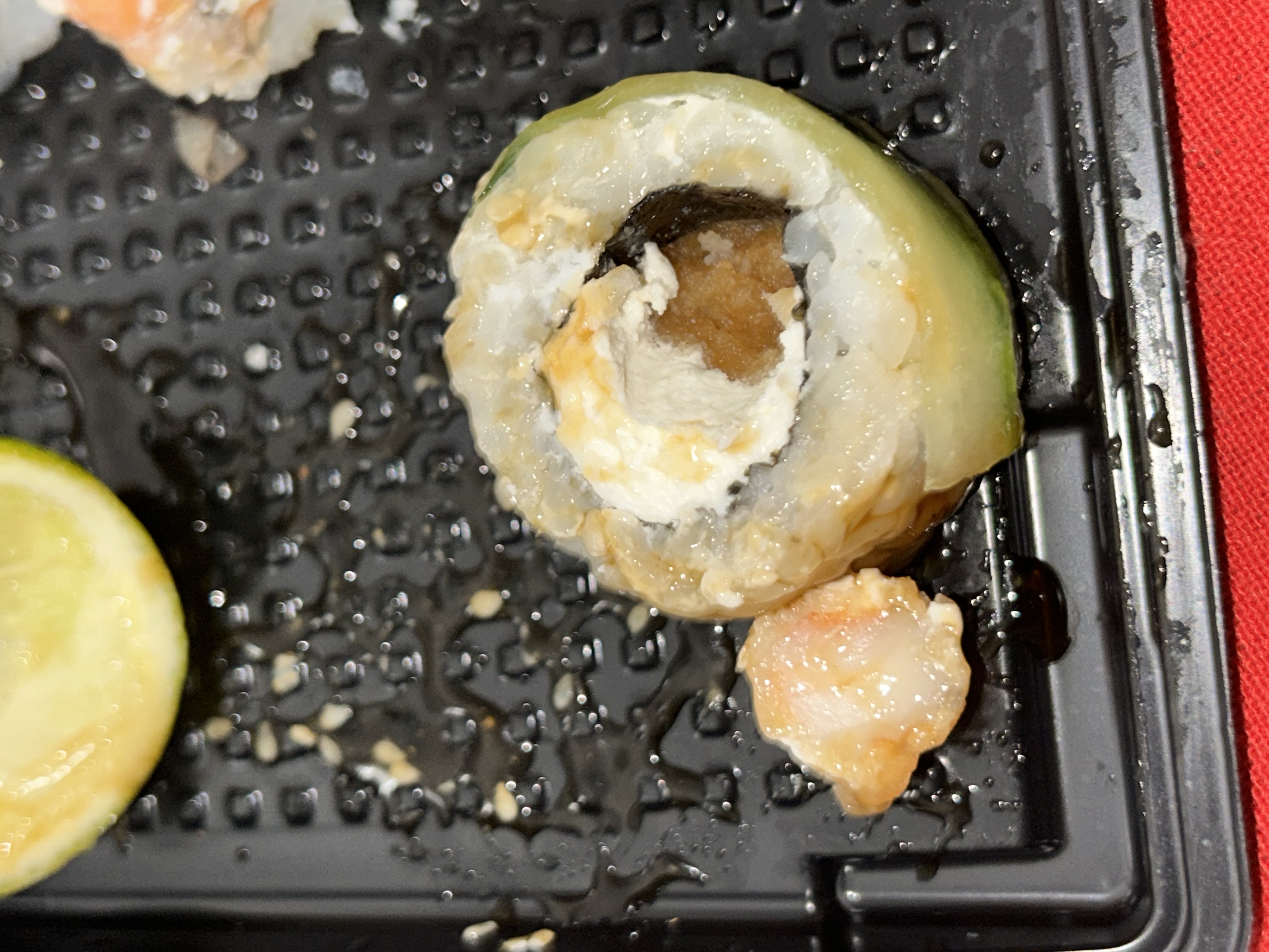 Состав: креветка, авокадо, манго, сливочный сыр, соус уорчестор, кунжутное масло, кунжут, сус кунжутный, петрушка