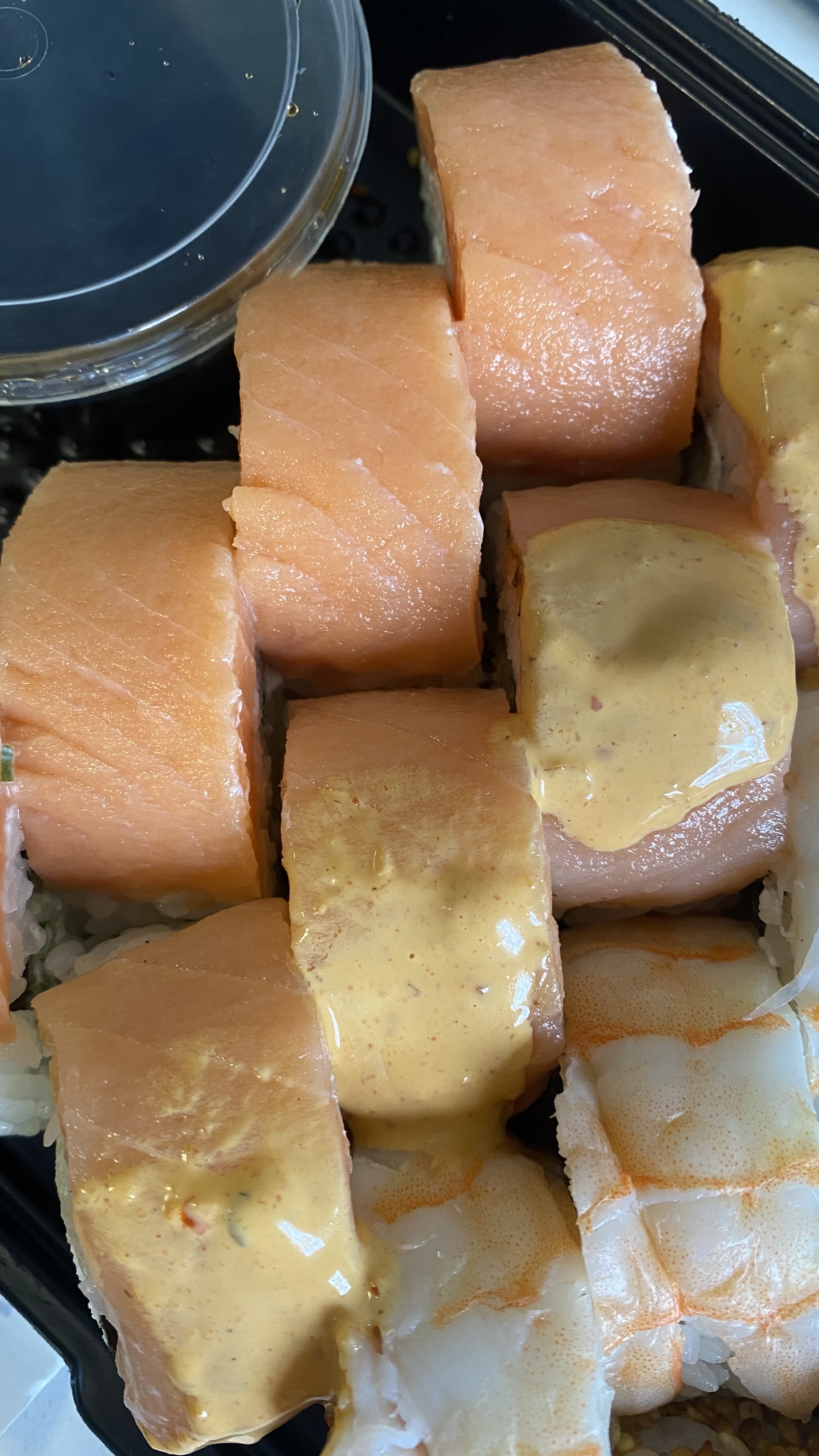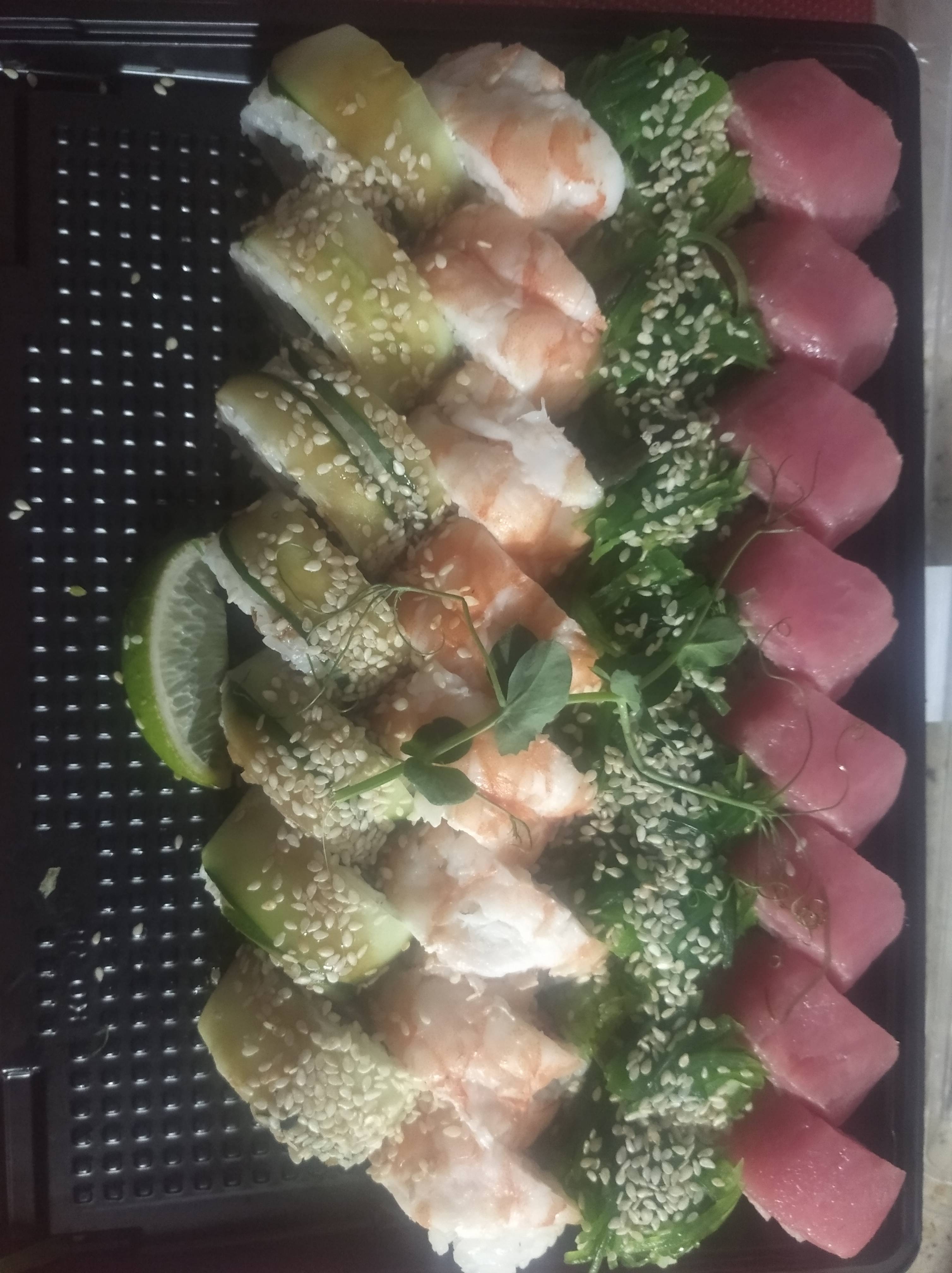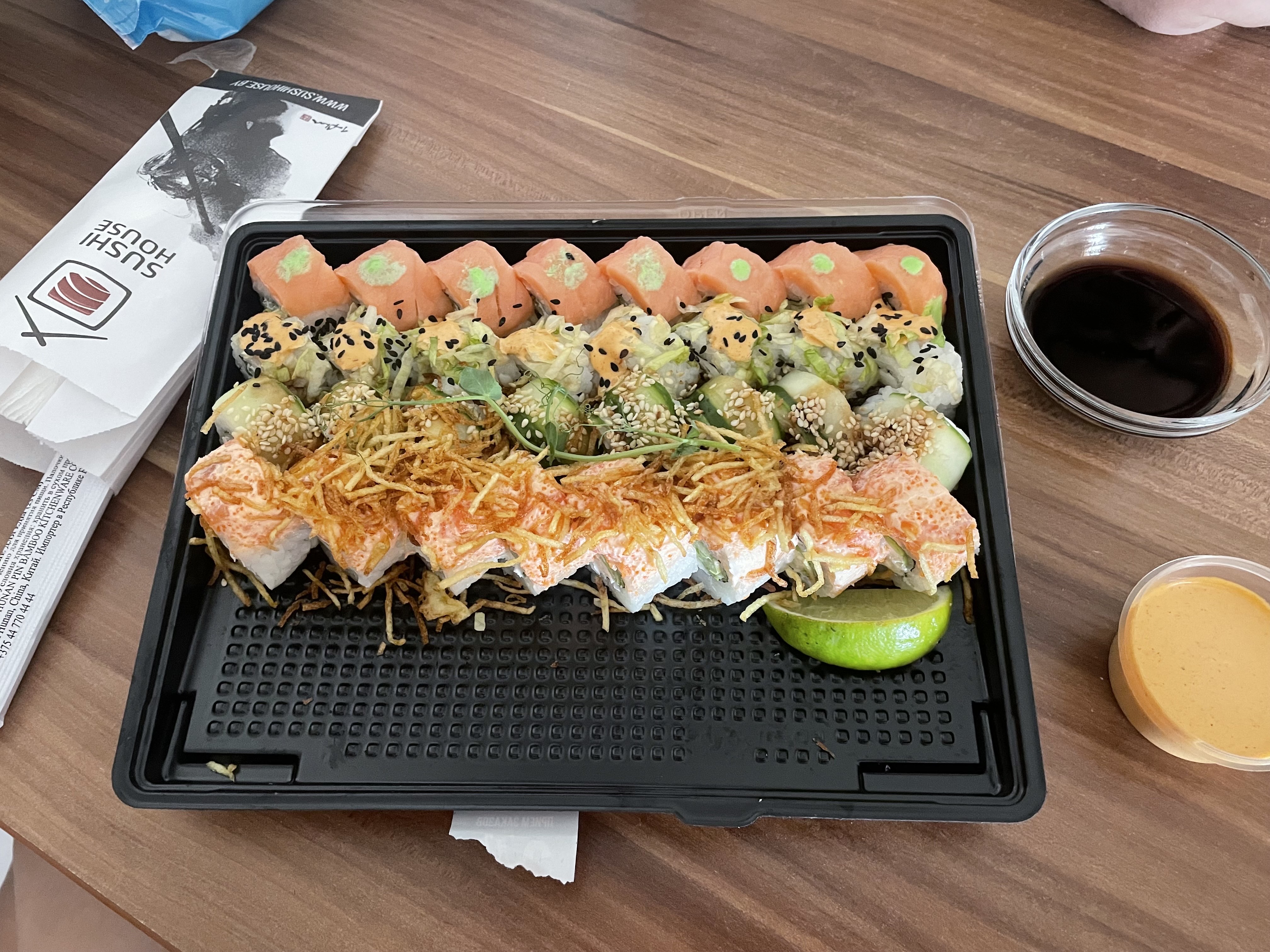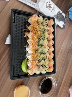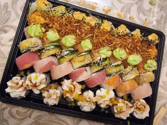Заказывали с коллегами.Привезли даже раньше.Запах суши распространился по всей кухне)На вкус суши нежные,свежие, одним словом,отменные.Спасибо,что сделали окончание рабочей недели таким вкусным!!))