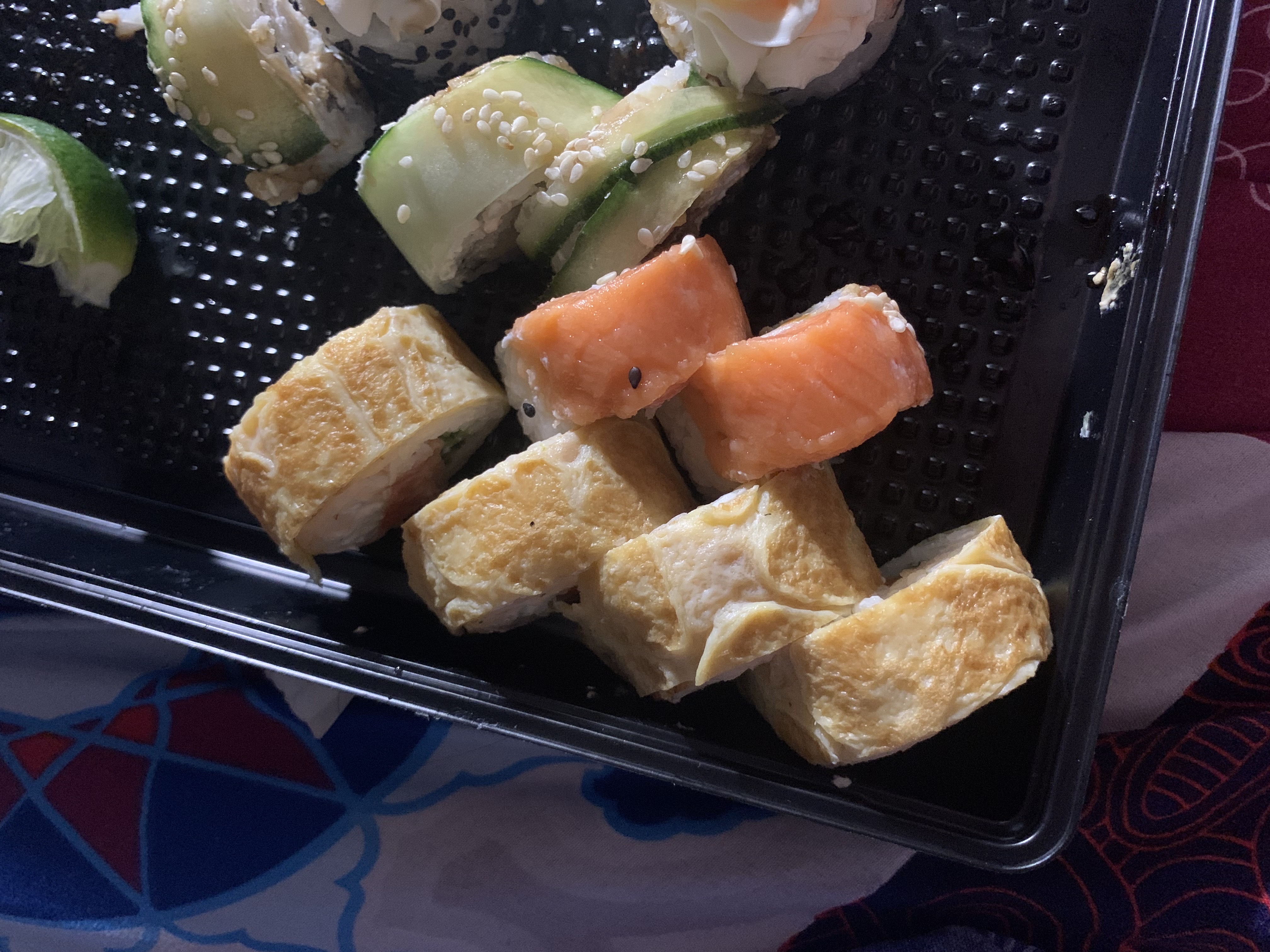 Состав: японский омлет, рис, нори, соус Унаги, кунжут белый