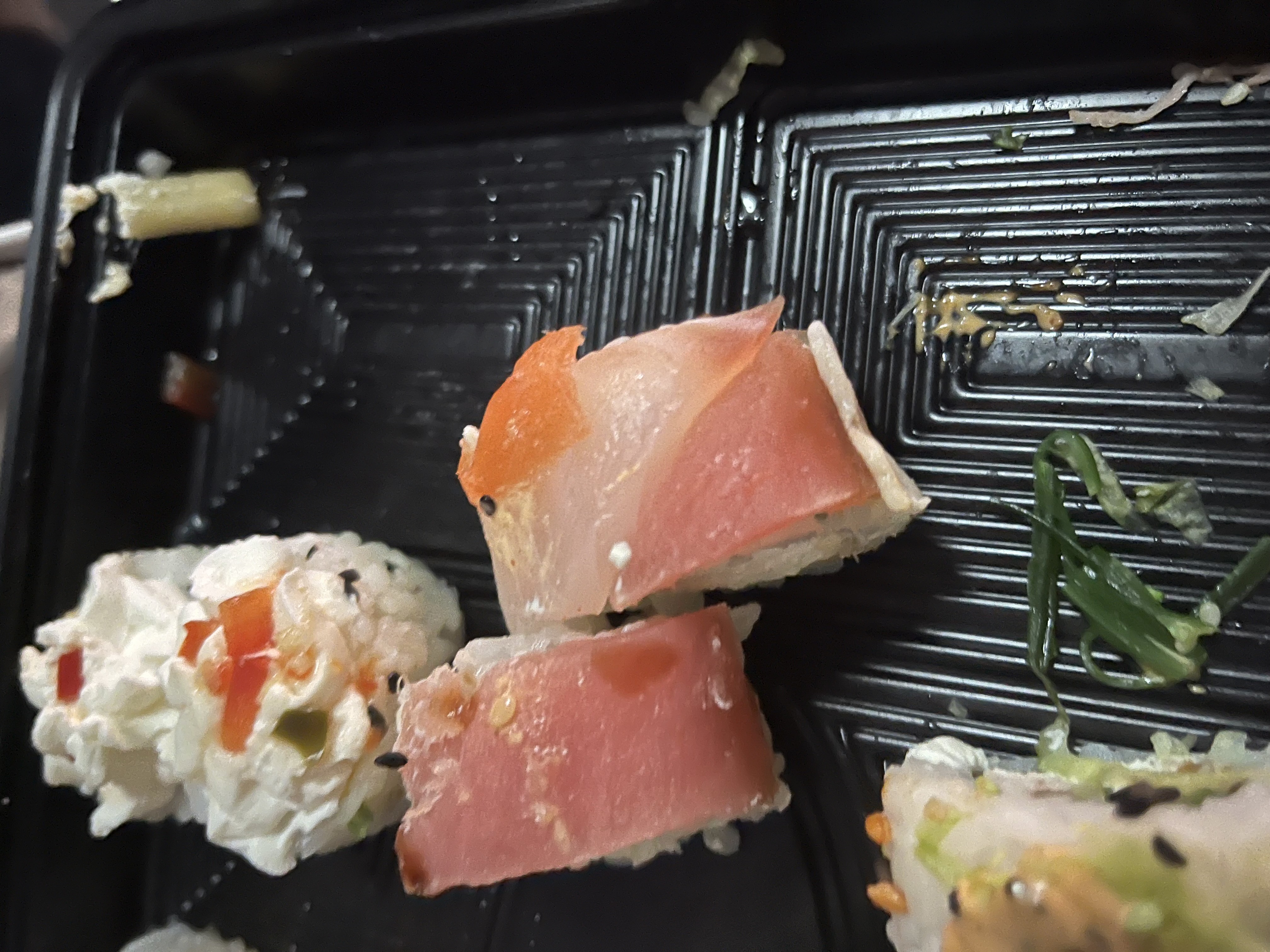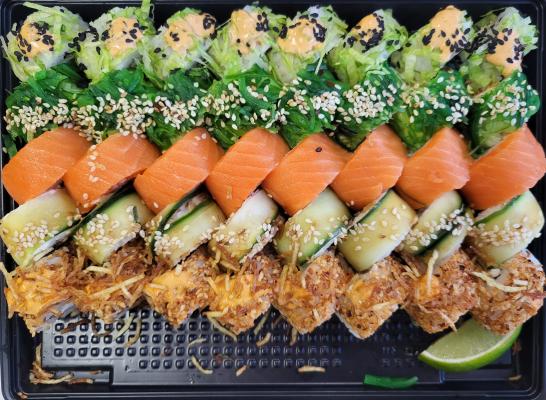 Состав: лосось, огурец, сливочный сыр, соус спайси, кунжут кимчи, соус терияки, кляр, сухари панко