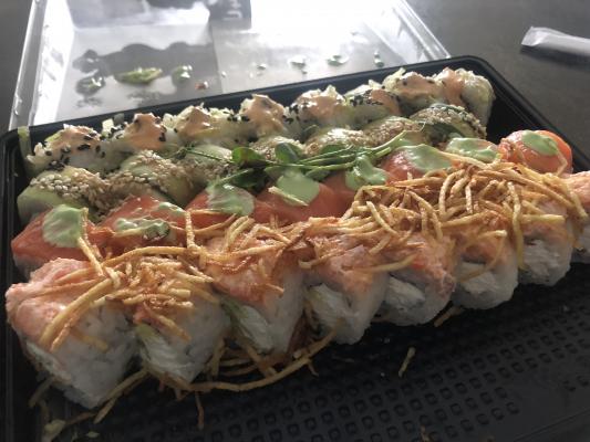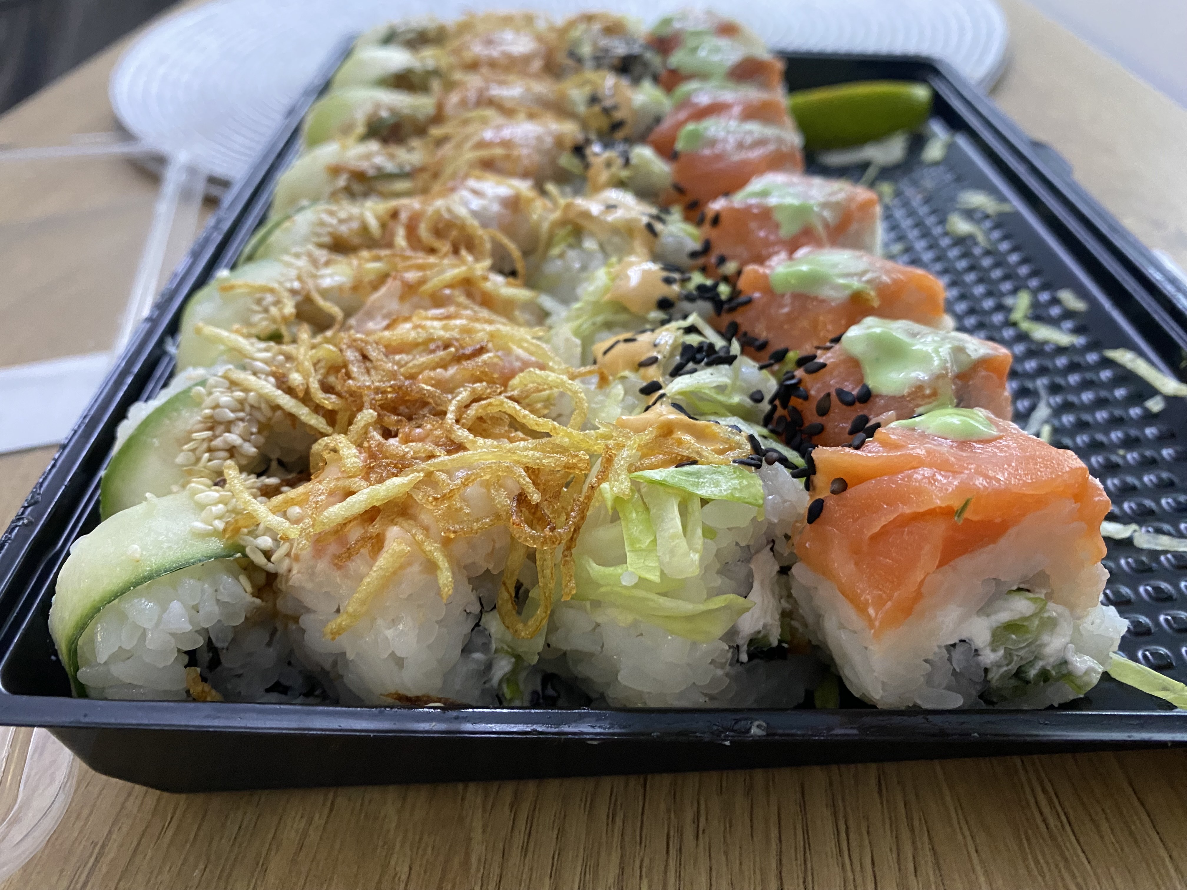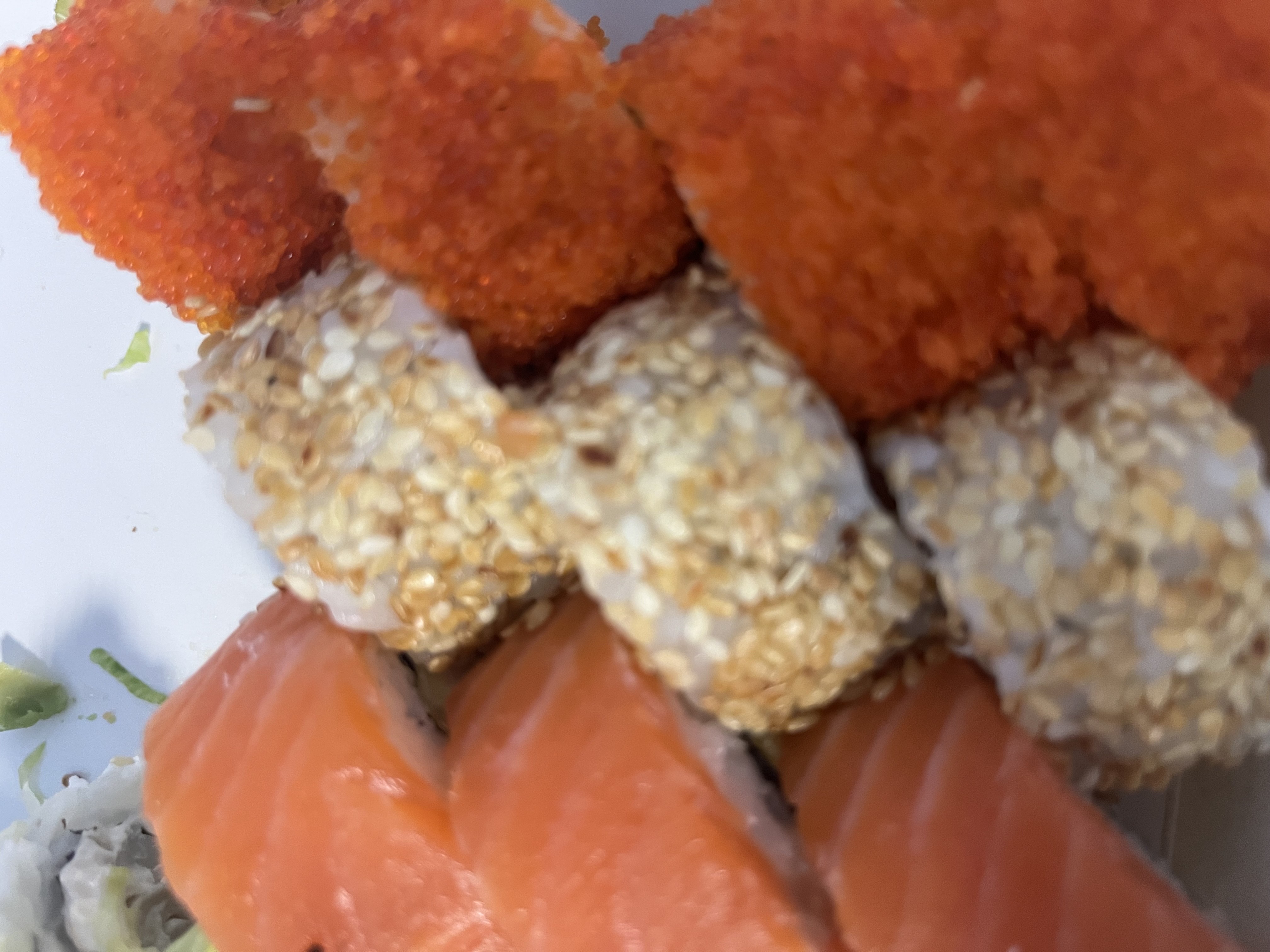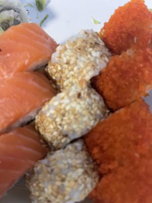 Состав: лосось, огурец, сливочный сыр, соус спайси, кунжут кимчи, соус терияки, кляр, сухари панко