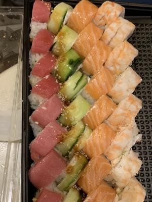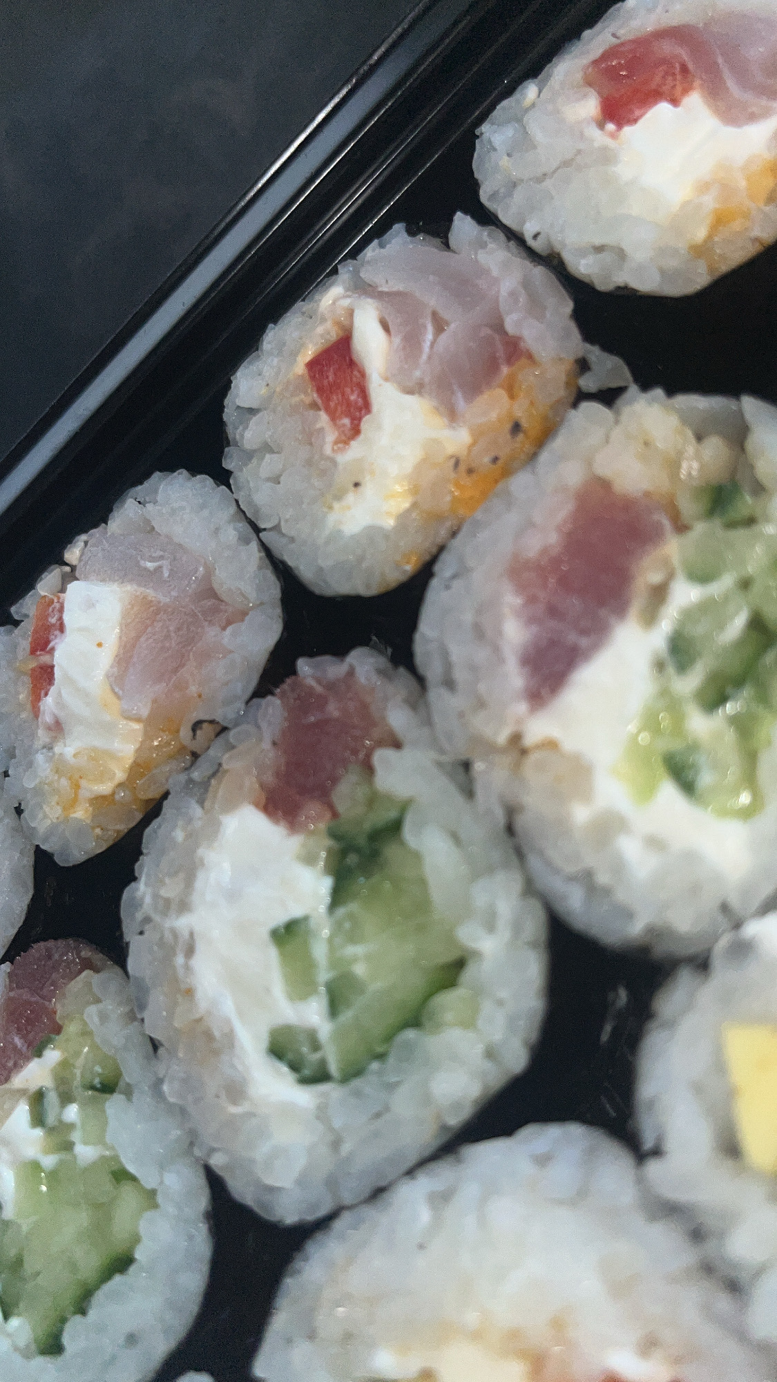 Состав: лосось, огурец, сливочный сыр, соус спайси, кунжут кимчи, соус терияки, кляр, сухари панко
