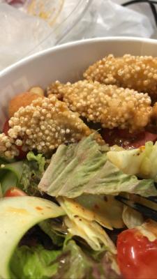 Состав: шампиньоны жаренные, сыр чеддер, кранч лук, сливочный сыр, томаты черри, соус спайси, соус терияки, кляр, сухари панко