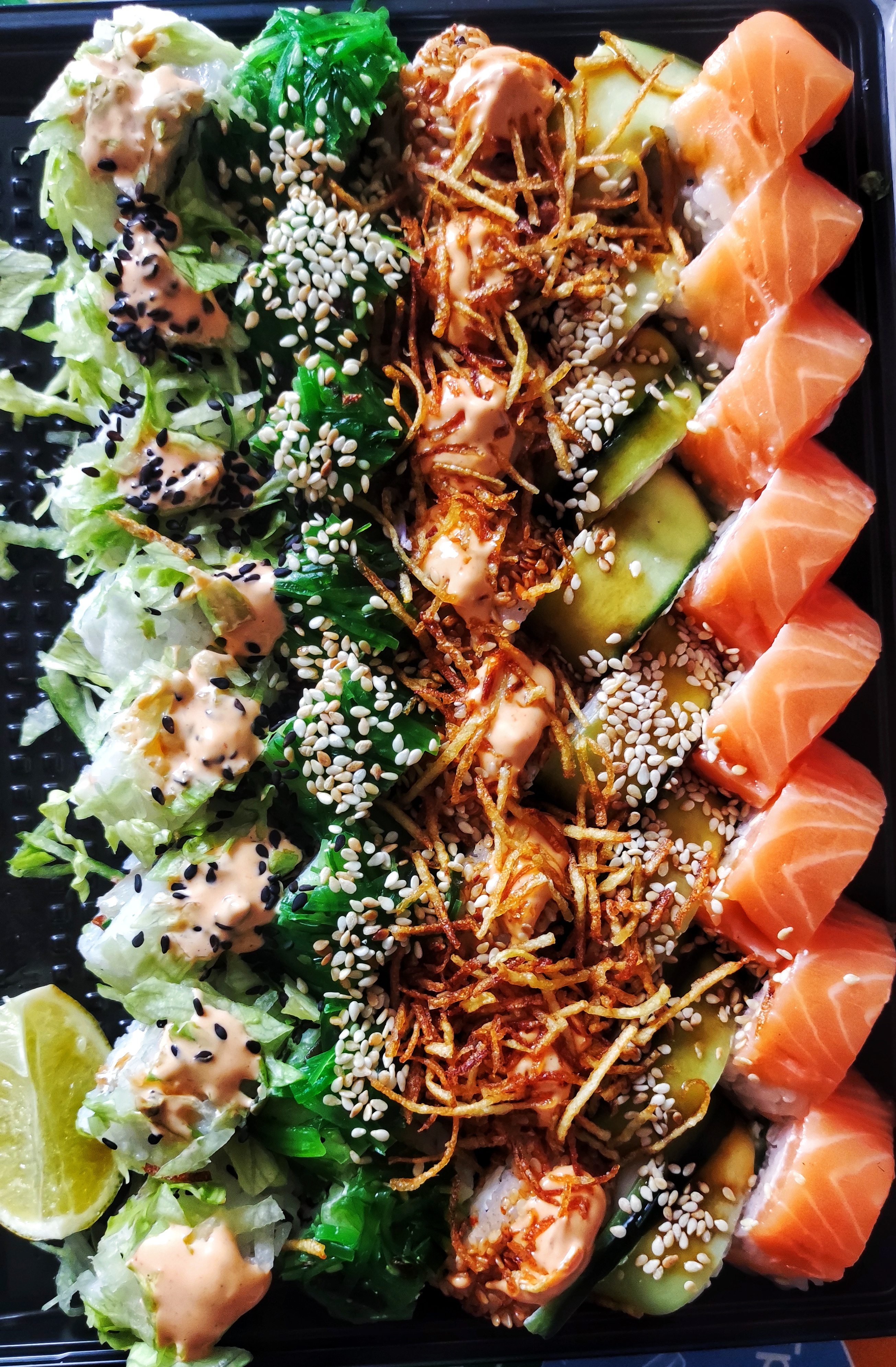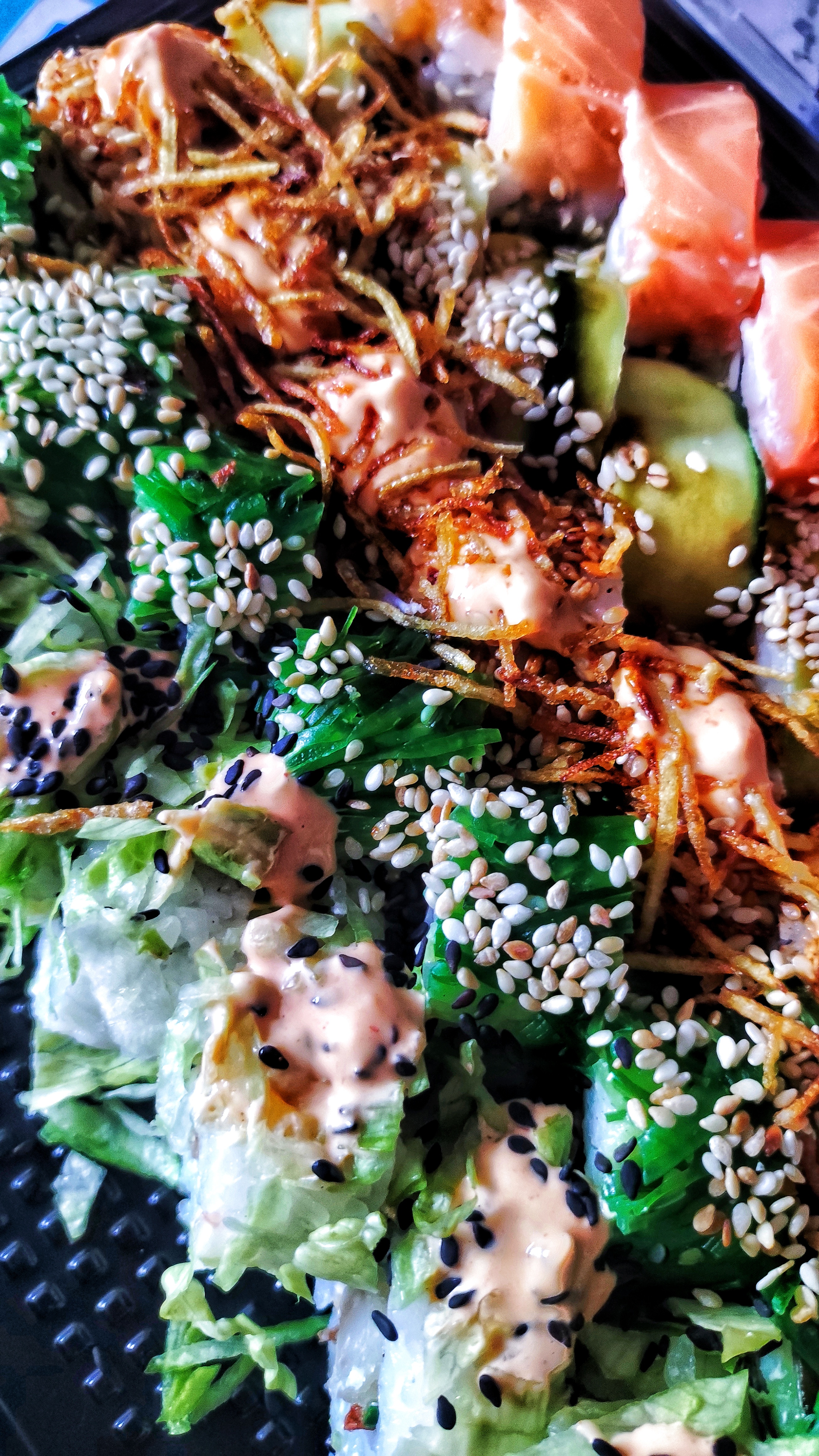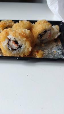 Состав: лосось, огурец, сливочный сыр, соус спайси, кунжут кимчи, соус терияки, кляр, сухари панко