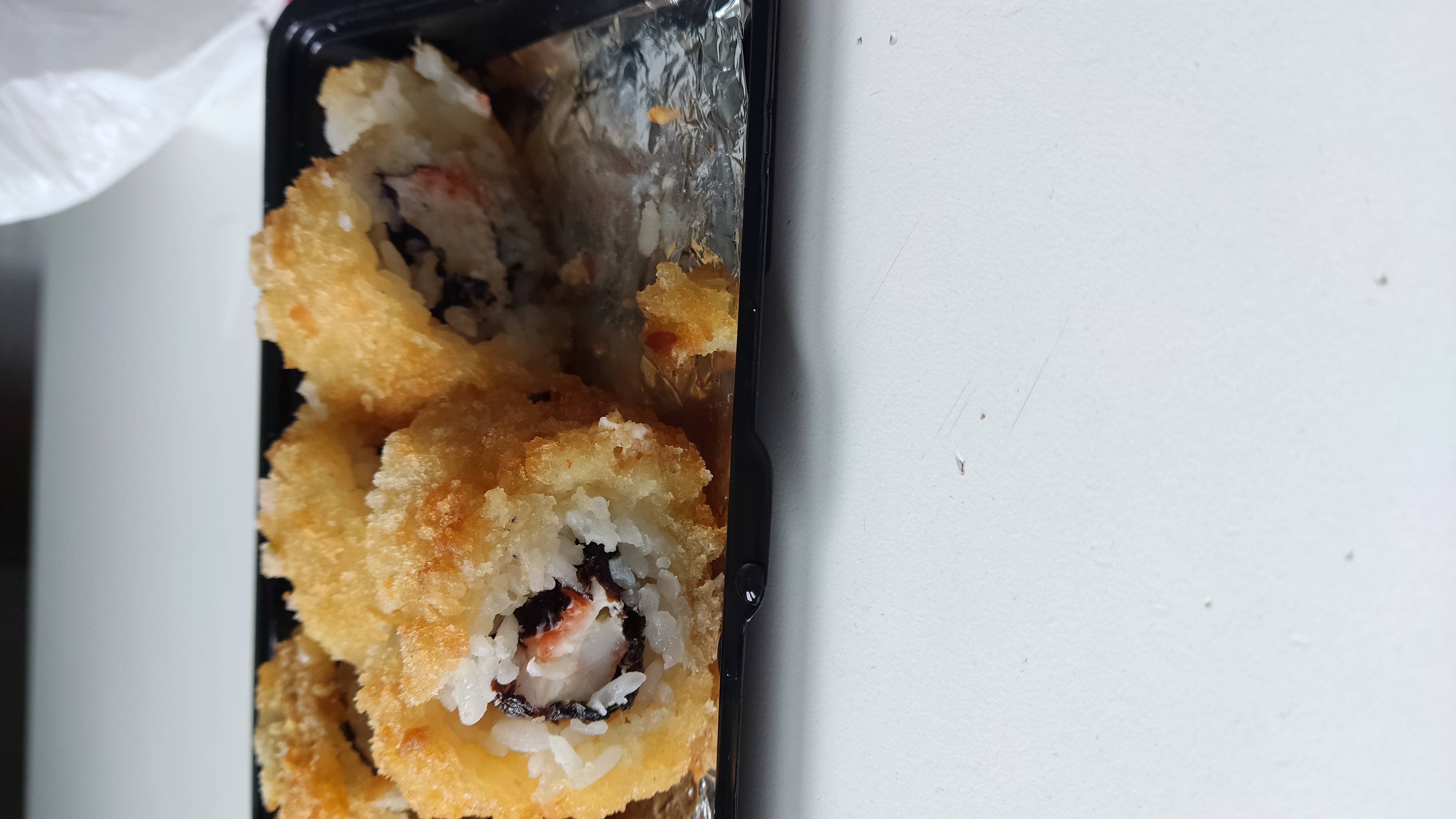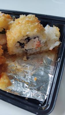 Состав: краб микс, сыр чеддер, огурец, чипс бекона, сливочный сыр, соус терияки, кляр, сухари панко
