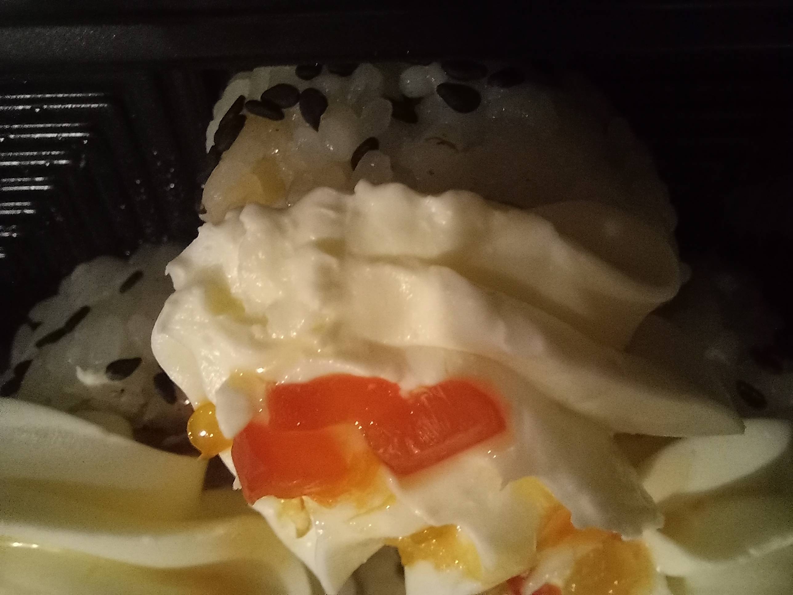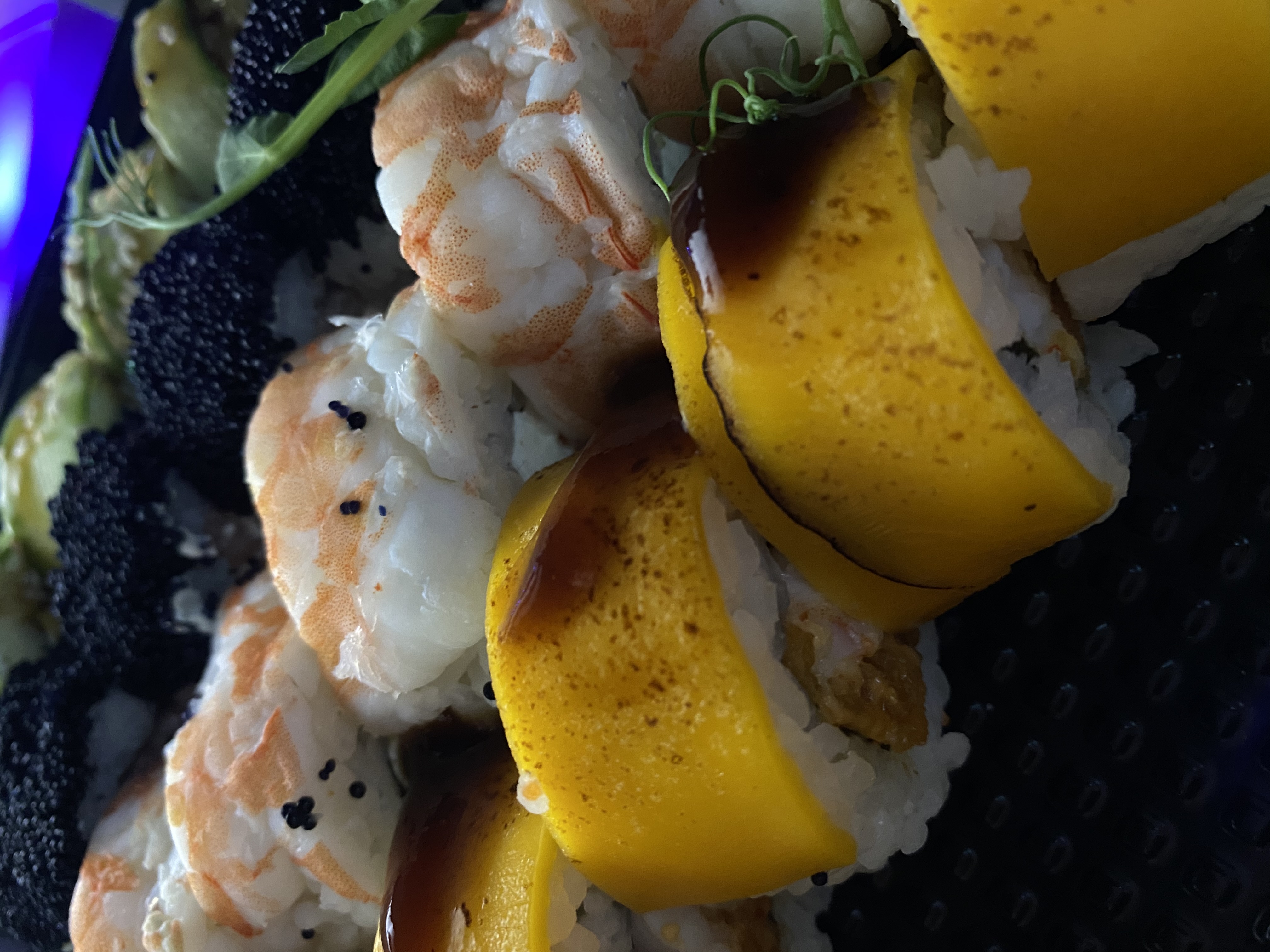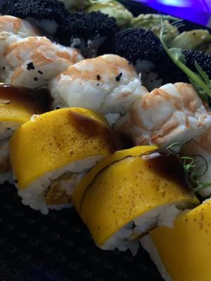 Состав: креветка, авокадо, манго, сливочный сыр, соус уорчестор, кунжутное масло, кунжут, сус кунжутный, петрушка