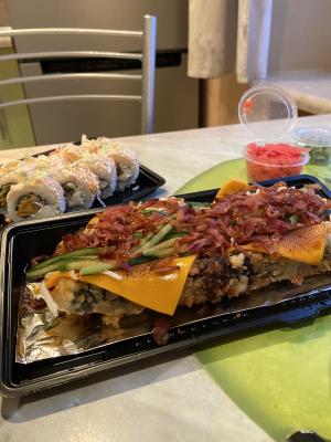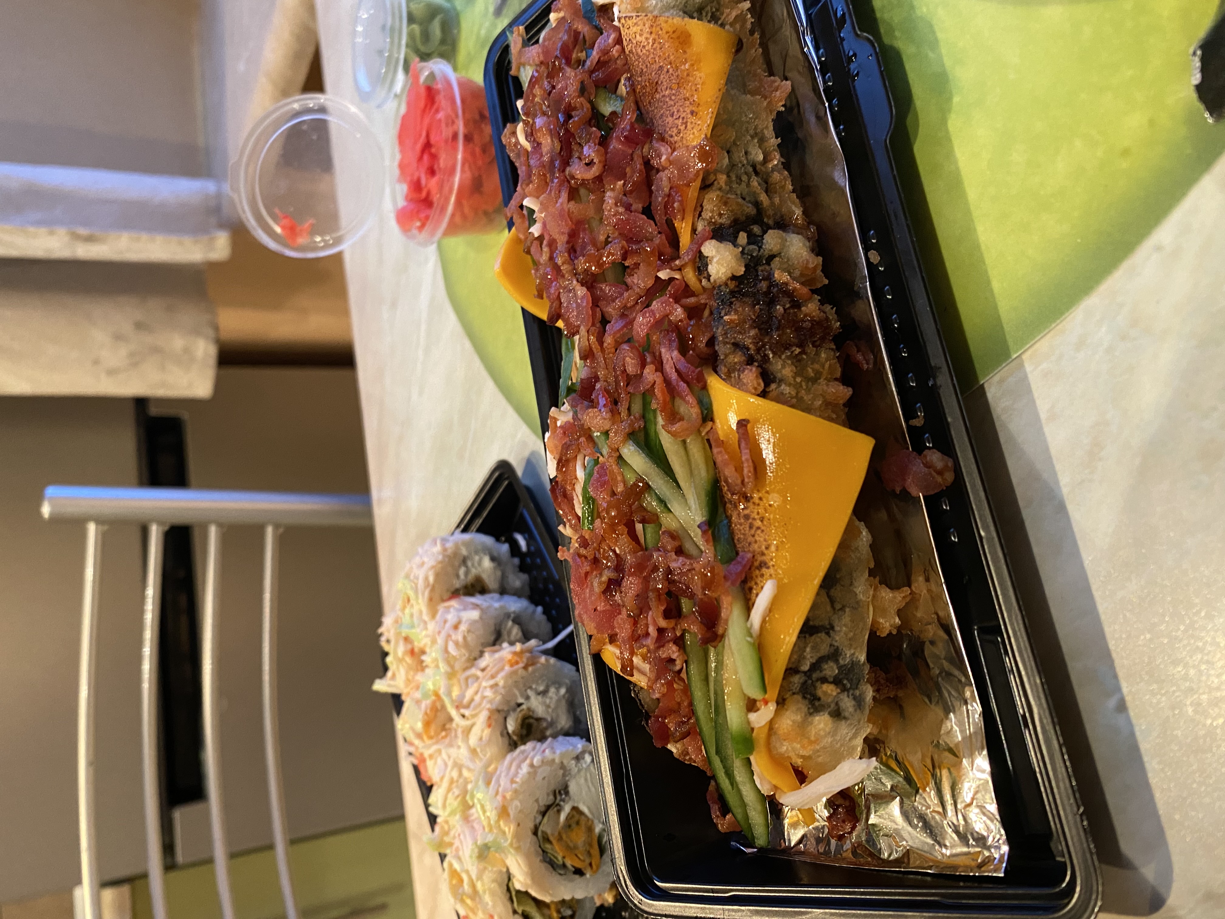Состав: краб микс, сыр чеддер, огурец, чипс бекона, сливочный сыр, соус терияки, кляр, сухари панко