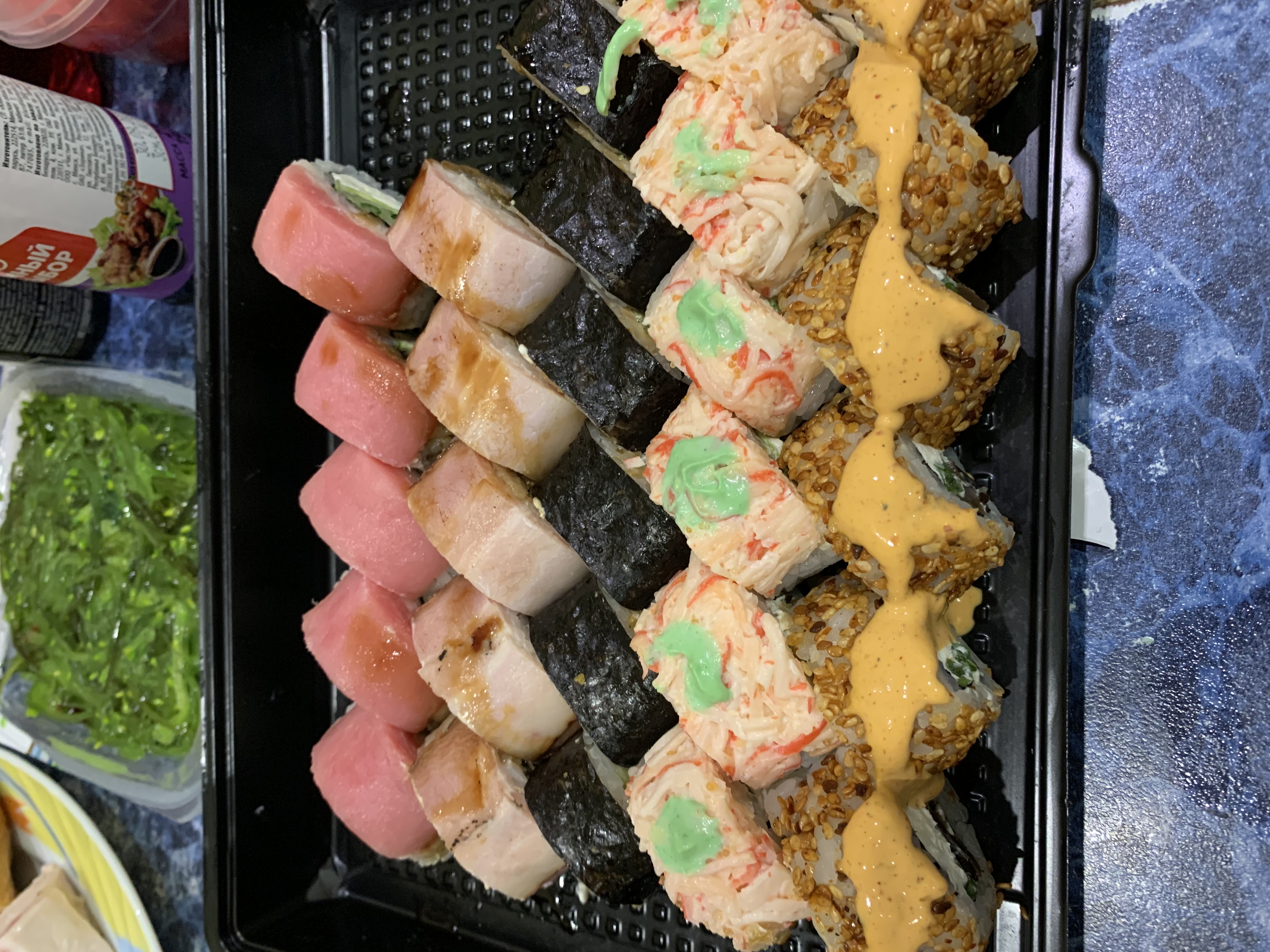 Состав: маринованные водоросли, нори, ореховый соус