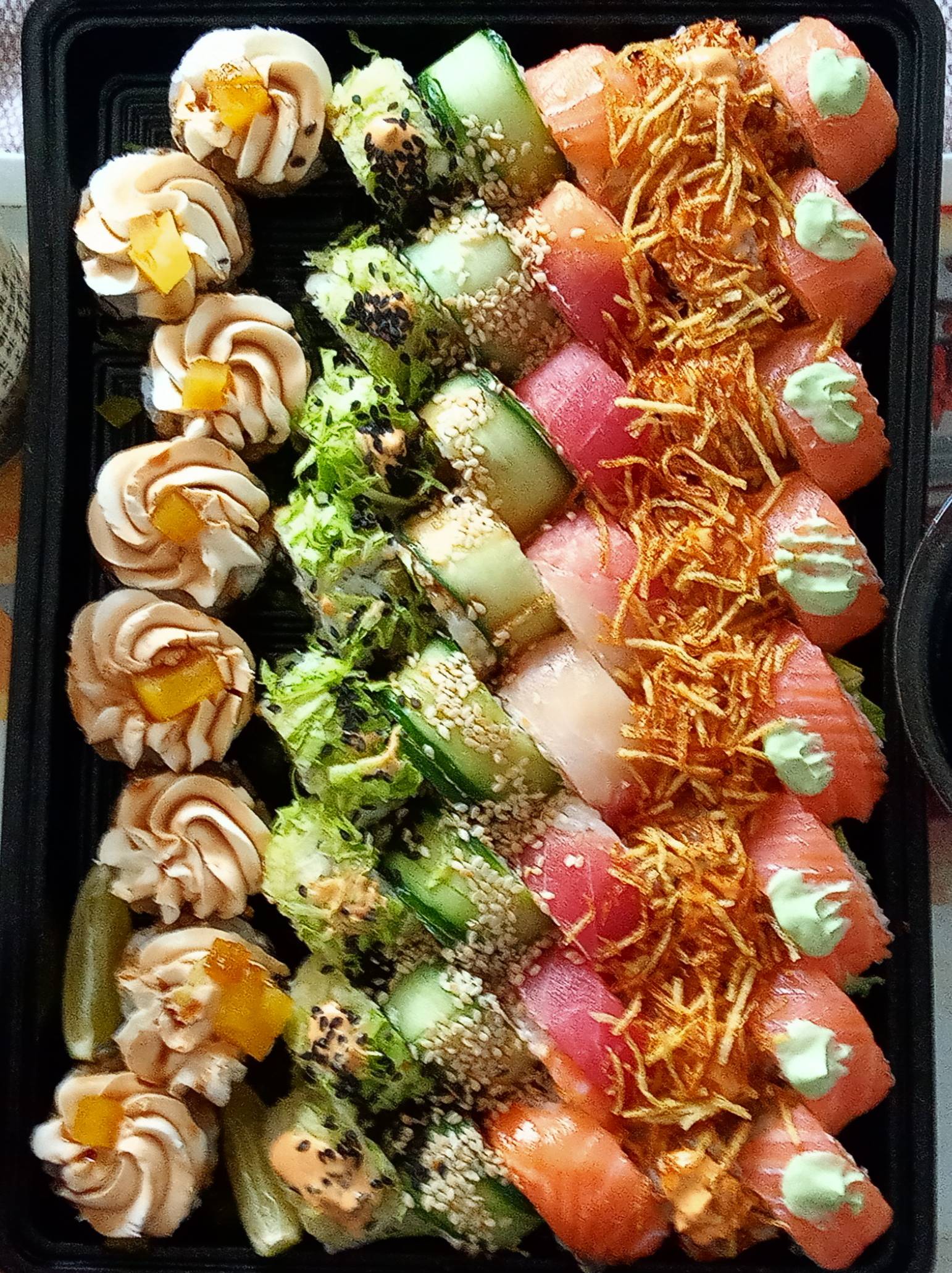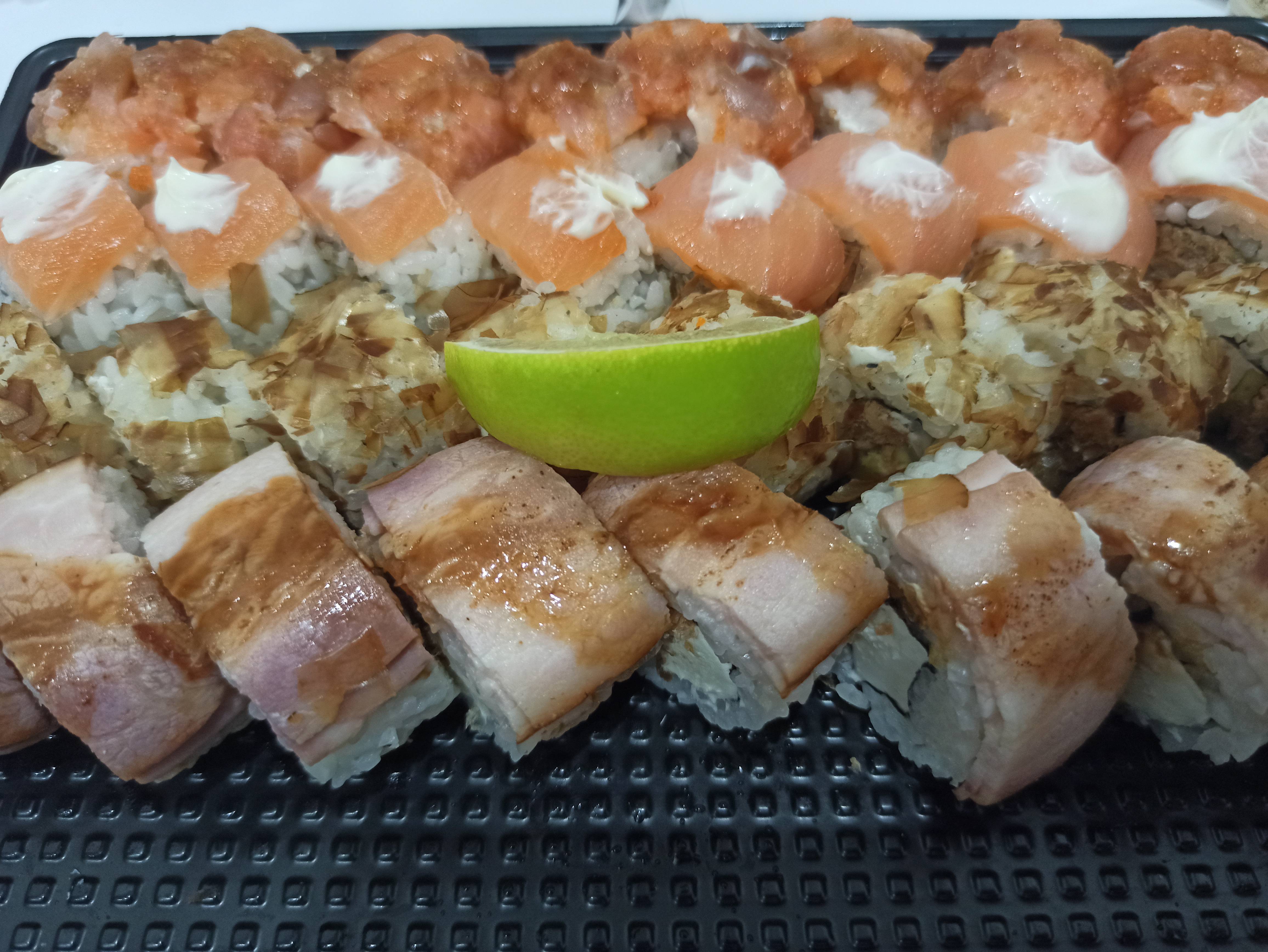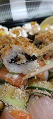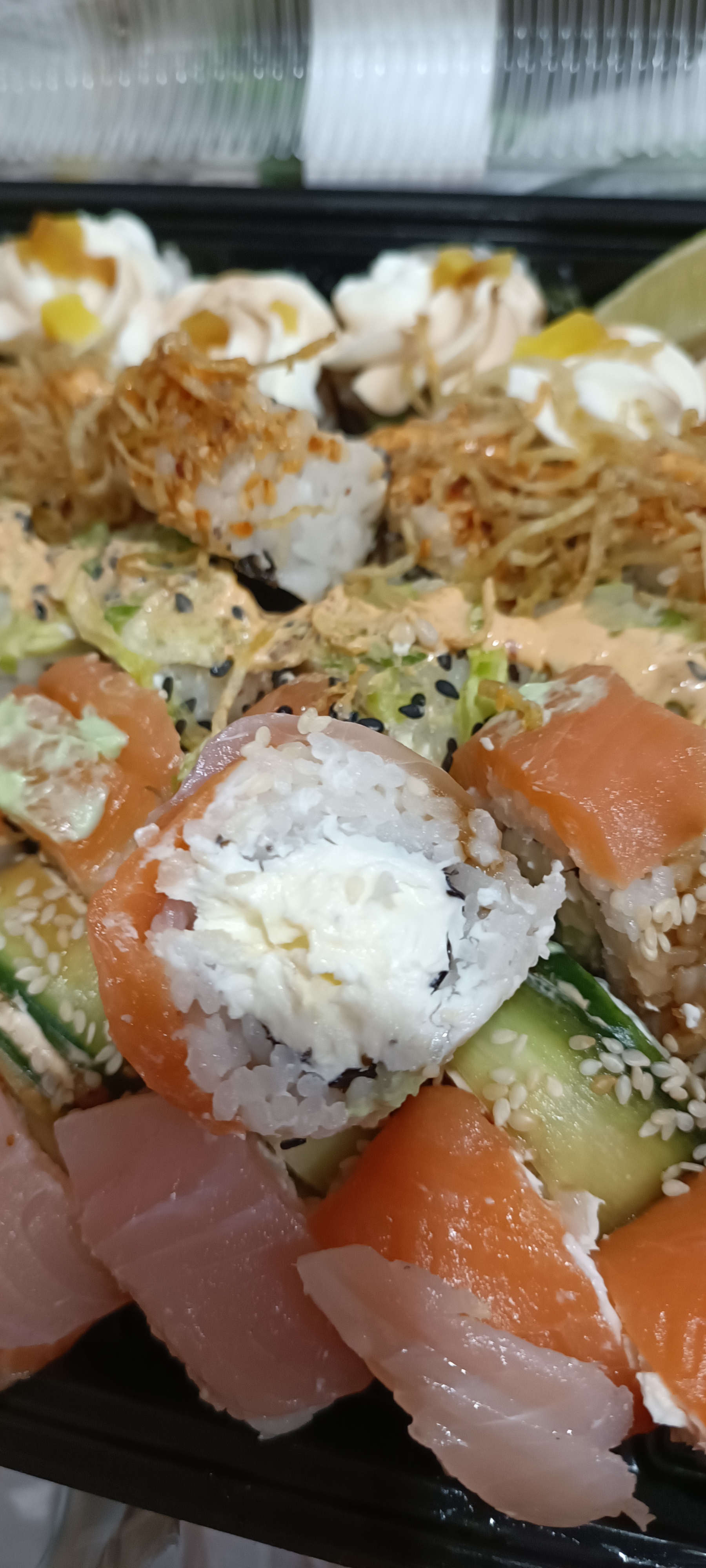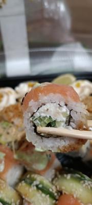 Состав: лосось, огурец, сливочный сыр, соус спайси, кунжут кимчи, соус терияки, кляр, сухари панко