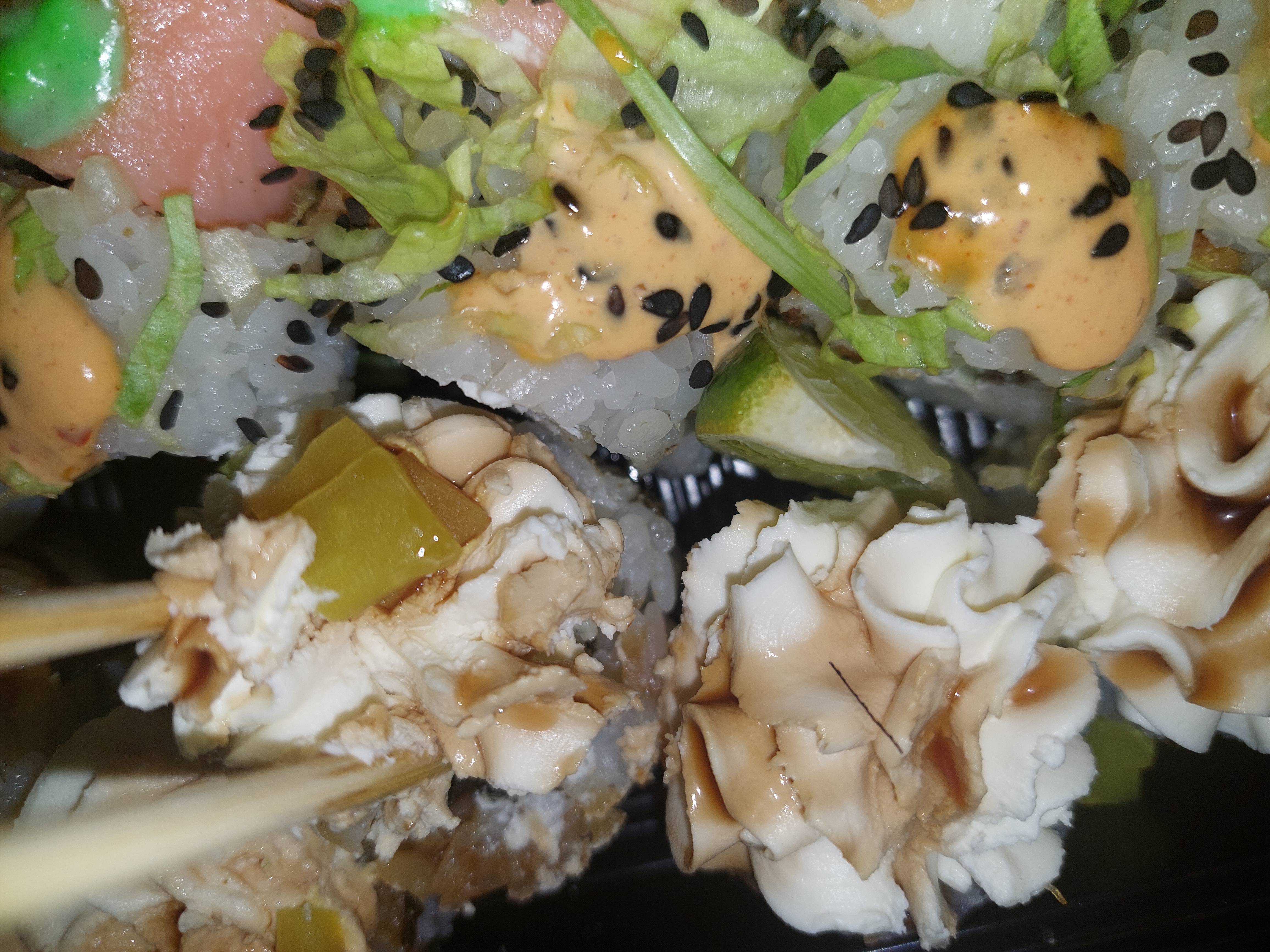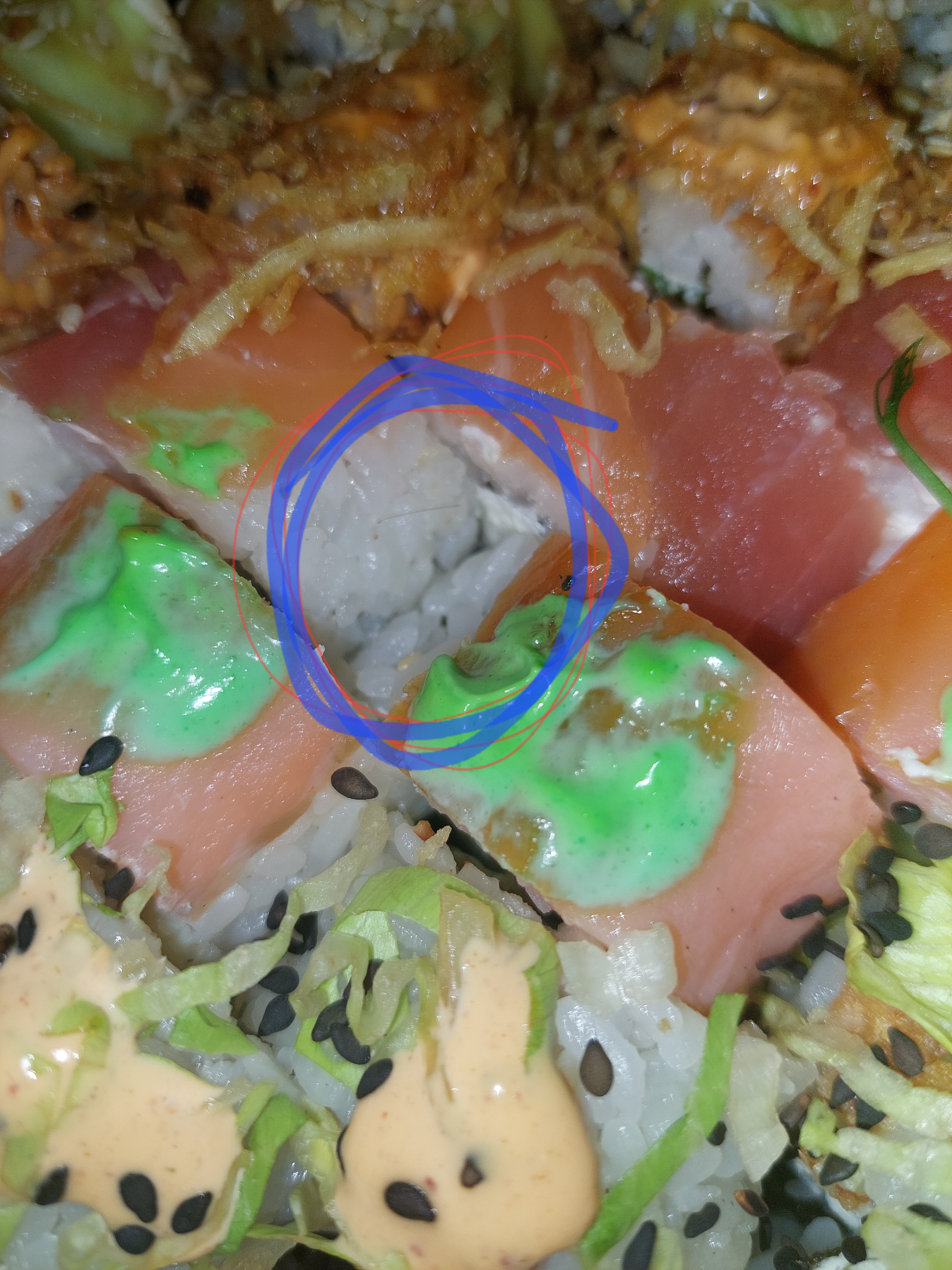 Состав: лосось, огурец, сливочный сыр, соус спайси, кунжут кимчи, соус терияки, кляр, сухари панко