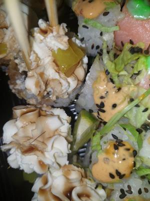 Состав: сунец, авокадо, сливочный сыр, кунжутное масло, картофель пай, соус терияки, кляр, сухари панко