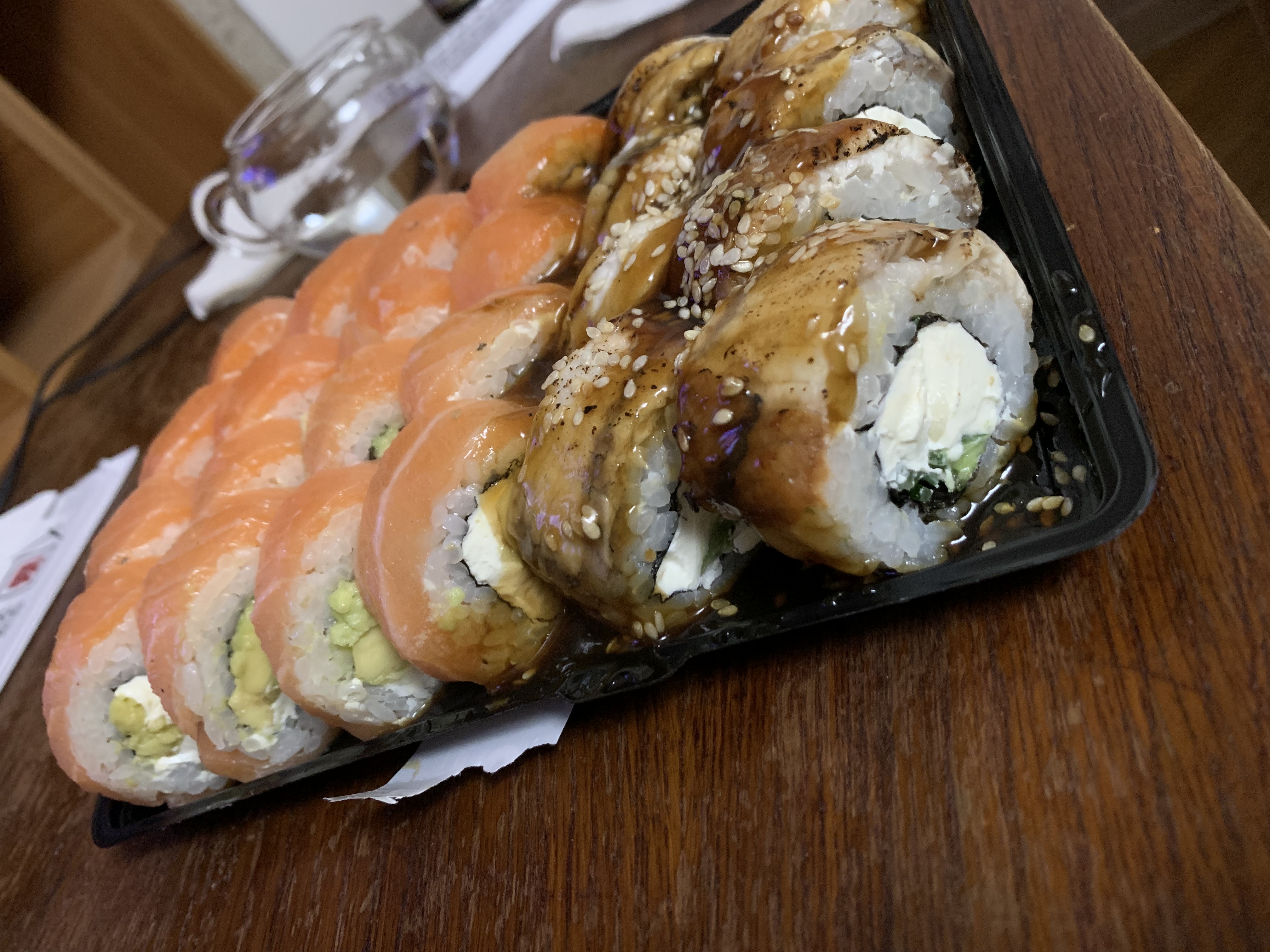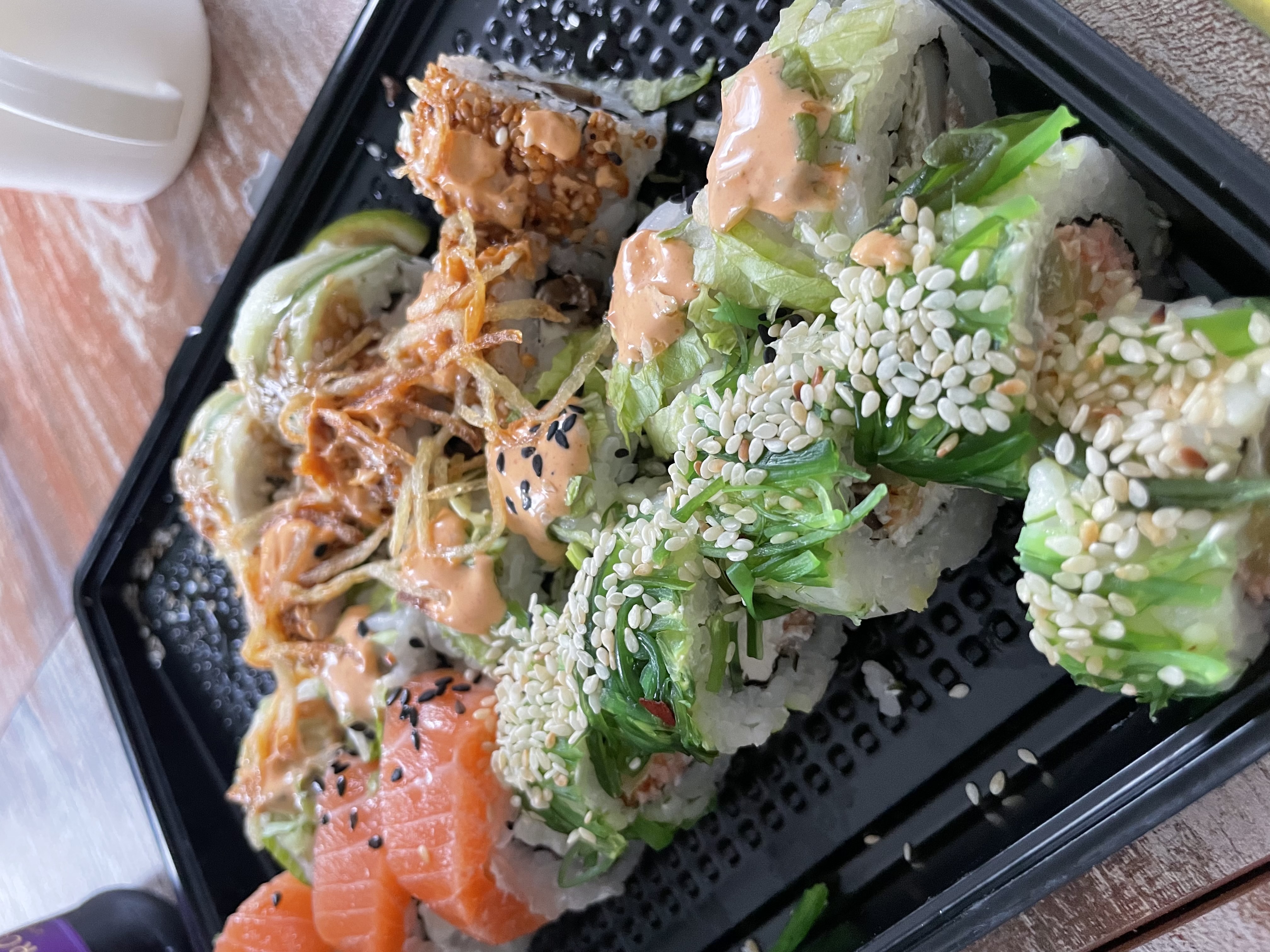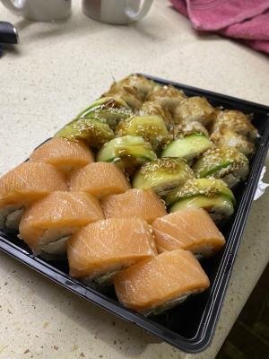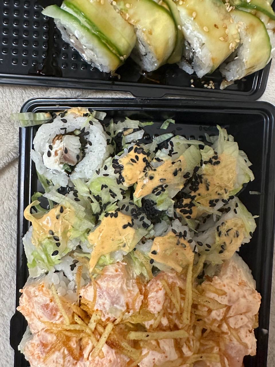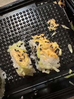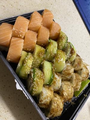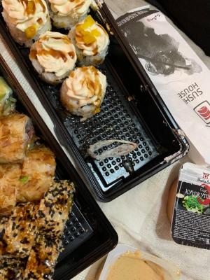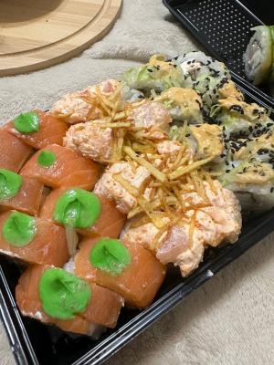 Суши вкусные, но какие-то destroyed пришли🥲 Разваливаются по контейнеру... И мне не положили салфетки и палочки.