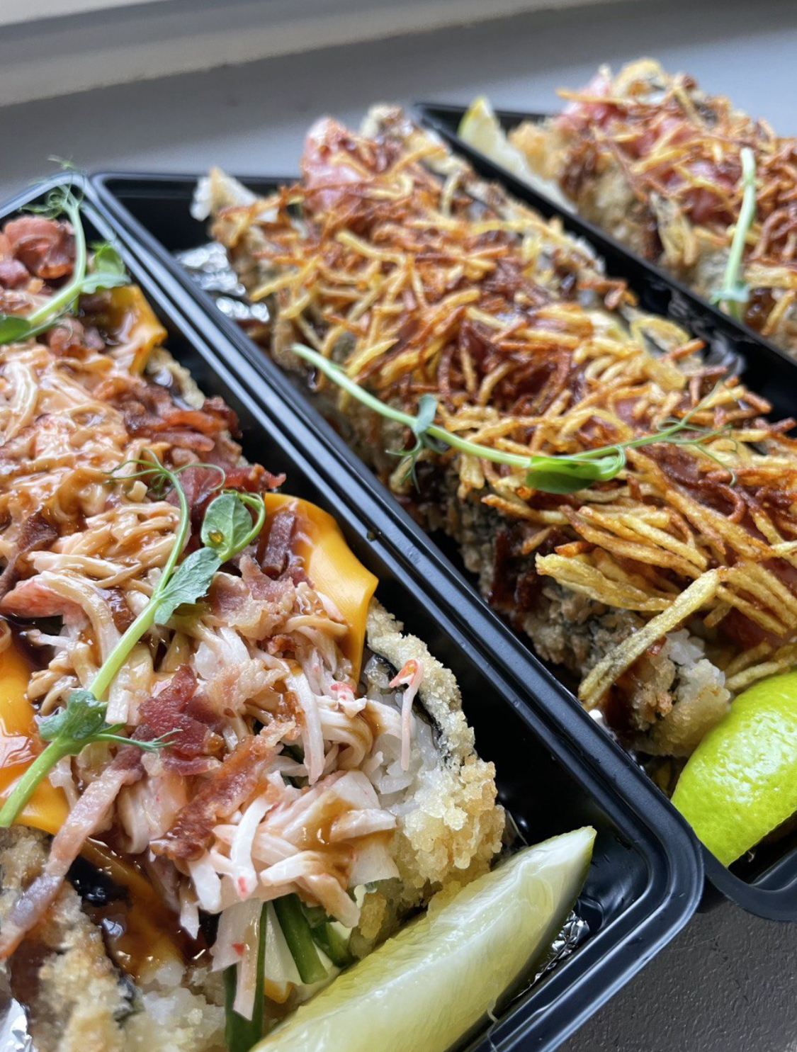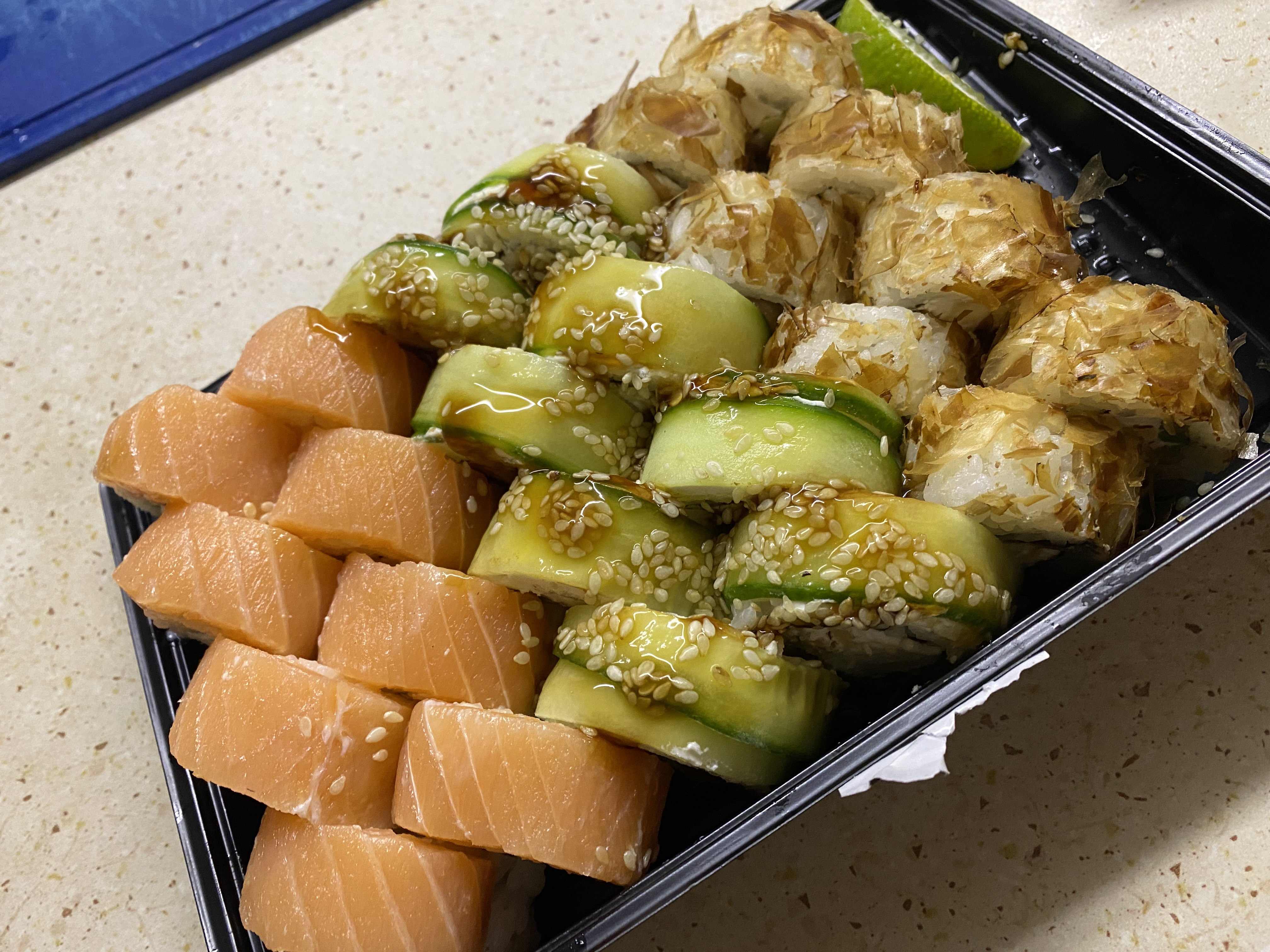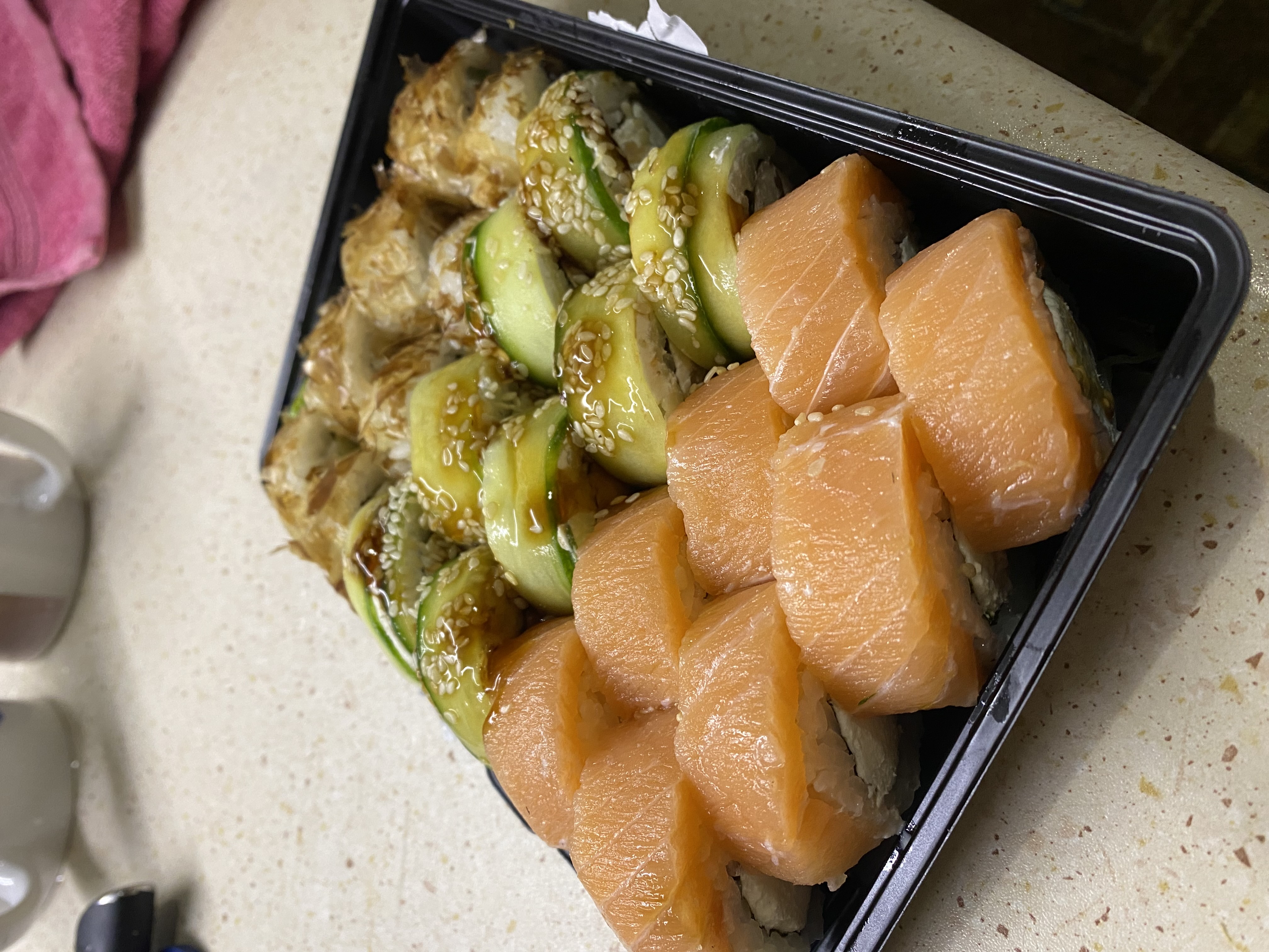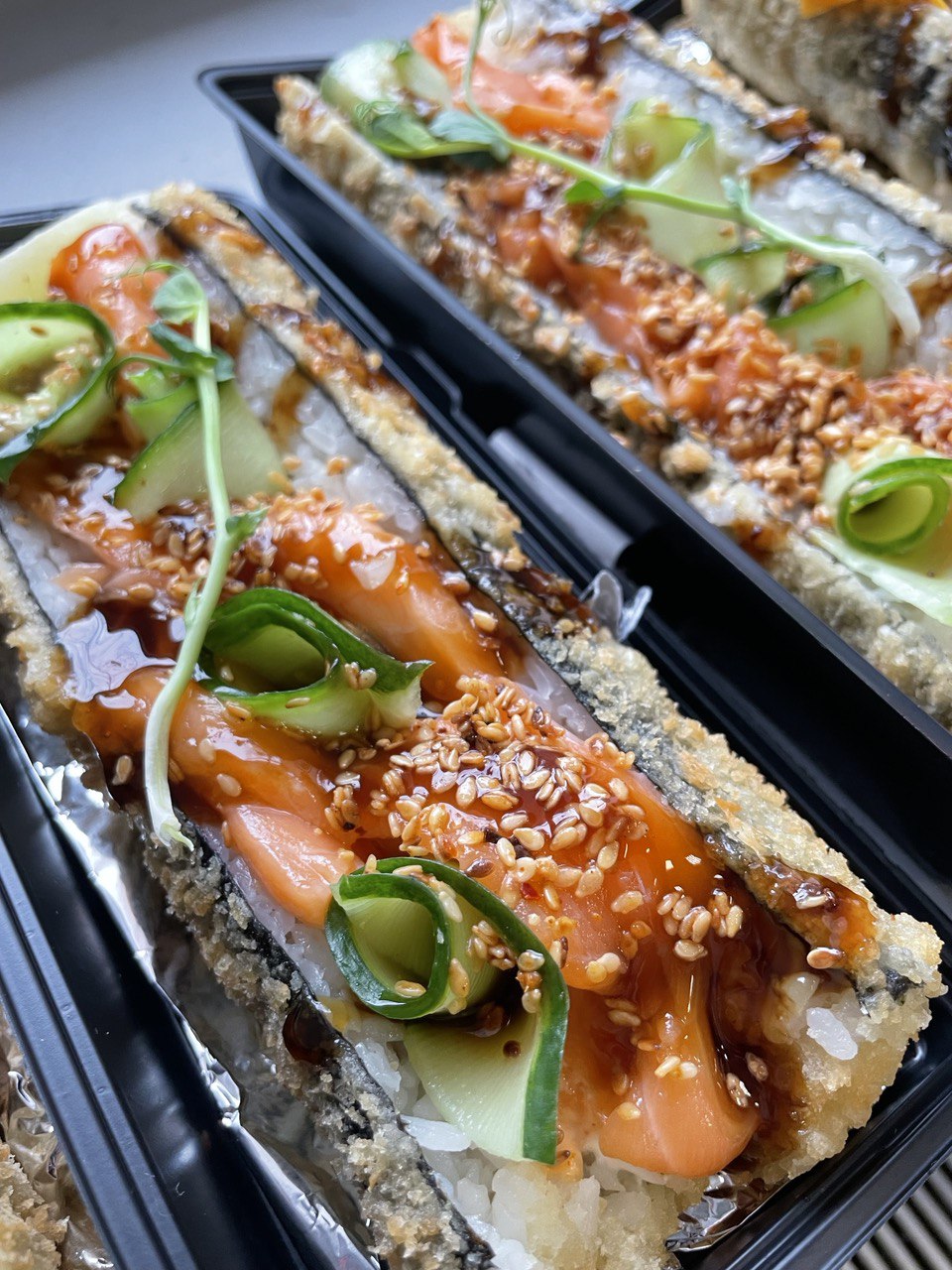Суши вкусные, но какие-то destroyed пришли🥲 Разваливаются по контейнеру... И мне не положили салфетки и палочки.