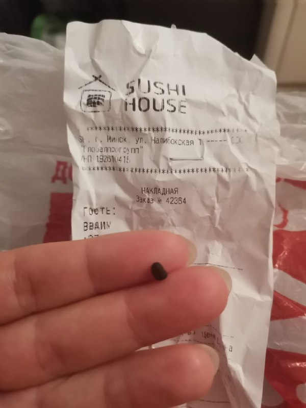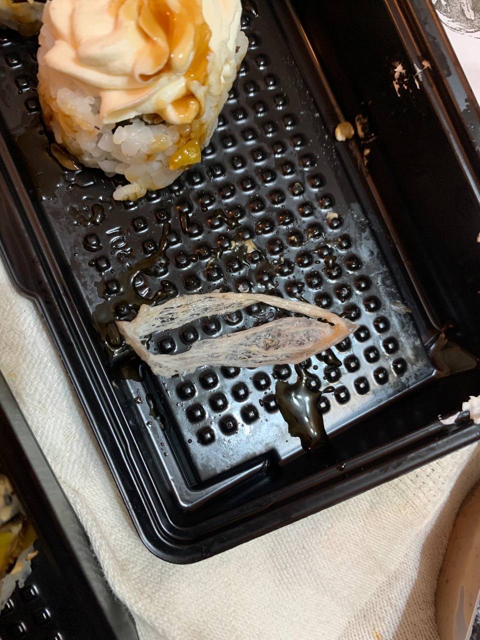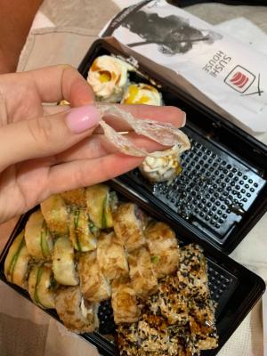 Далее во время поедания суши я обнаружил в суши кусок целлофана !!!!